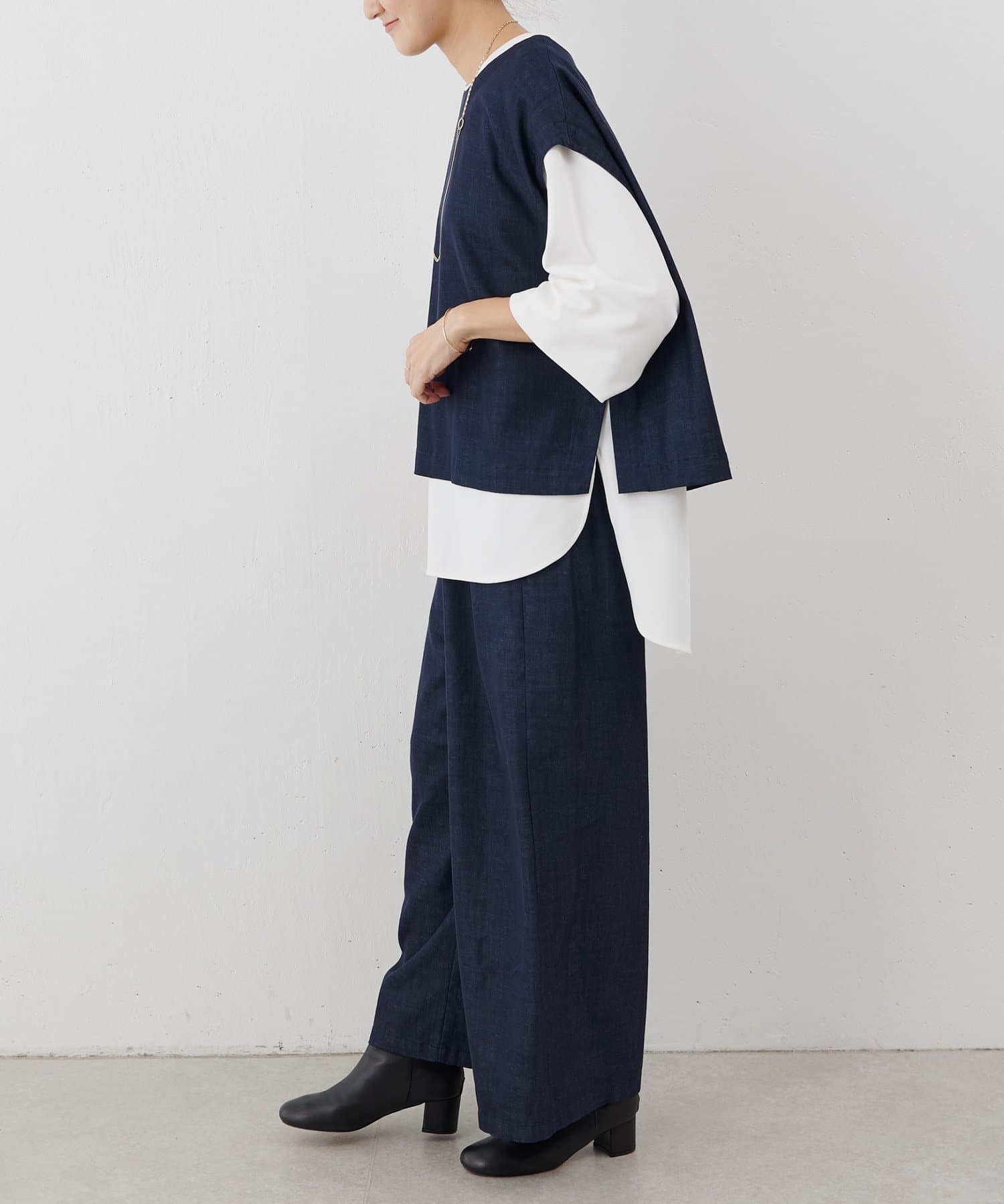購入場所:店舗ベストと、セットアップで購入。店員さんがはいていて、トロンっとした落ち間がかわいかったのと、手入れが簡単でしわにもならないし、インディゴは、合わせやすいから絶対おススメと言われて購入しましたが、その通りでした!何にでも合うし、らくだし、洗濯してもシワにならない!ついこればかりはいてしまいます!