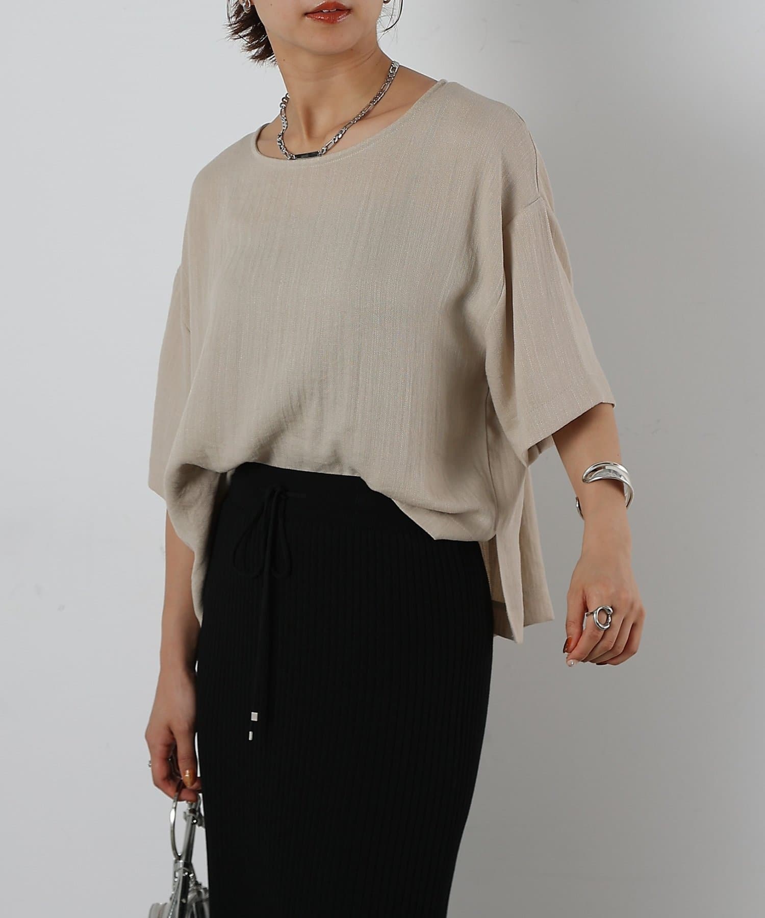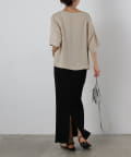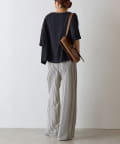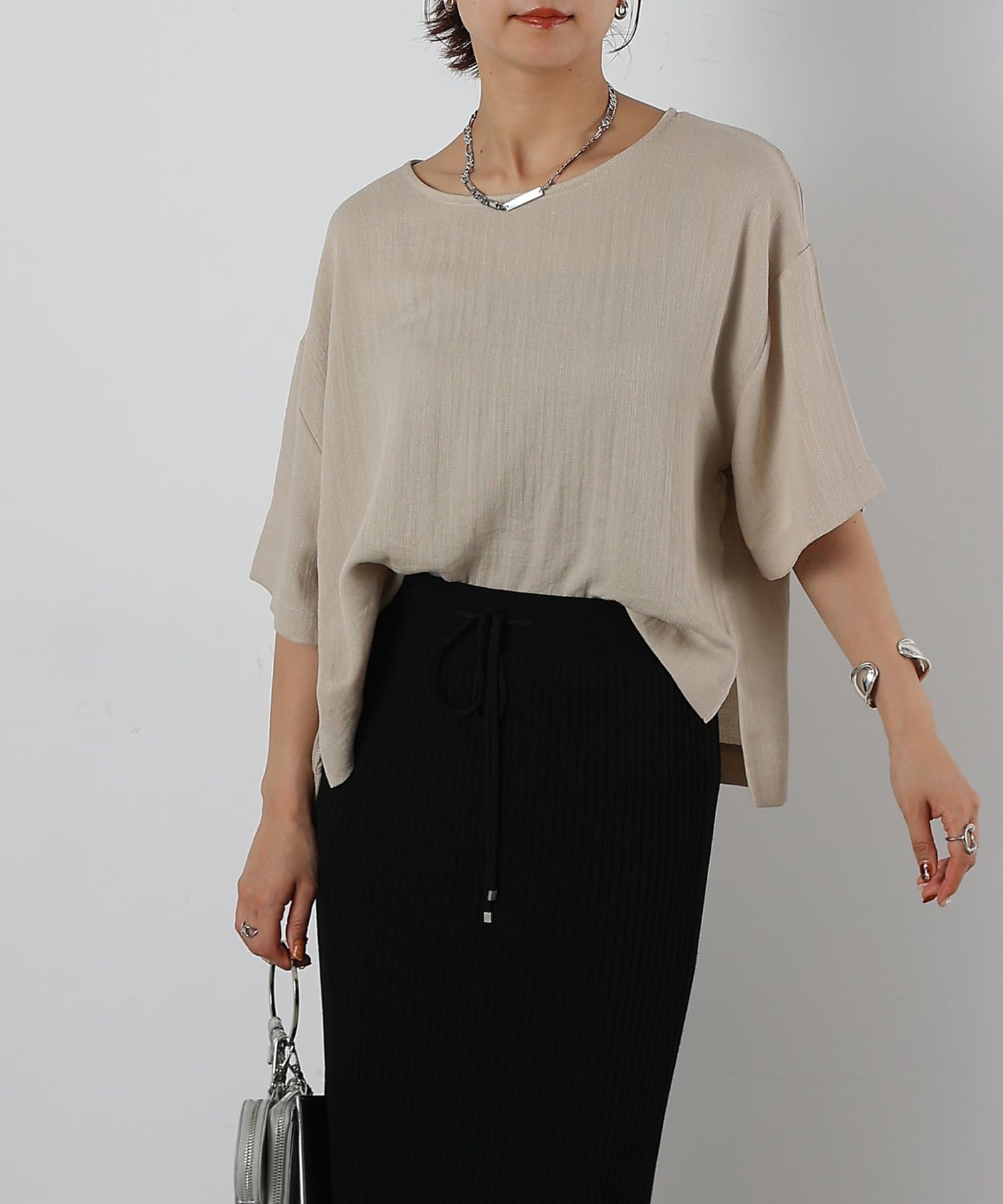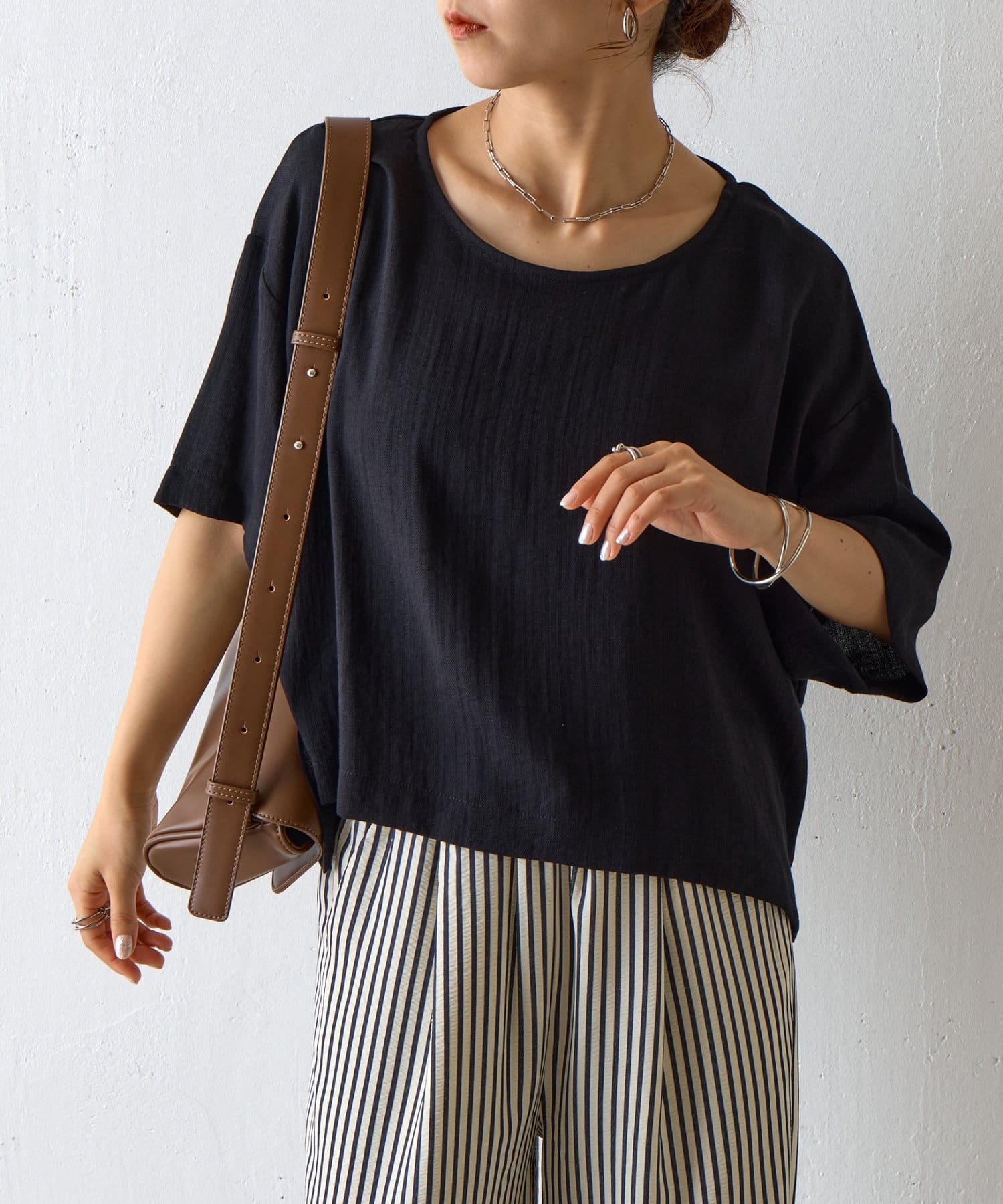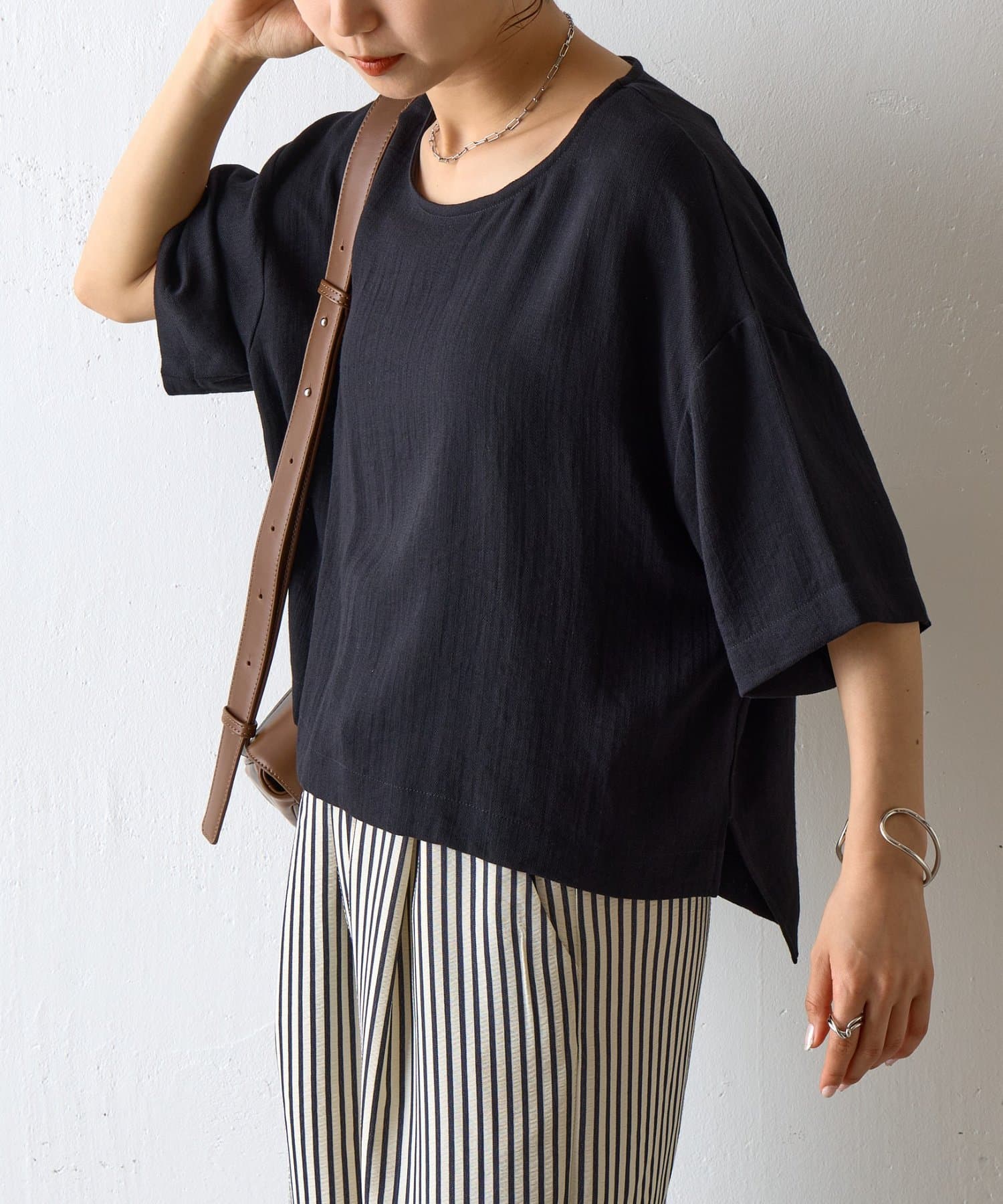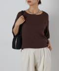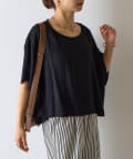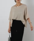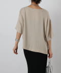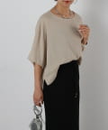 首元は程よく空いたクルーネックなのでデコルテを美しく見せ、すっきりと華奢見えが叶うこだわりのデザイン。アクセサリーとの相性も抜群で、シンプルなネックレスから、トレンドのチェーンネックレスまで、どんなアイテムとも好相性です。ゆったりとしたシルエットで、気になる体型をふんわりカバーしてくれるのも嬉しいポイント◎締め付け感のない着心地で、リラックスした時間を過ごせます。同素材のボトムスとセットアップで合わせれば、こなれ感のある大人カジュアルが完成。表面感があるので見た目にも涼し気に仕上げてくれる、これからの季節に大活躍間違いなしの1枚。