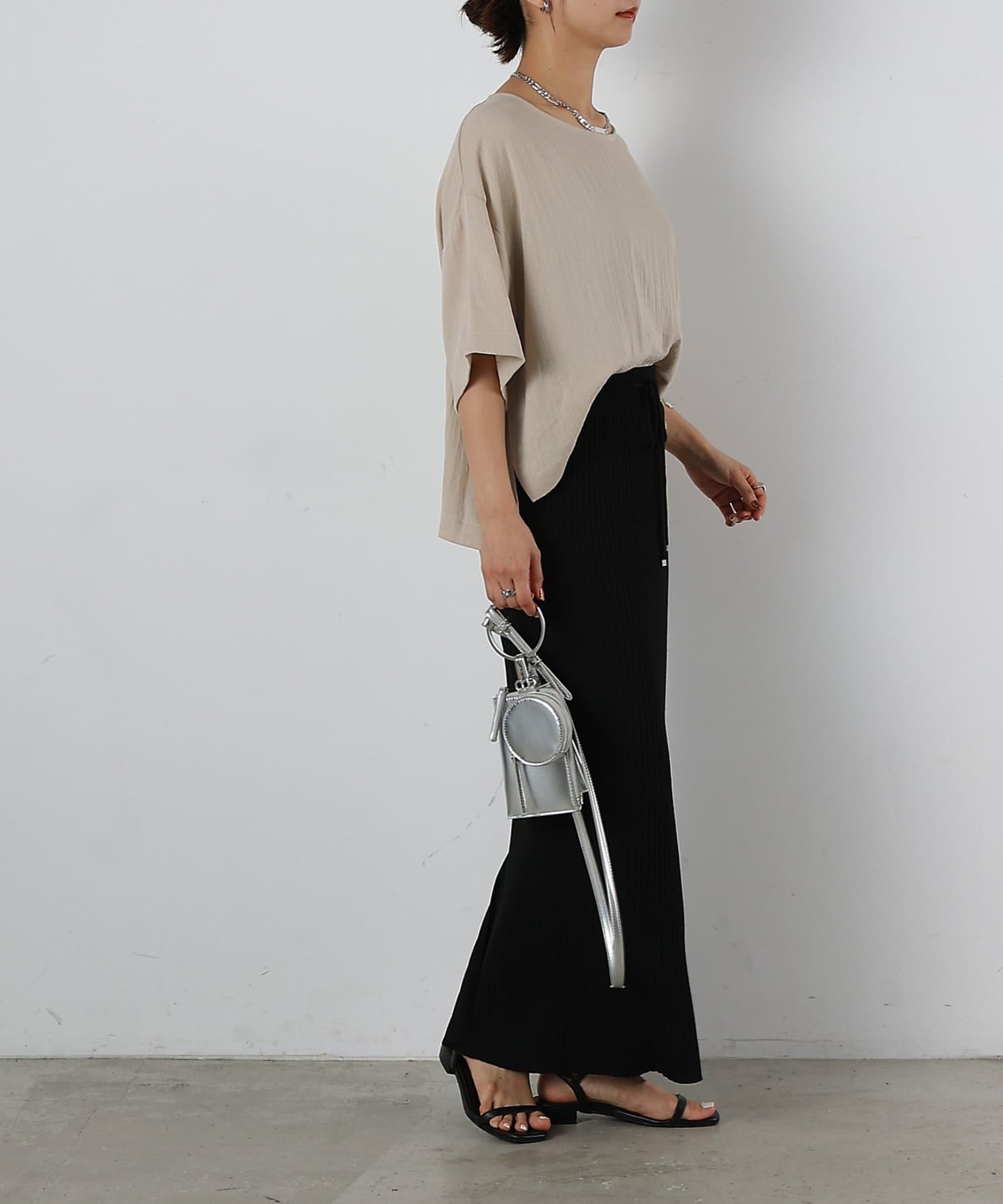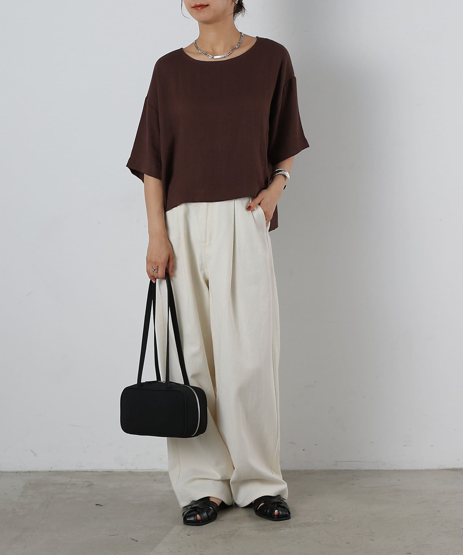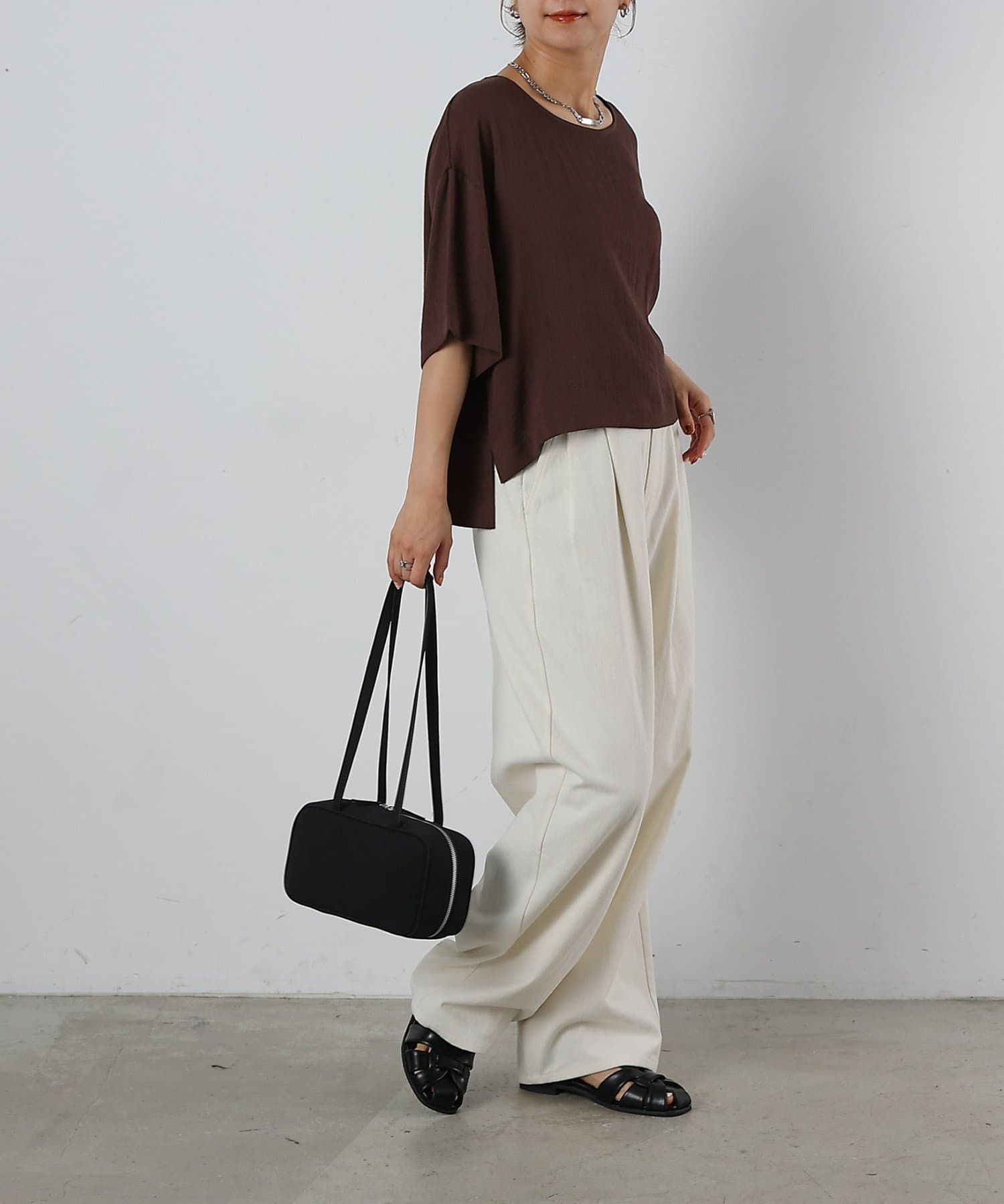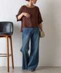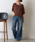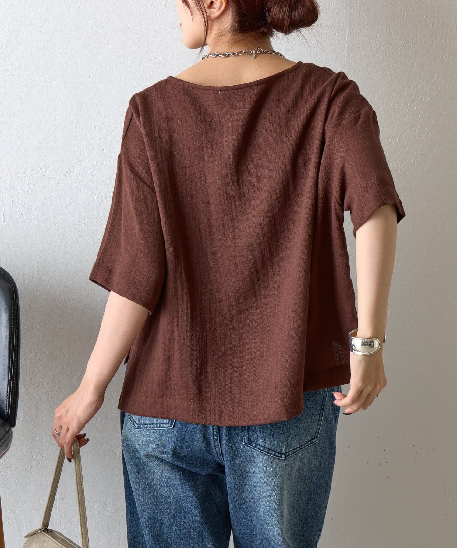 首元は程よく空いたクルーネックなのでデコルテを美しく見せ、すっきりと華奢見えが叶うこだわりのデザイン。アクセサリーとの相性も抜群で、シンプルなネックレスから、トレンドのチェーンネックレスまで、どんなアイテムとも好相性です。ゆったりとしたシルエットで、気になる体型をふんわりカバーしてくれるのも嬉しいポイント◎締め付け感のない着心地で、リラックスした時間を過ごせます。同素材のボトムスとセットアップで合わせれば、こなれ感のある大人カジュアルが完成。表面感があるので見た目にも涼し気に仕上げてくれる、これからの季節に大活躍間違いなしの1枚。