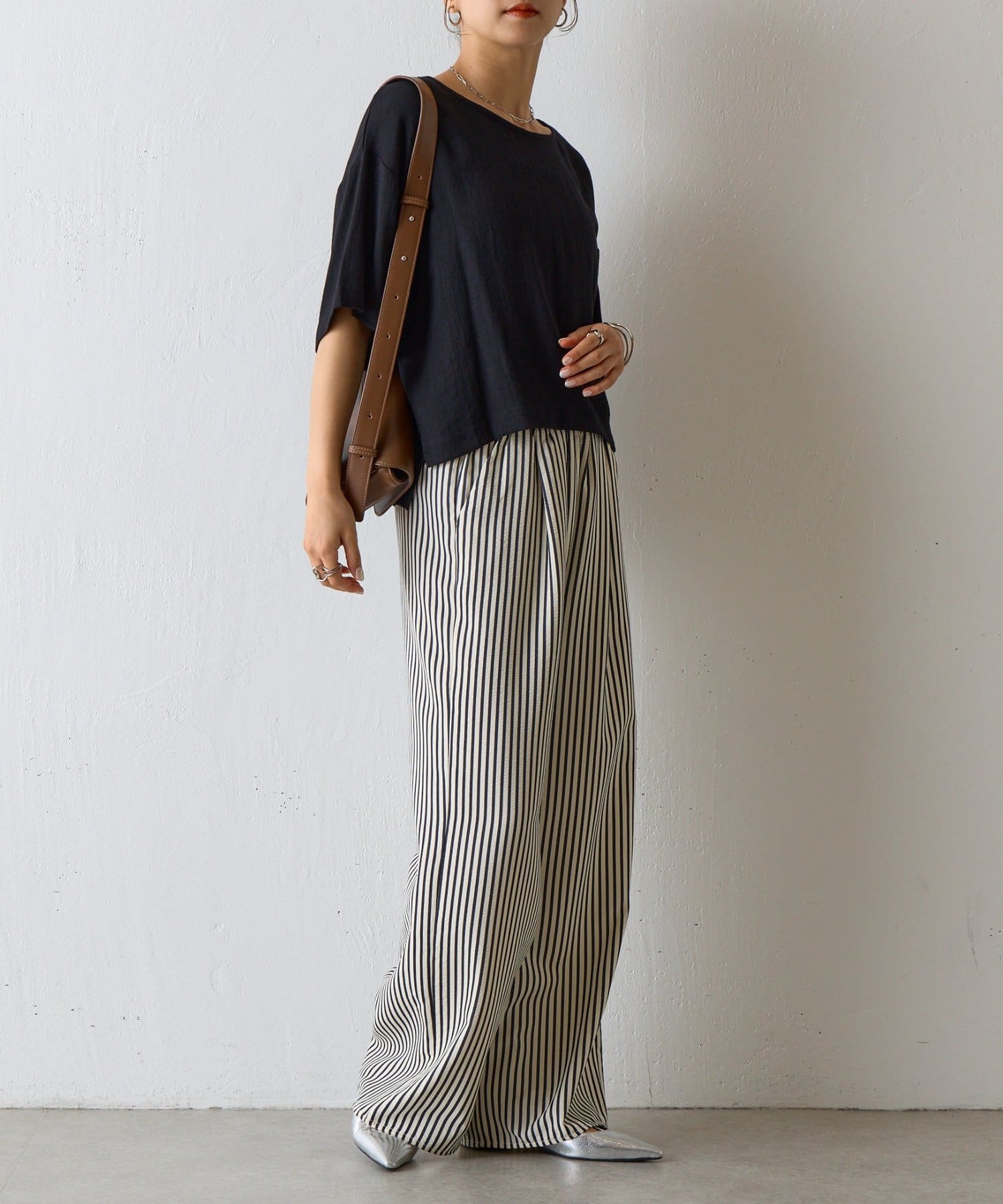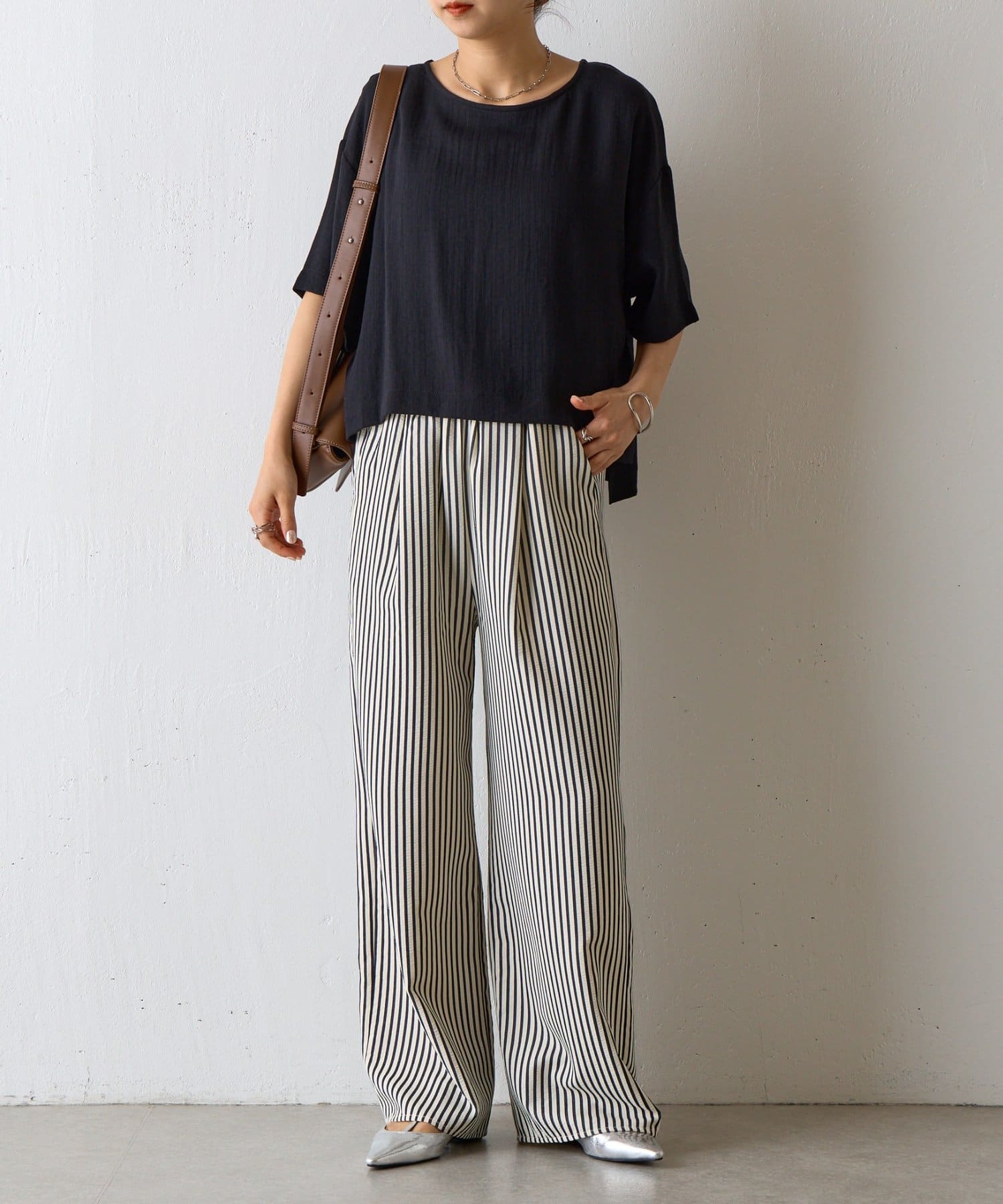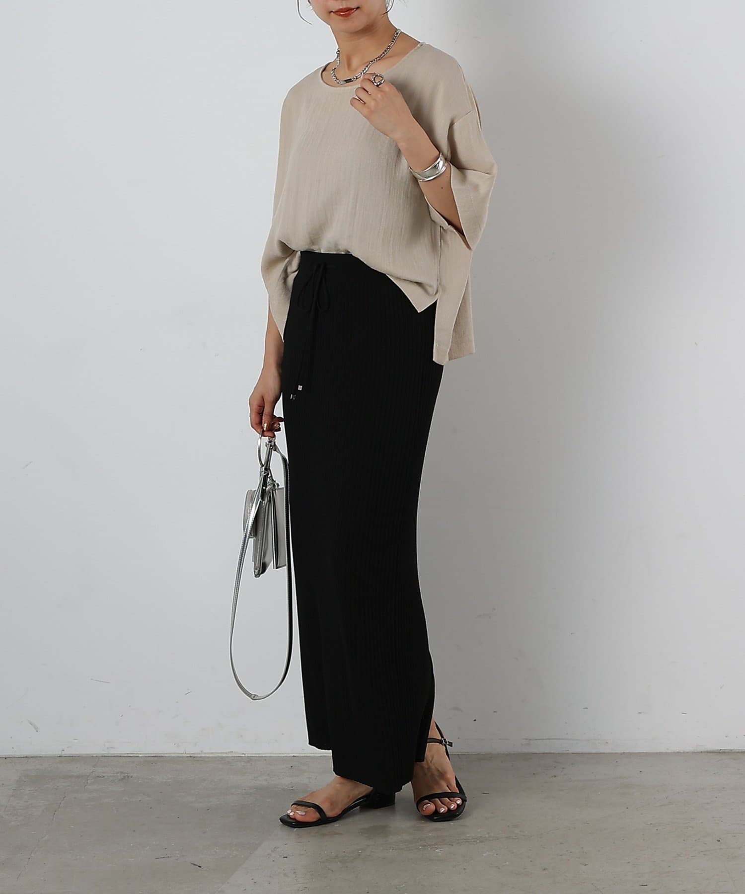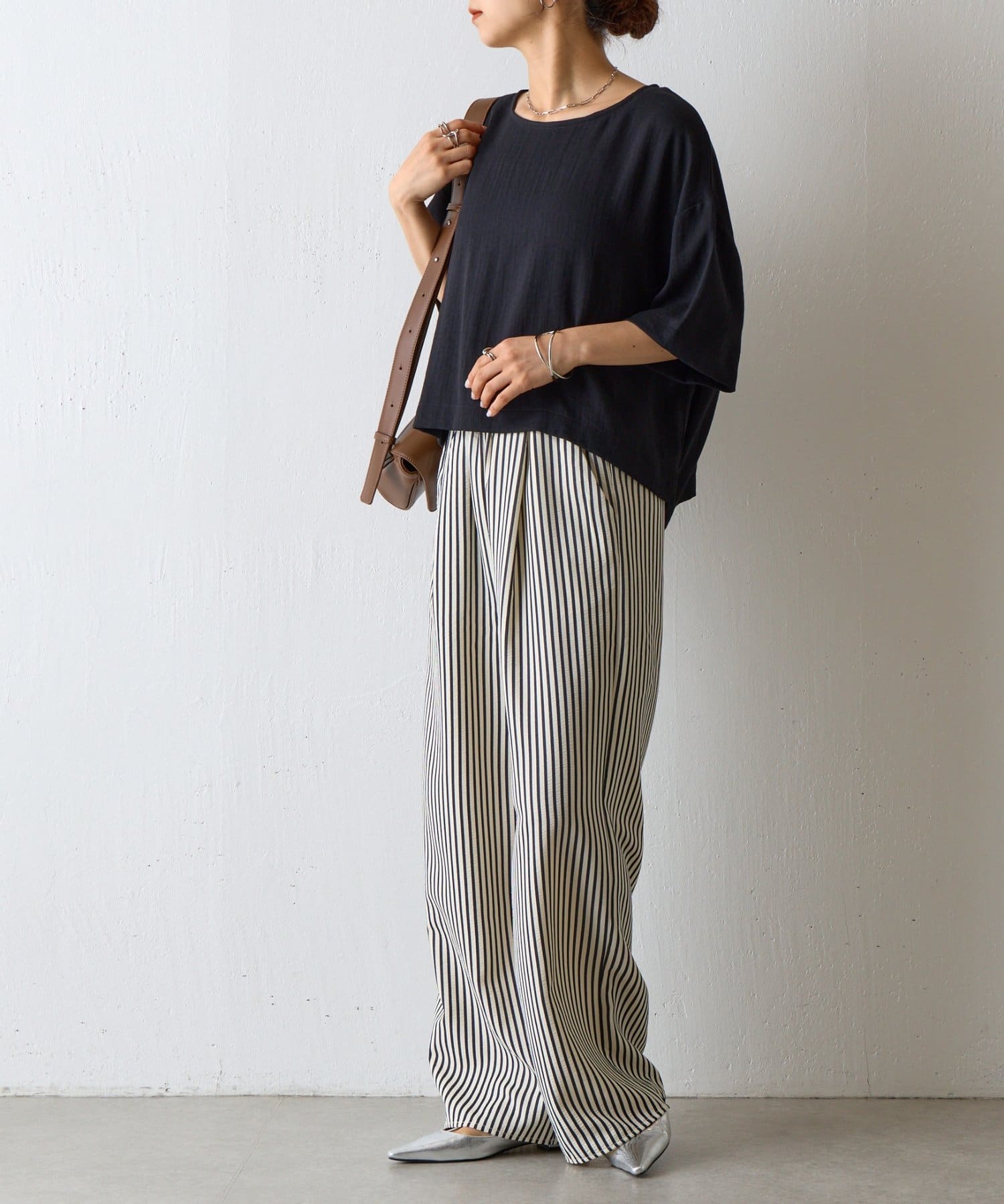 首元は程よく空いたクルーネックなのでデコルテを美しく見せ、すっきりと華奢見えが叶うこだわりのデザイン。アクセサリーとの相性も抜群で、シンプルなネックレスから、トレンドのチェーンネックレスまで、どんなアイテムとも好相性です。ゆったりとしたシルエットで、気になる体型をふんわりカバーしてくれるのも嬉しいポイント◎締め付け感のない着心地で、リラックスした時間を過ごせます。同素材のボトムスとセットアップで合わせれば、こなれ感のある大人カジュアルが完成。表面感があるので見た目にも涼し気に仕上げてくれる、これからの季節に大活躍間違いなしの1枚。