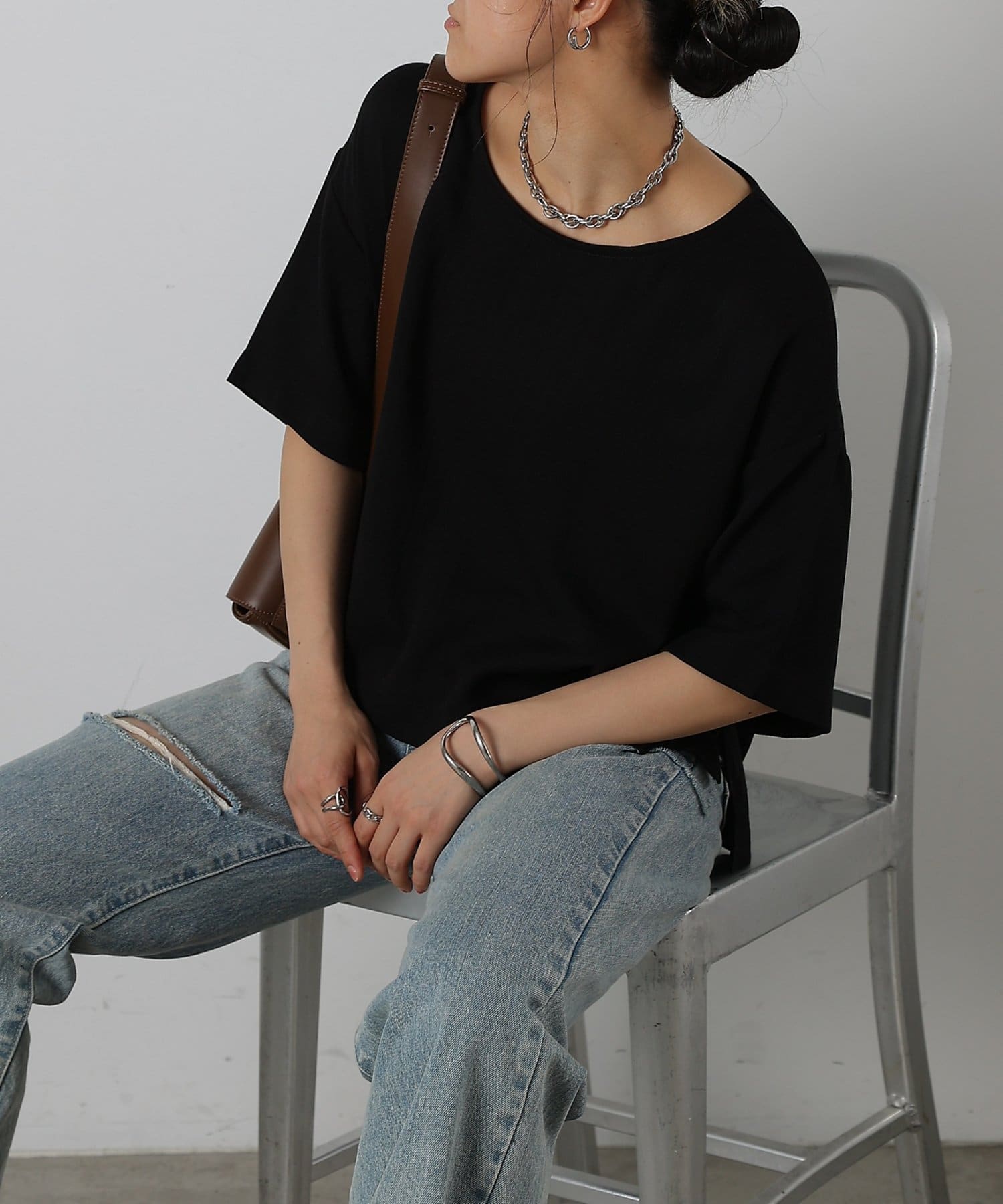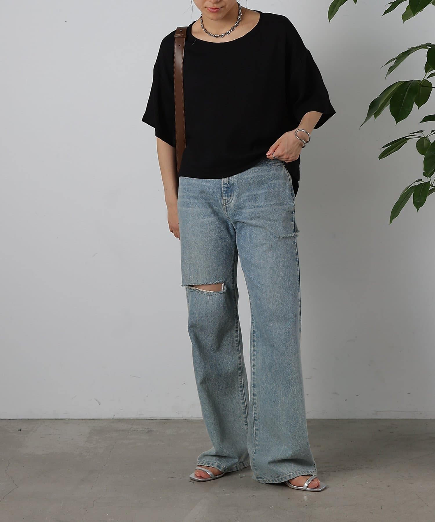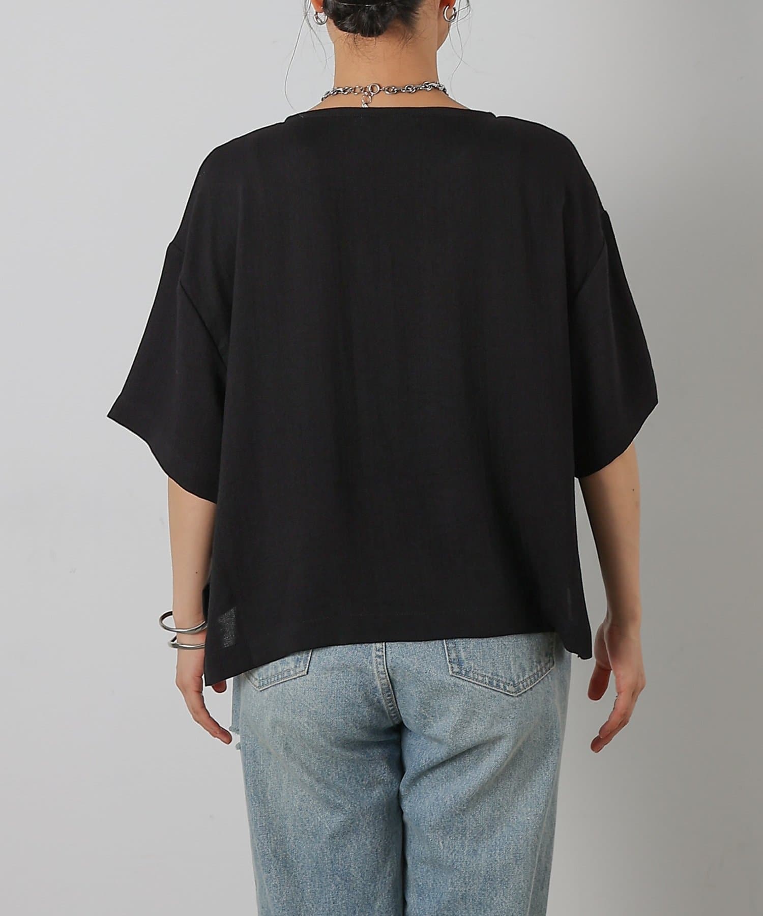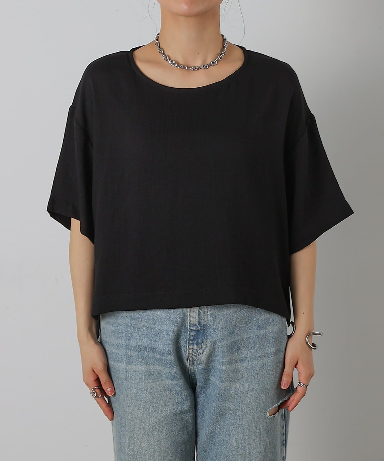 首元は程よく空いたクルーネックなのでデコルテを美しく見せ、すっきりと華奢見えが叶うこだわりのデザイン。アクセサリーとの相性も抜群で、シンプルなネックレスから、トレンドのチェーンネックレスまで、どんなアイテムとも好相性です。ゆったりとしたシルエットで、気になる体型をふんわりカバーしてくれるのも嬉しいポイント◎締め付け感のない着心地で、リラックスした時間を過ごせます。同素材のボトムスとセットアップで合わせれば、こなれ感のある大人カジュアルが完成。表面感があるので見た目にも涼し気に仕上げてくれる、これからの季節に大活躍間違いなしの1枚。