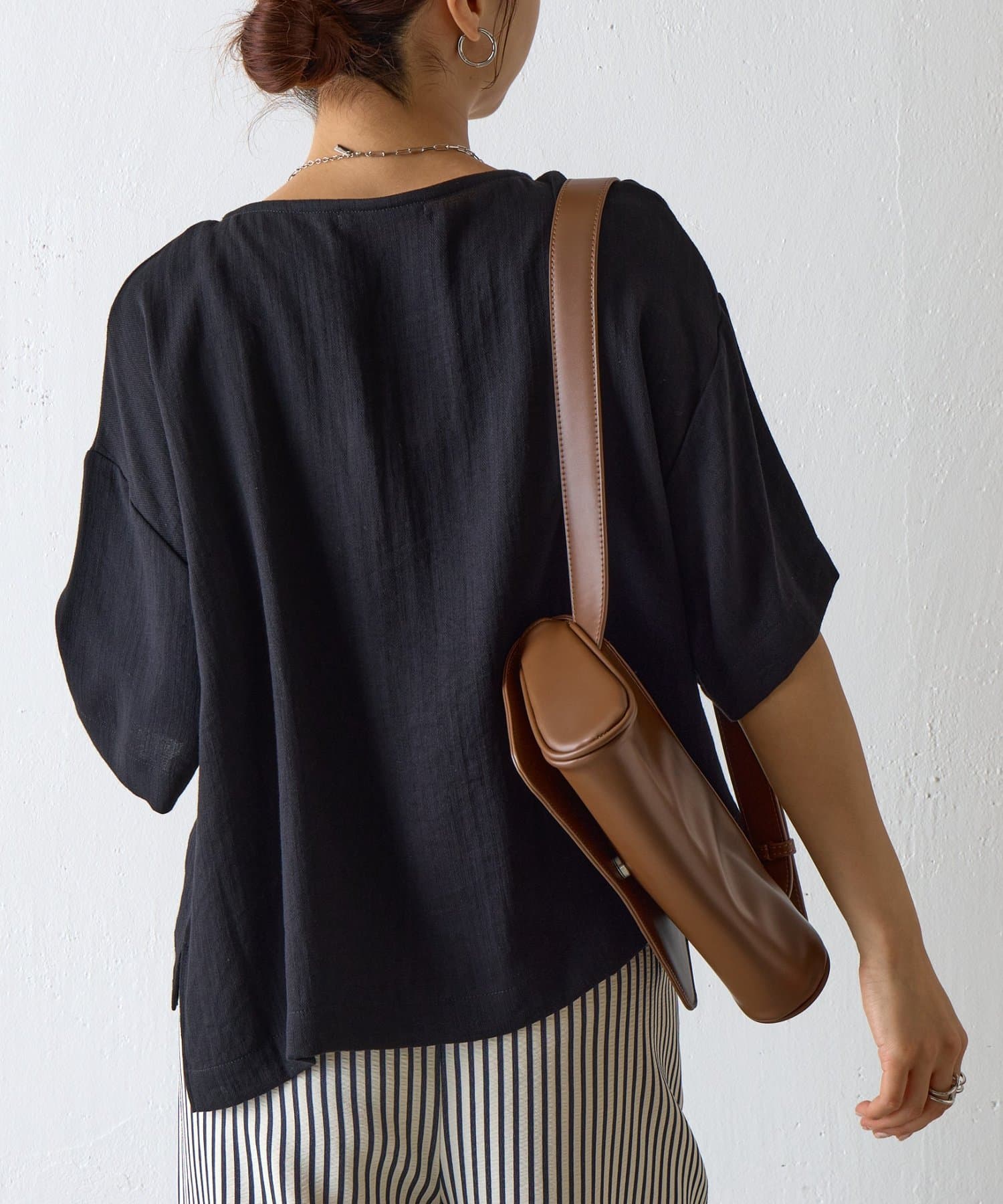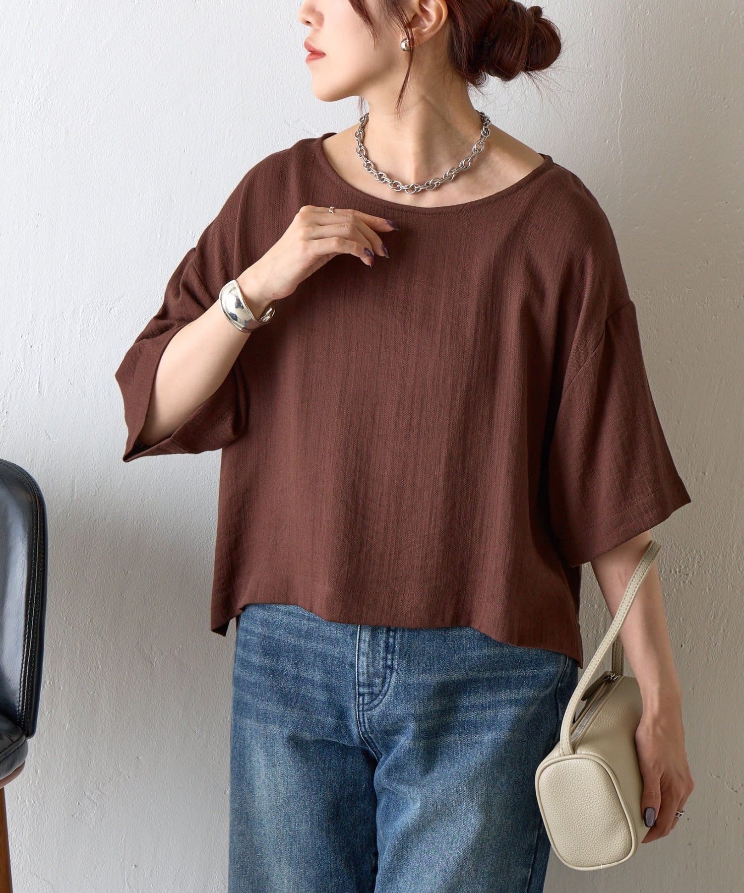 リネンのような風合いで、涼しげでナチュラルな印象を与えるこなれトップスが登場。まるでリネンのようなナチュラルな風合いを持ちながら、レーヨンとナイロンの混紡素材でしなやかで上品な印象に。