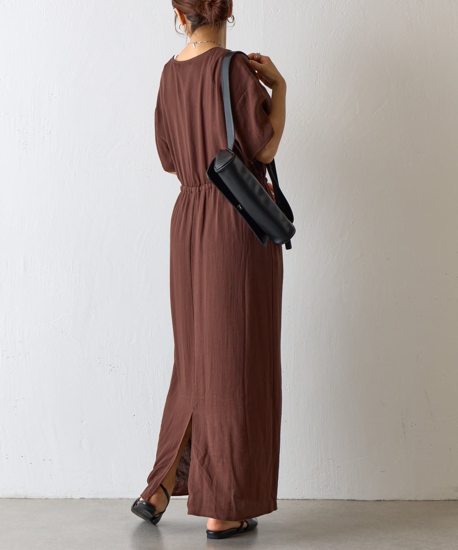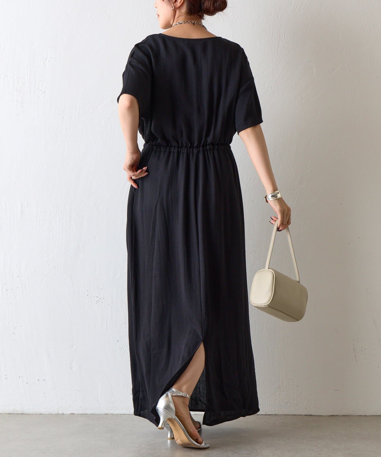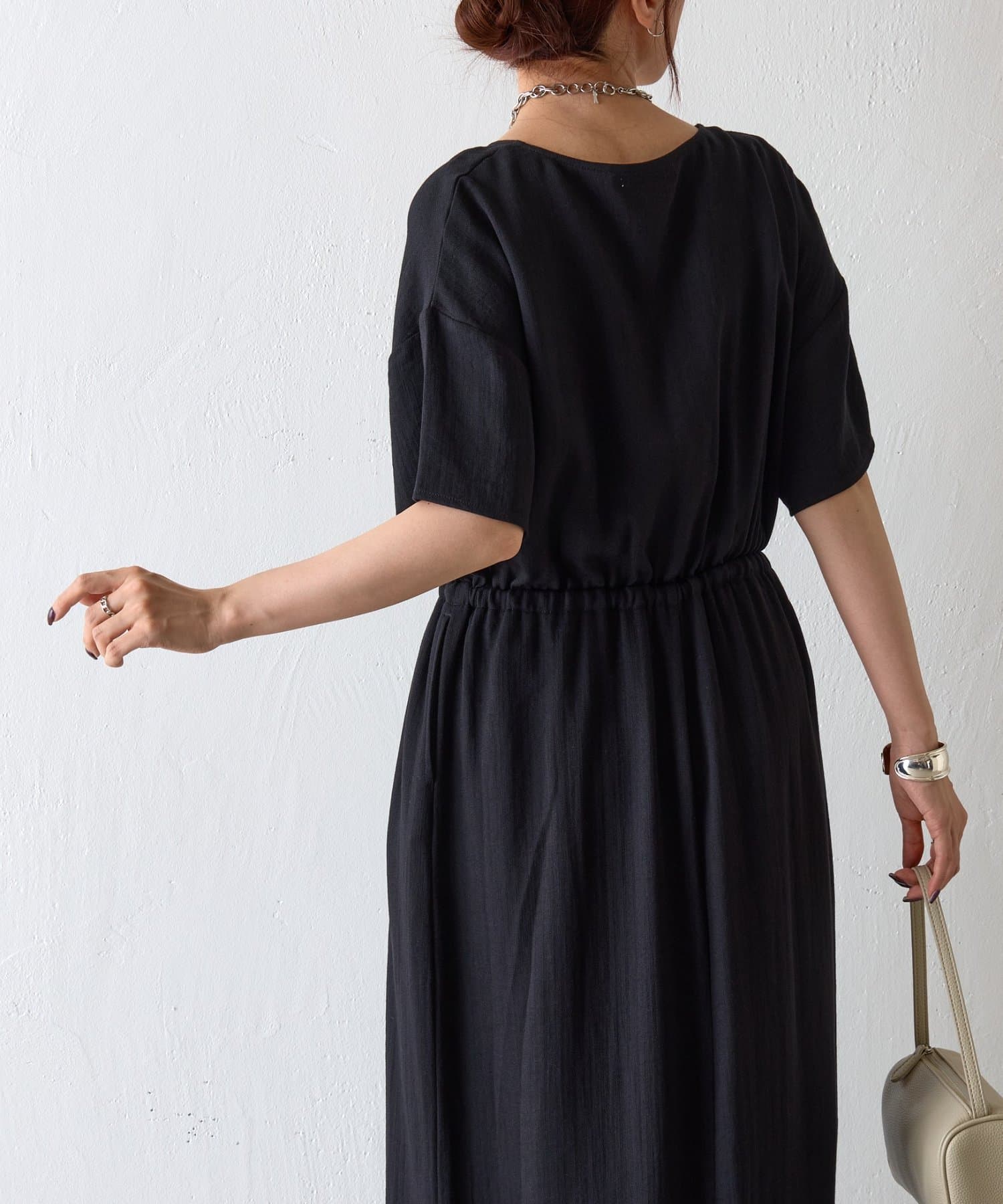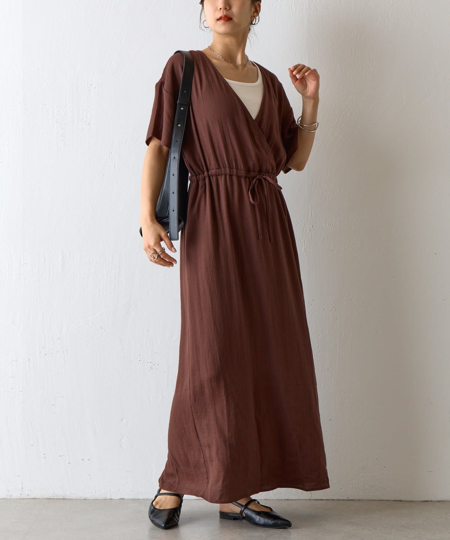 リネンのような風合いで、涼しげでナチュラルな印象を与えるこなれワンピースが登場。まるでリネンのようなナチュラルな風合いを持ちながら、レーヨンとナイロンの混紡素材でしなやかで上品見えに。さらりとした肌触りなので、これからの季節に快適に過ごせるのも嬉しいポイント◎深めのカシュクールデザインは、デコルテを美しく見せ女性らしさを引き立て、アクセサリーとの相性も抜群です。ウエストのリボンを結べばメリハリのあるシルエットが完成し、スタイルアップ効果も期待できます。デザインの邪魔をしないサイドのラインにポケットがついているので、スッキリとしたシルエットです。一枚でコーディネートが完成するワンピースはデイリーユースだけではなく、リゾートや夏の旅行にもおすすめ。アクセサリーやバッグでアレンジすれば、オフィスから休日のお出かけまで幅広いシーンで活躍まちがいなしの1着。