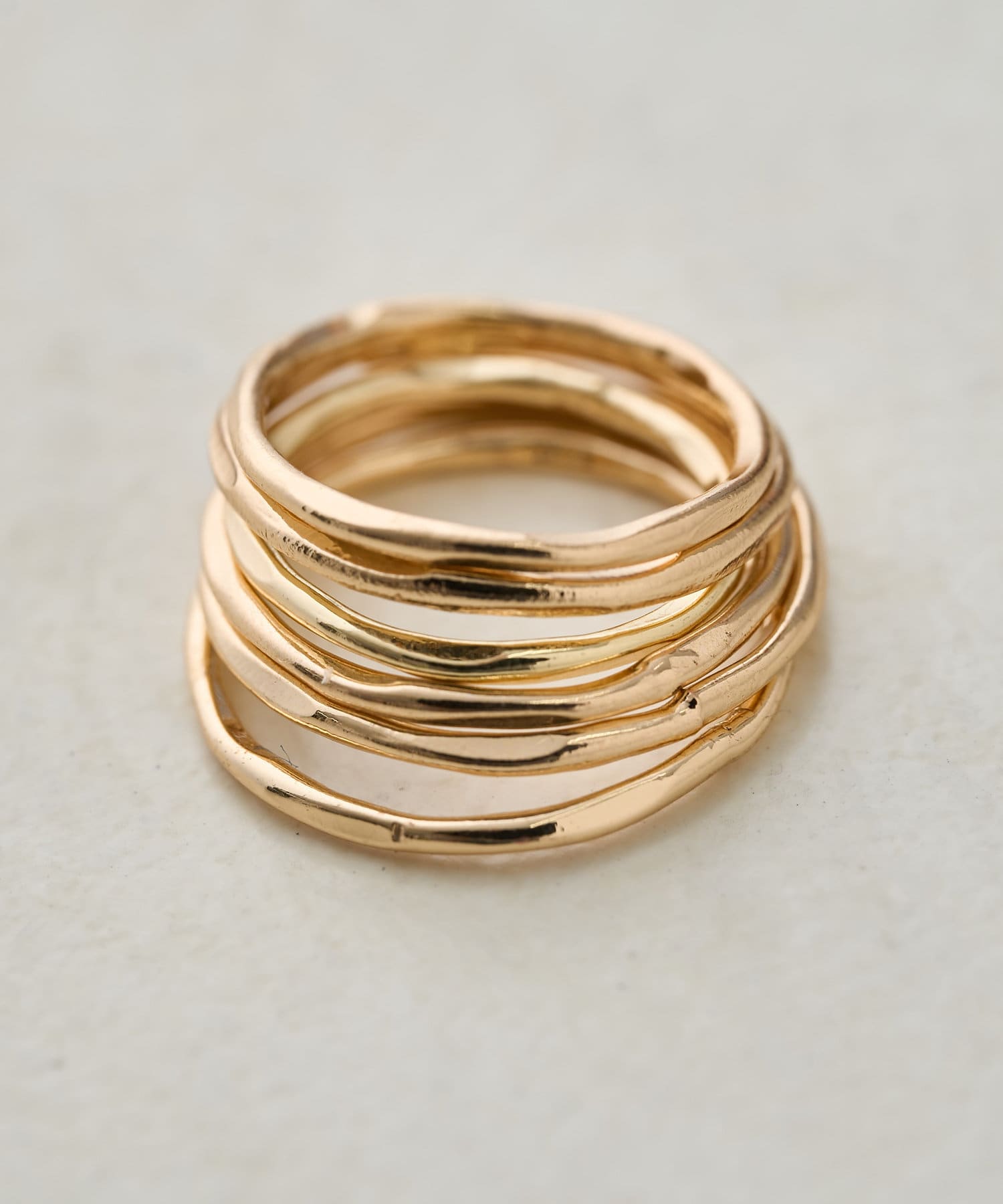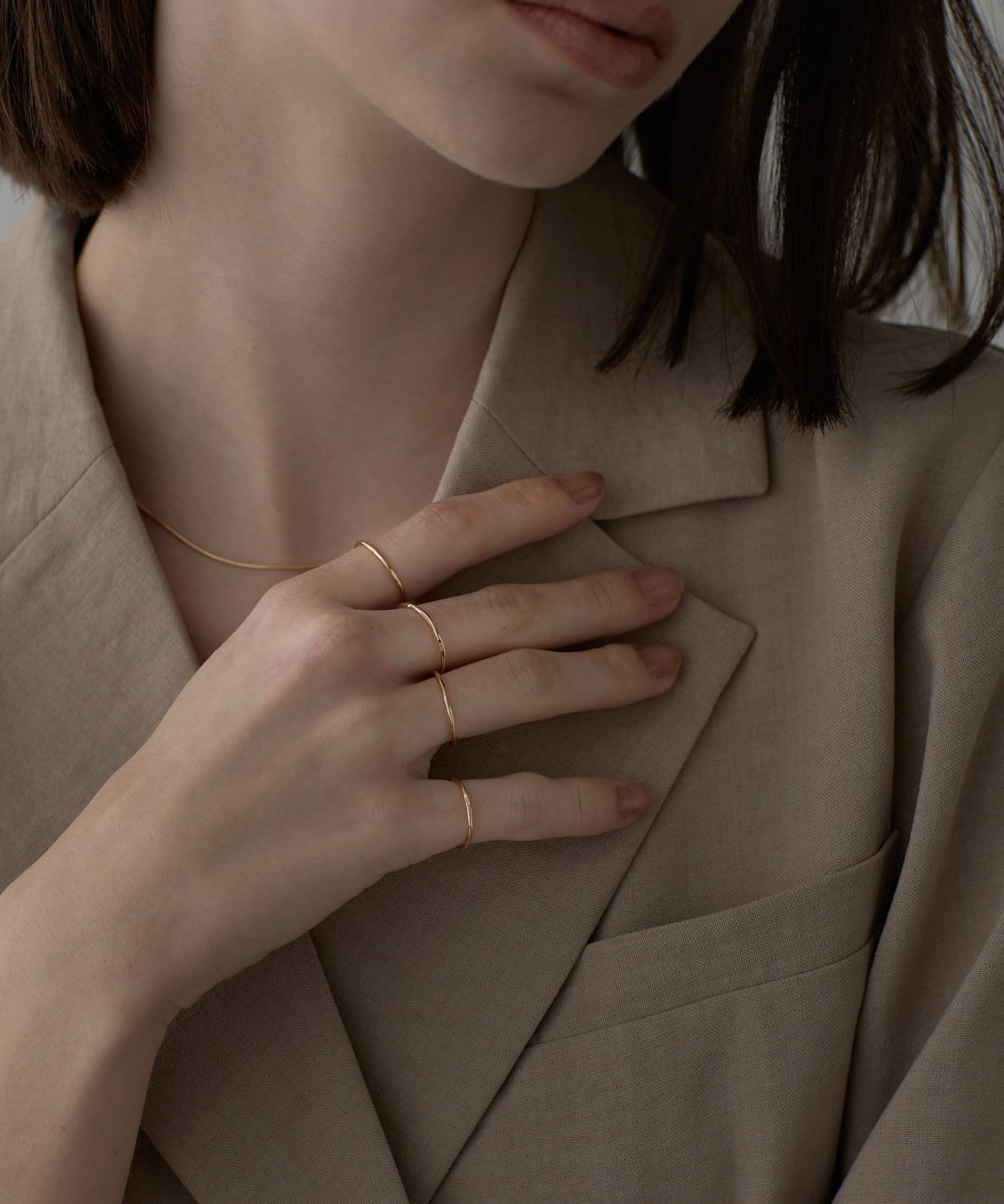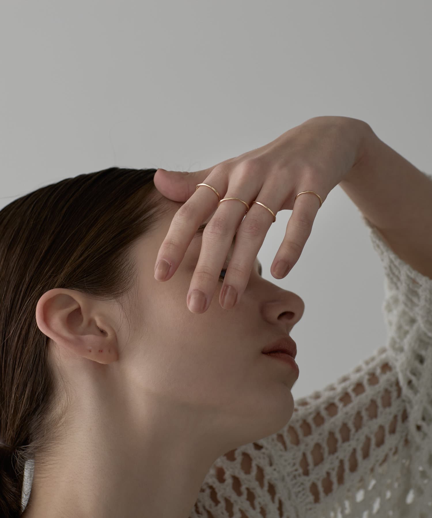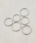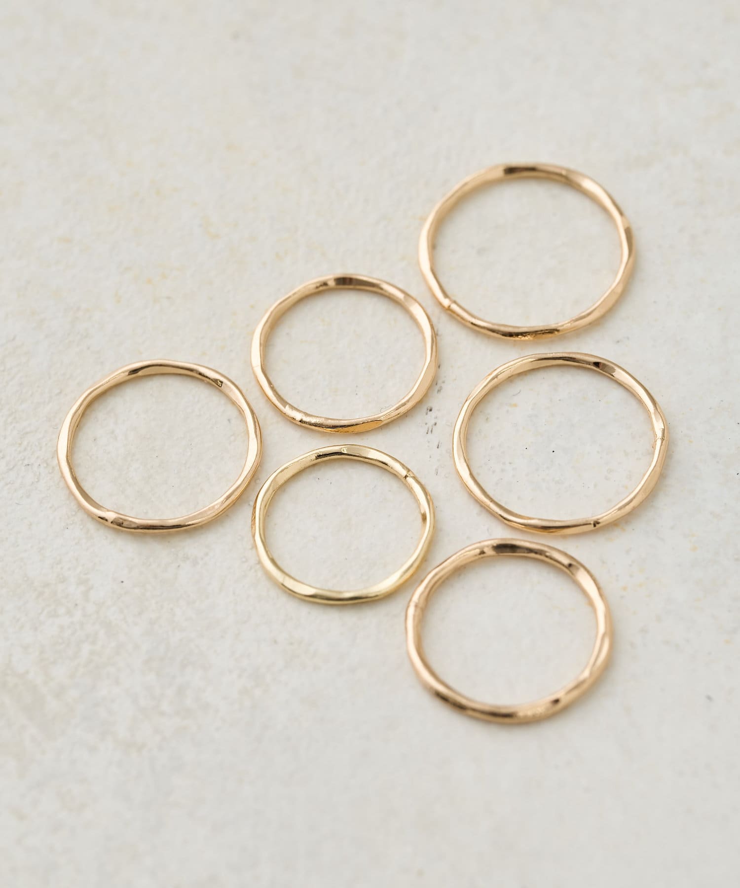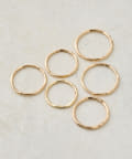 華奢で凹凸感のあるオリジナルのデザインリングがどんなスタイリングにもマッチします。ニュアンスのある形がおしゃれ見えするアイテム。6つそれぞれサイズが異なり、単品使いや重ね付けなど様々な組み合わせが楽しめるセットリングです♪