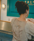 バックには飾りボタンが付いており後姿までこなれた印象に。