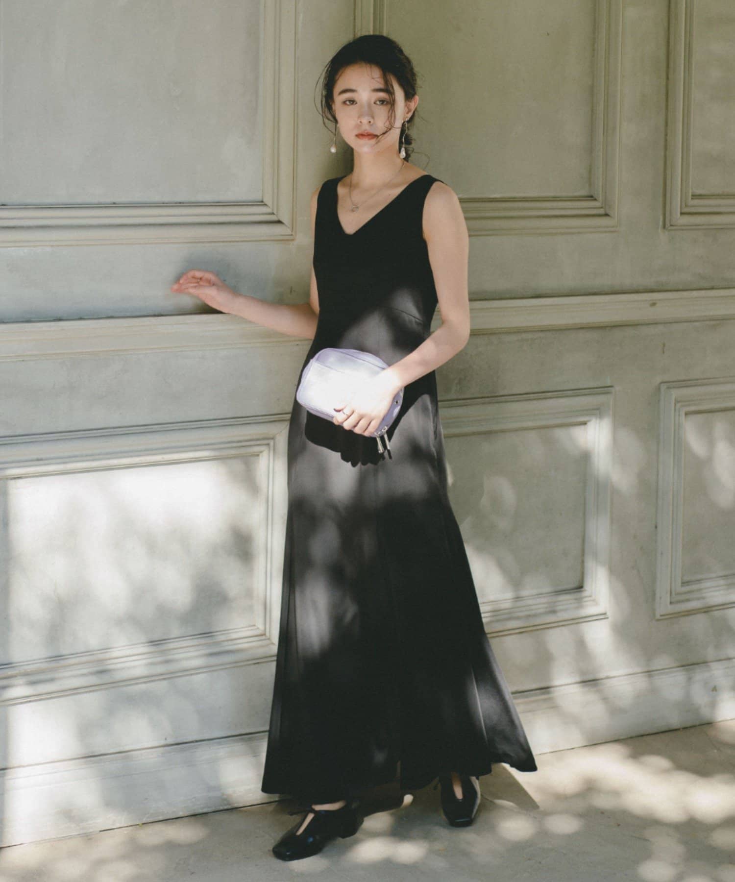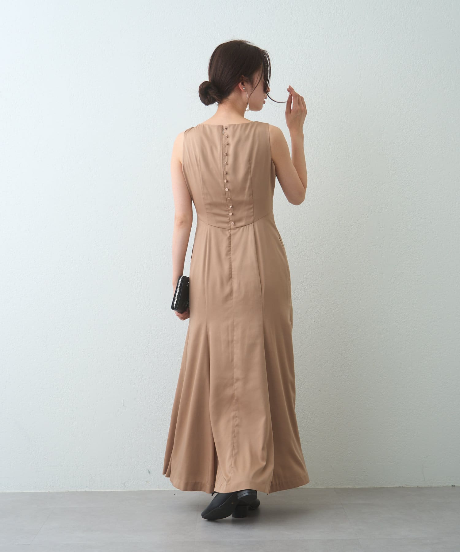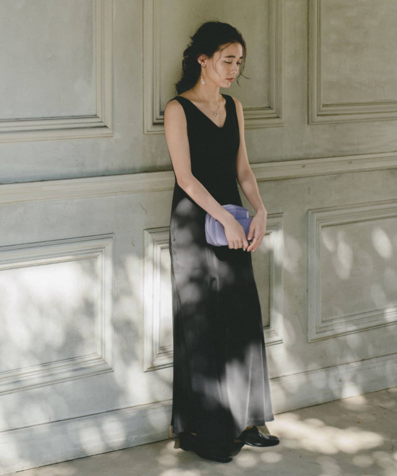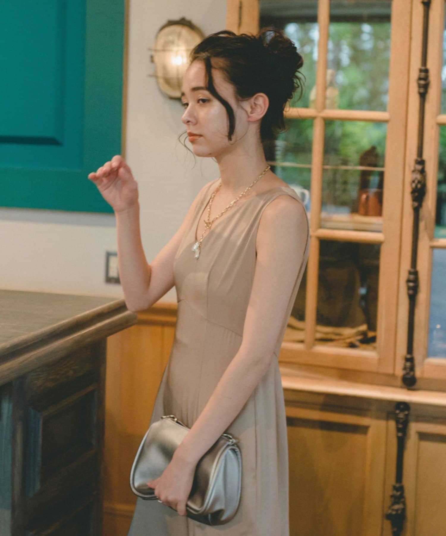 適度な光沢感が高見えし、一枚でも着用いただけるドレス。