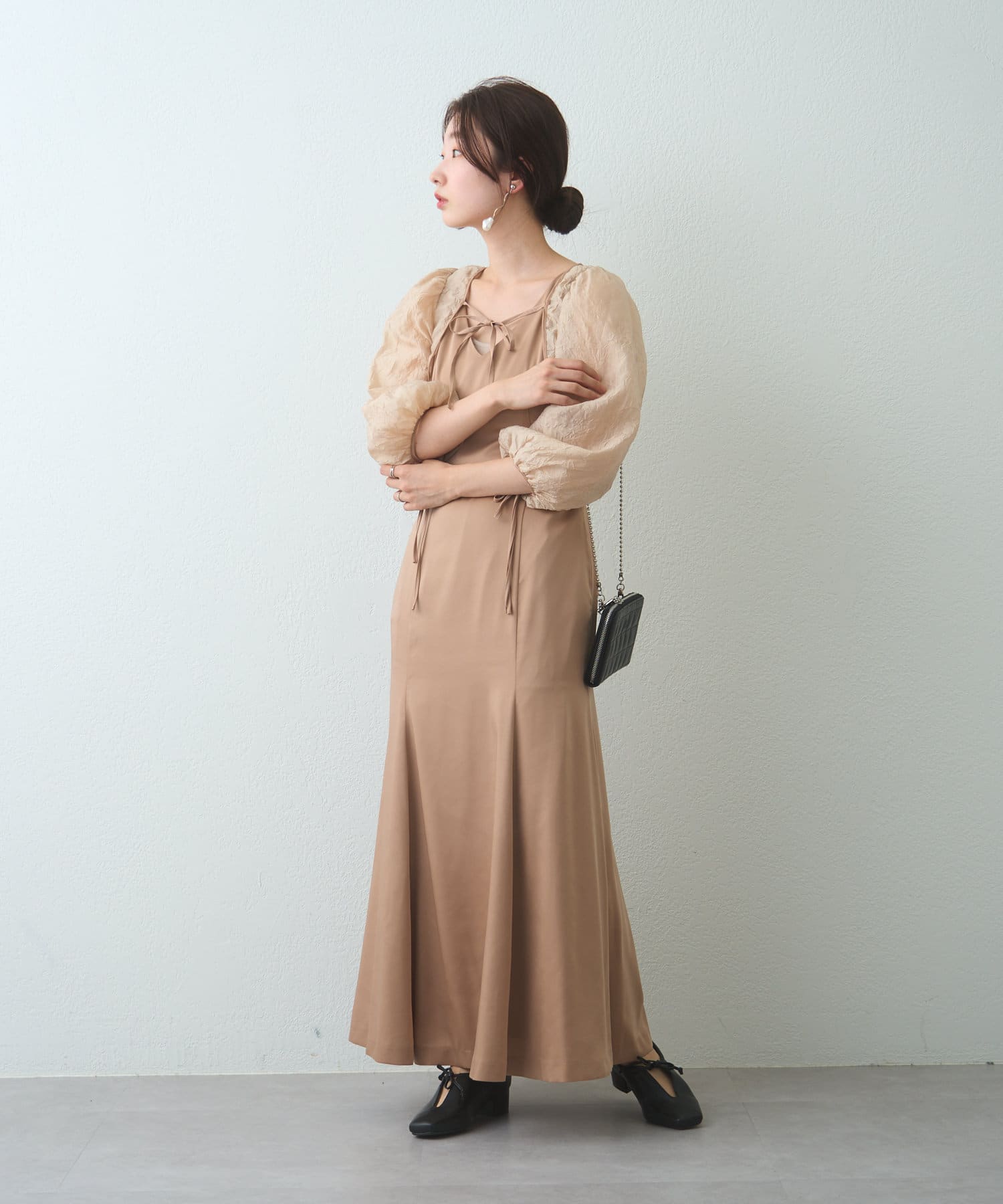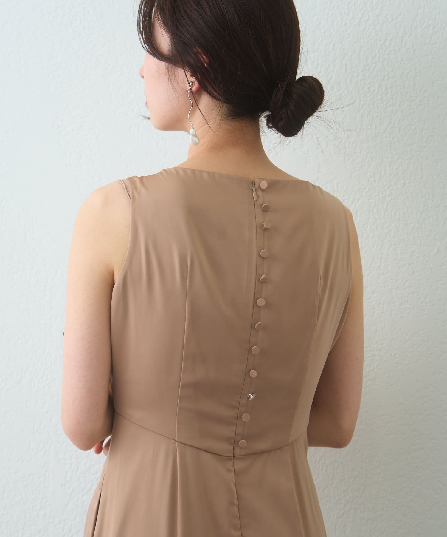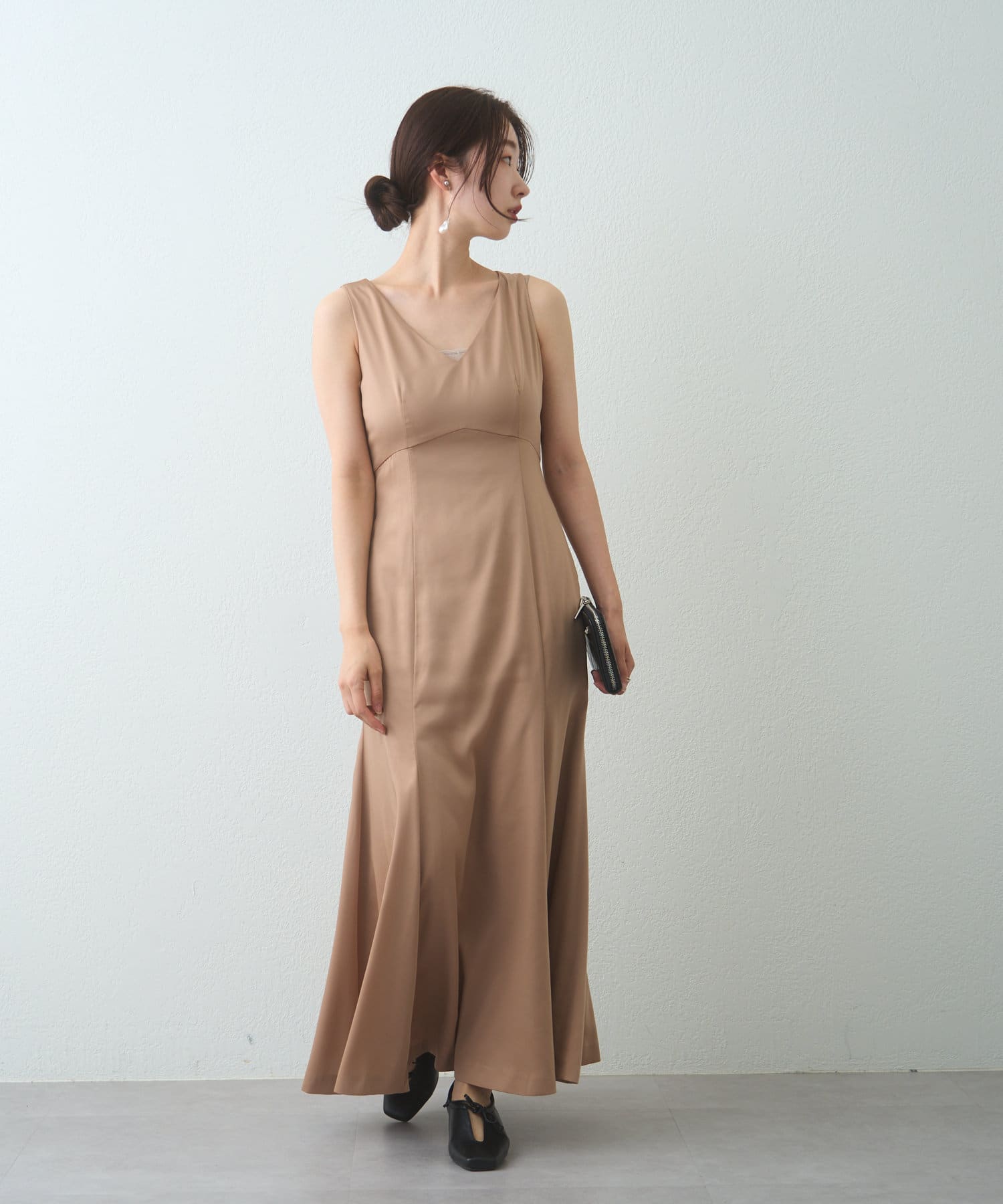 適度な光沢感が高見えし、一枚でも着用いただけるドレス。