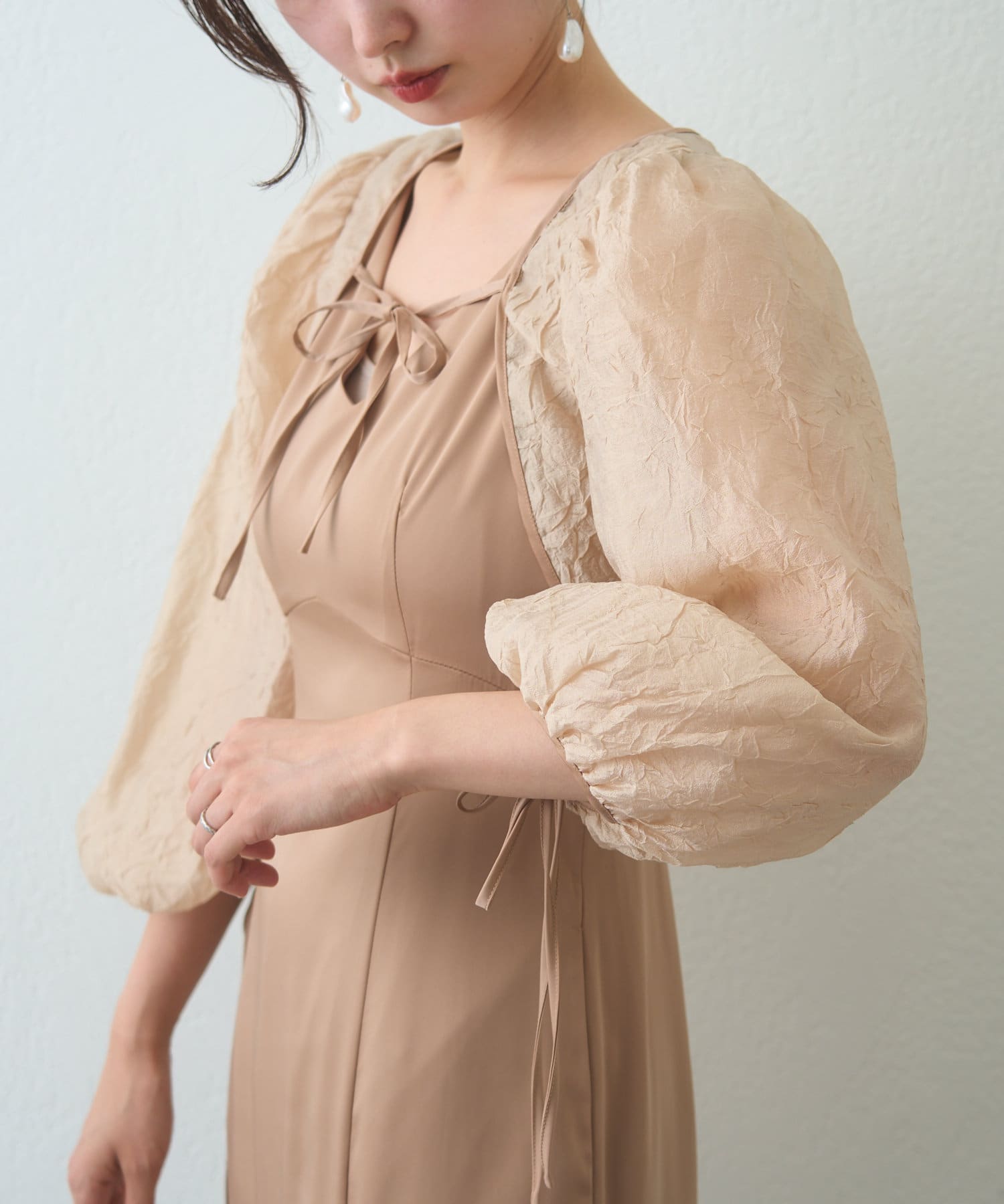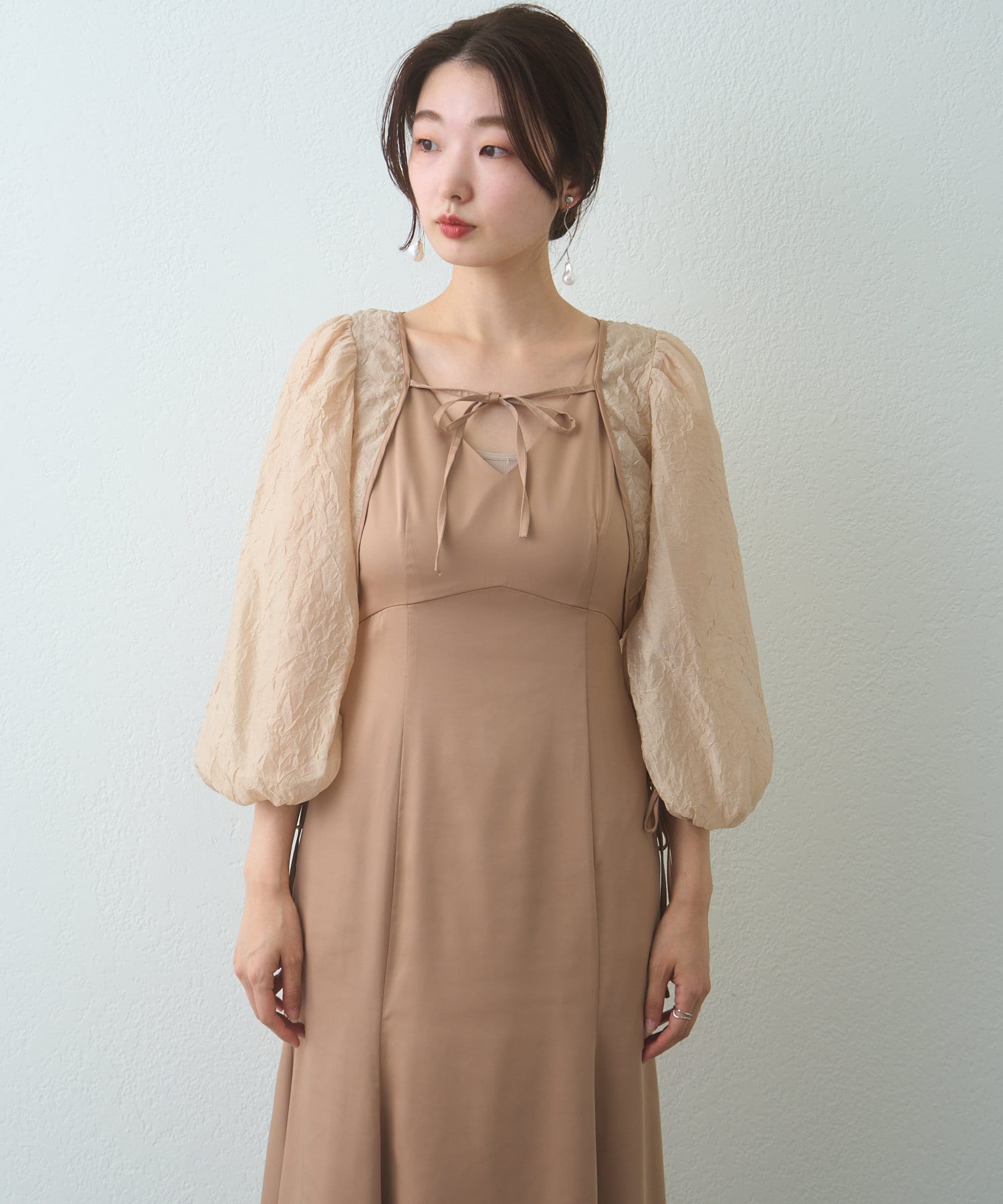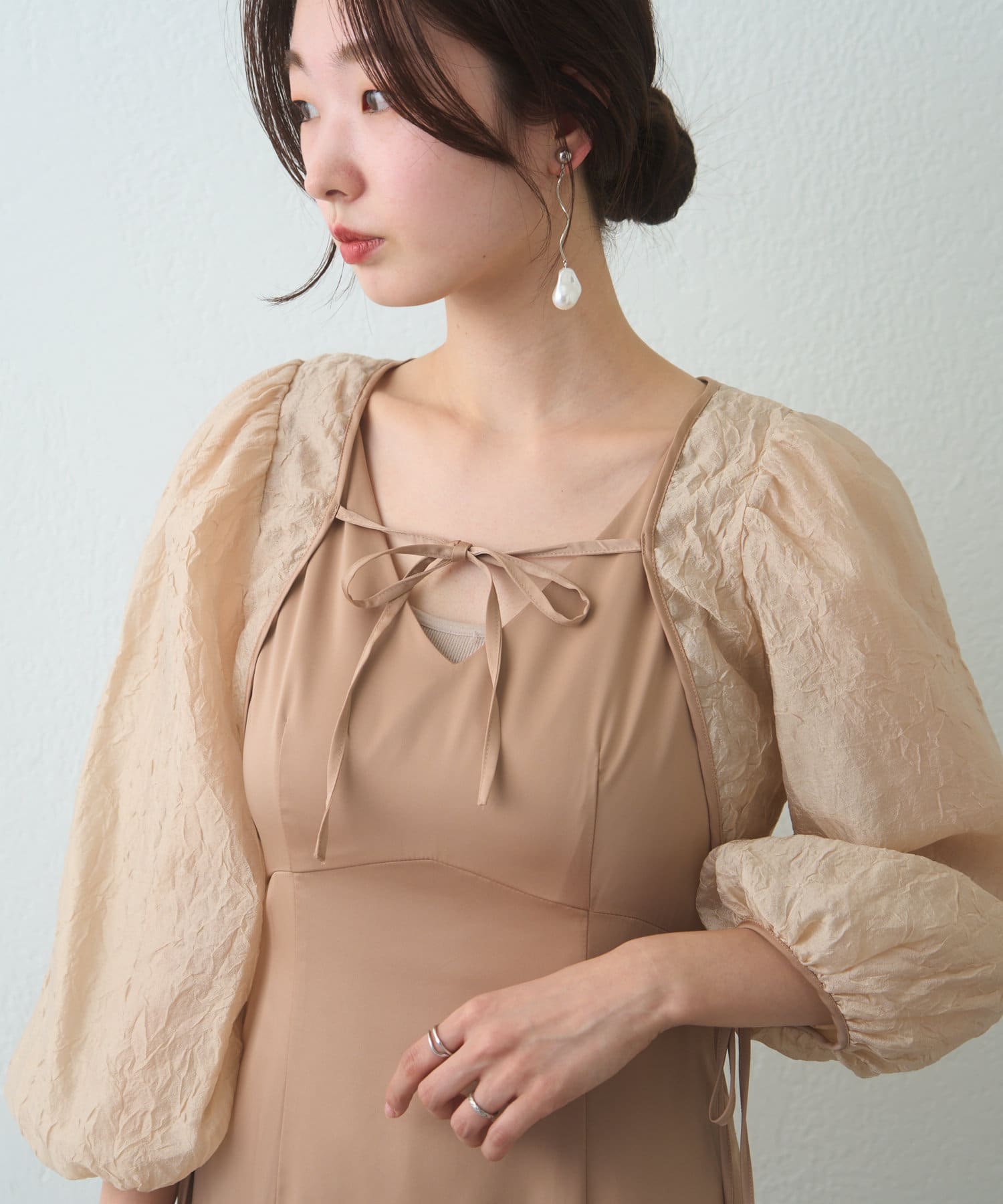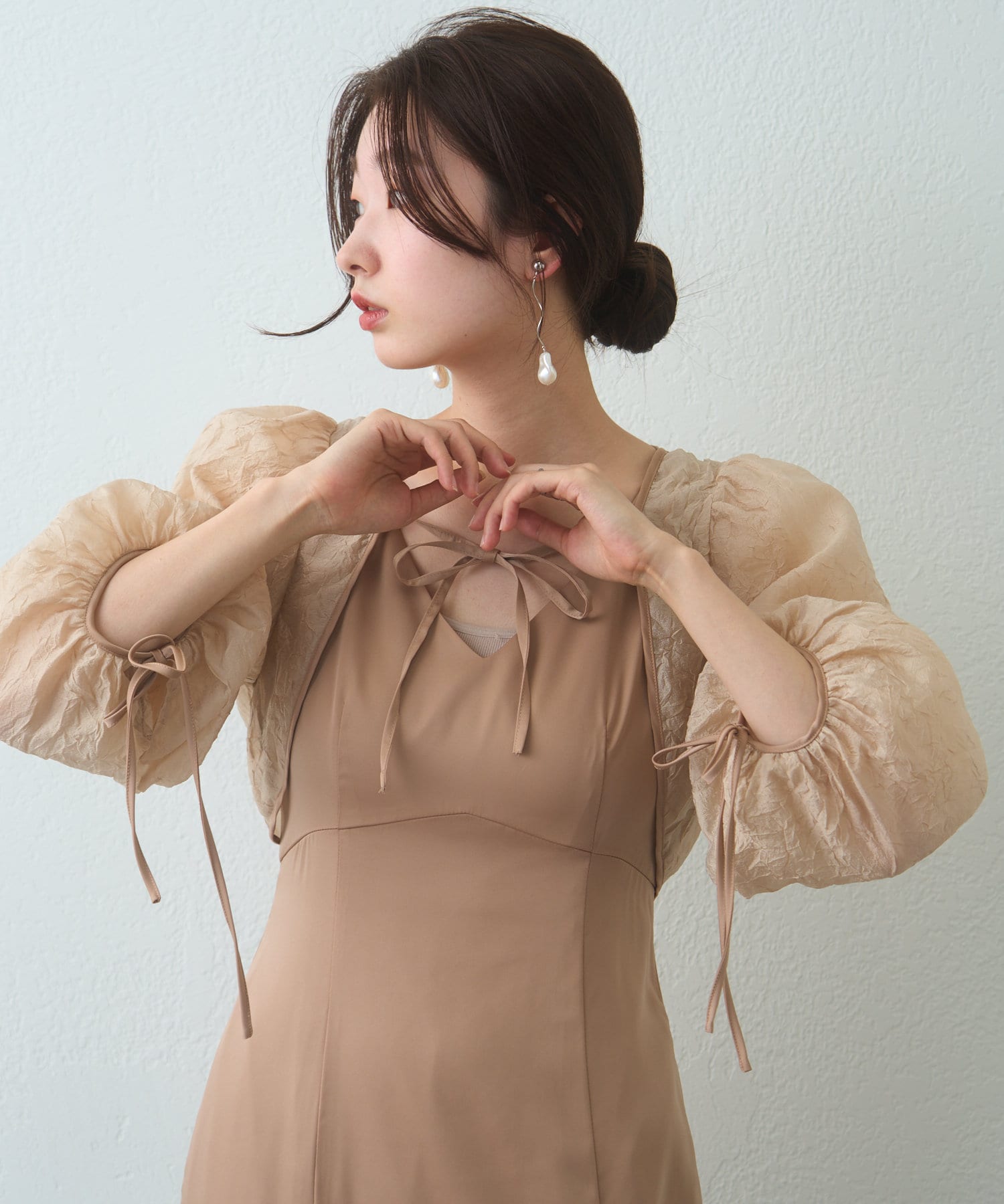 ボレロのリボンを前に、後ろに、ワンピース単品でも着用可能です。