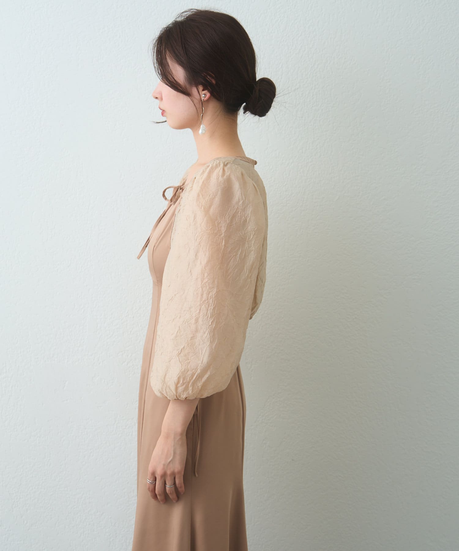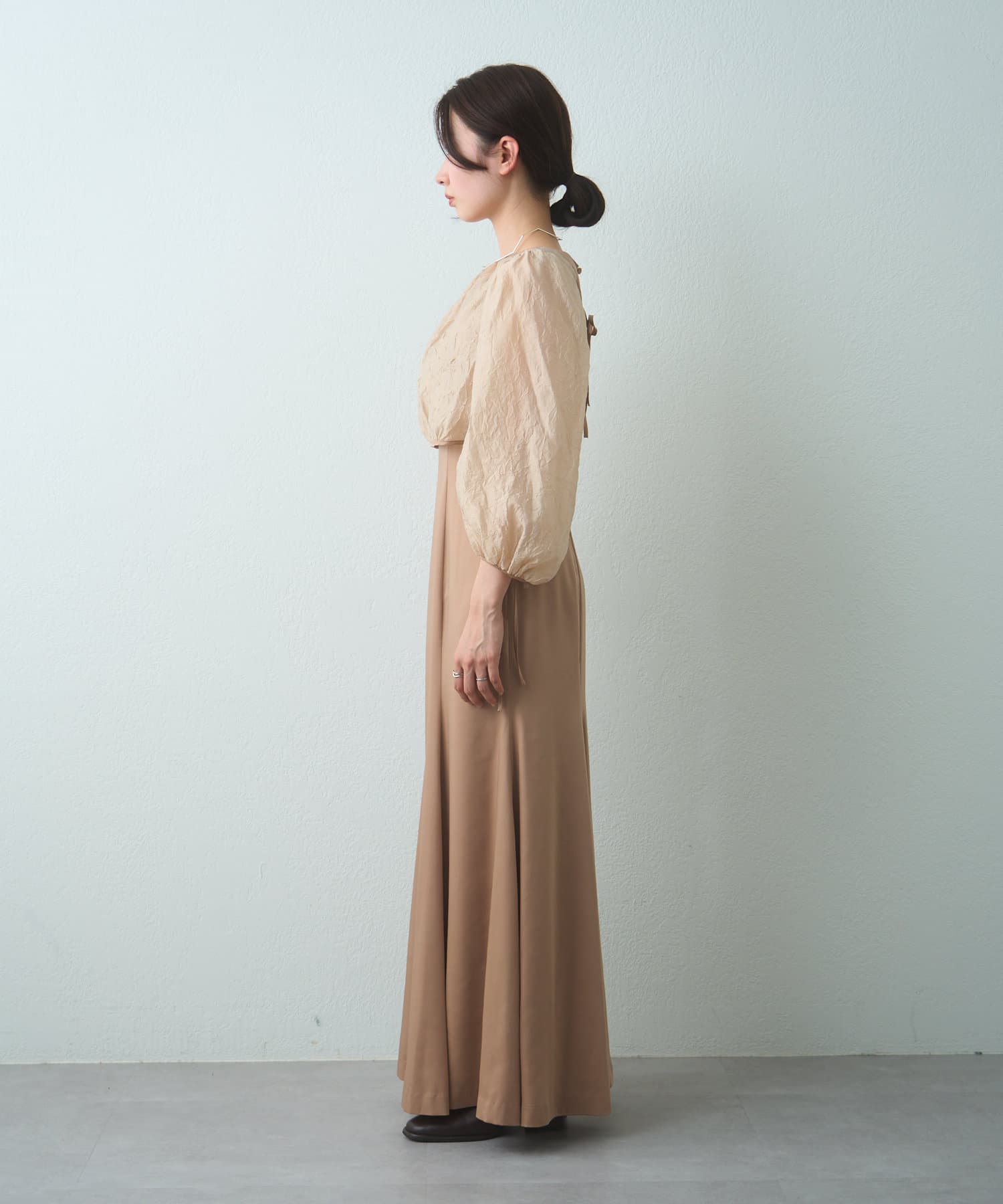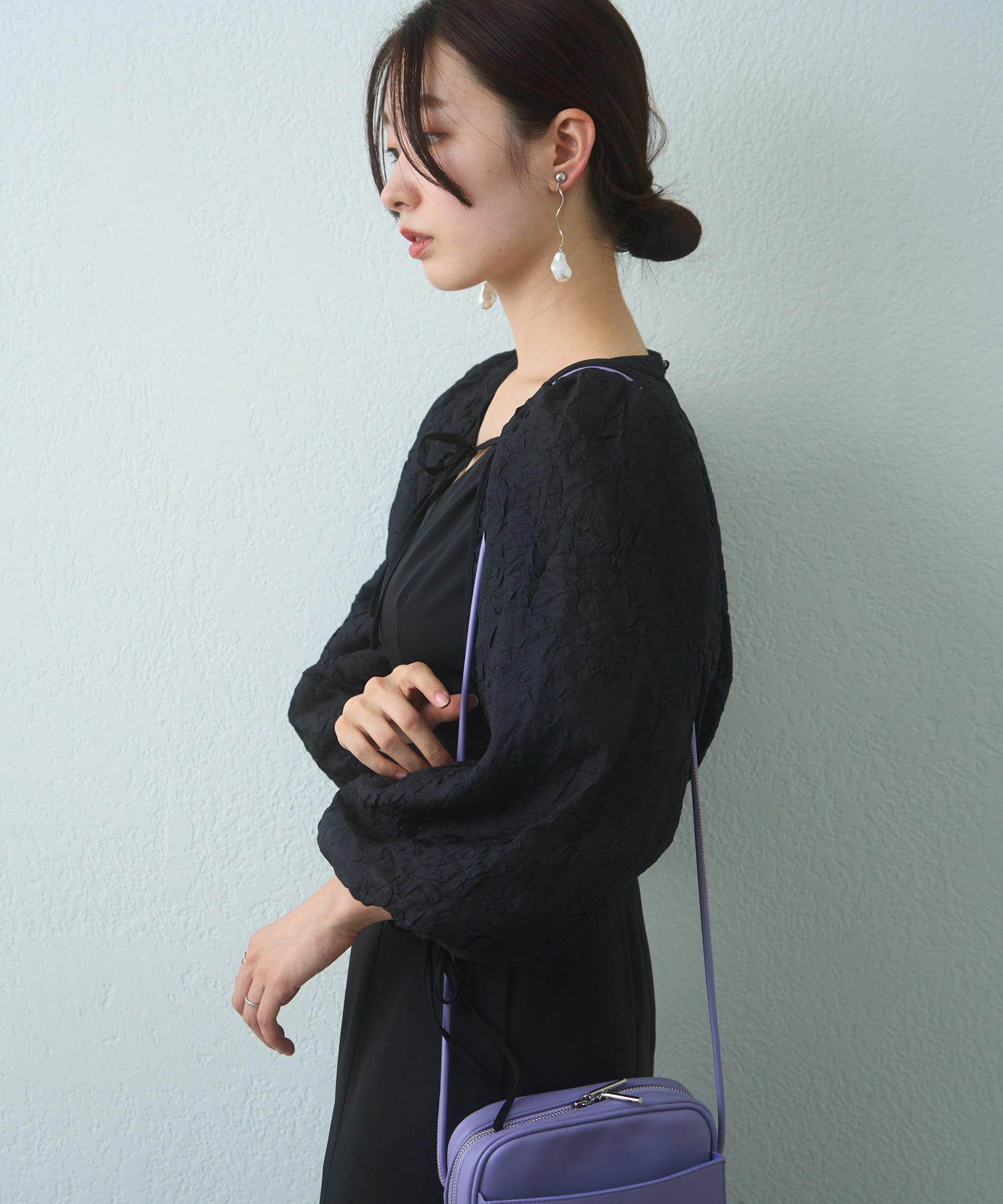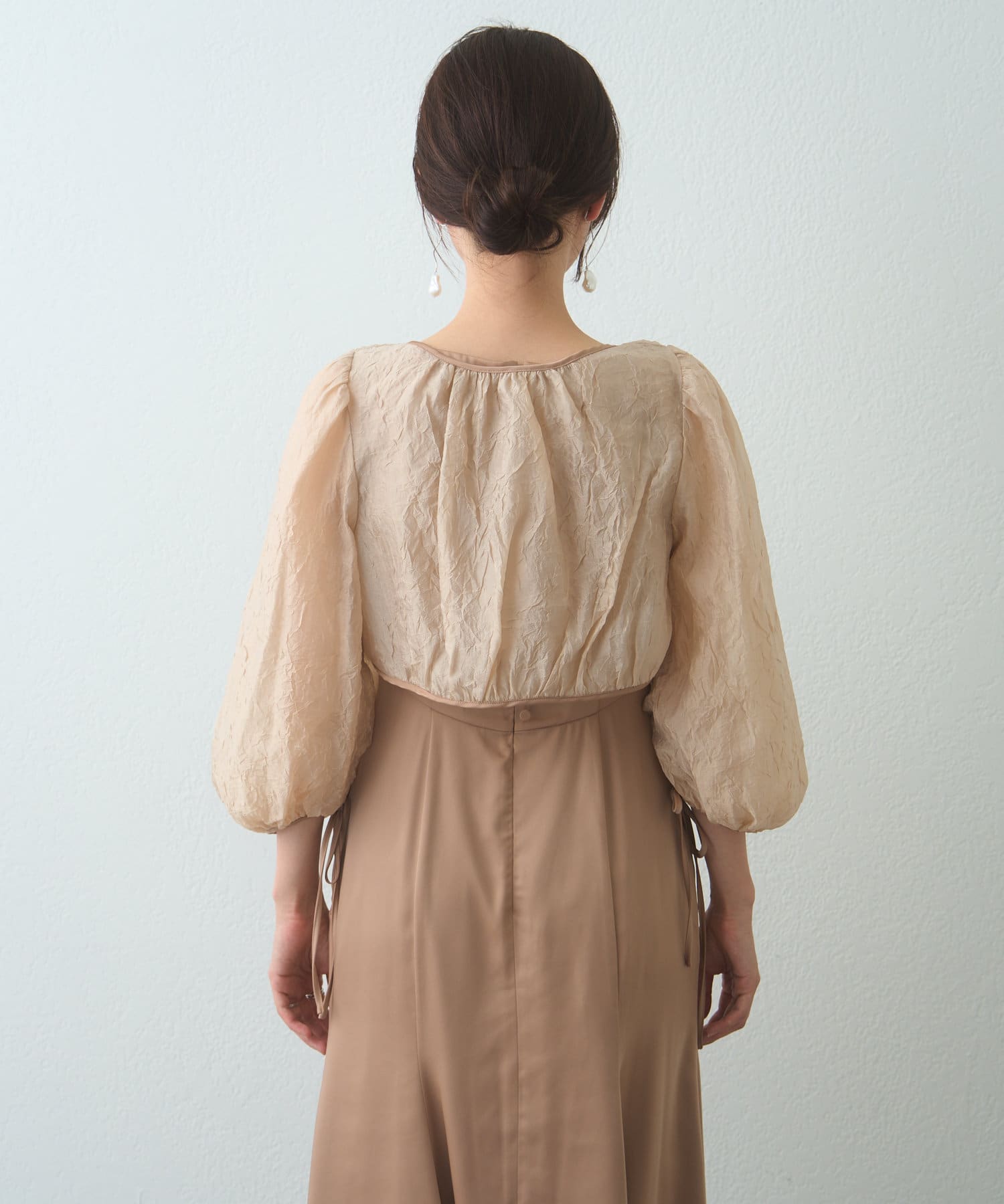 ボレロのリボンを前に、後ろに、ワンピース単品でも着用可能です。