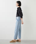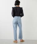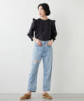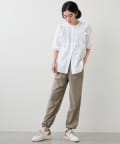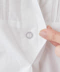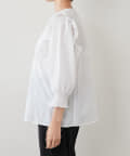女性らしいAラインのシルエットや、ゴムシャーリングでふんわり感を出したパフスリーブが大人かわいい印象ながら、首元をすっきり見せるクルーネックやフライフロント仕立てで甘さを抑え、大人のスタイリングにもしっくりと馴染むデザイン。