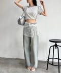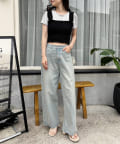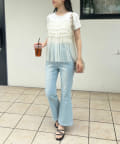 ガーリーなトップスだからこそあえてデニムと合わせてカジュアルなスタイリングに。