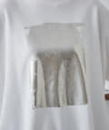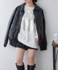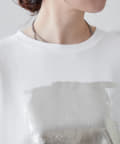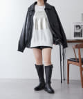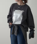 ・目を惹く箔プリントは、アウターに合わせても着映えする1枚。