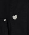 ドリューチョアコートは、クラシックなワークスタイルのシルエットをベースに、トリプルステッチのディテールが特徴の裏地なしのミッドウェイトコットンツイル製。フロントポケットは4つあり、うち1つはフラップとボタンで開閉する。ジャケットの内側にも胸ポケットが1つ付いている。ハートのワッペンがデザインを引き締めている。