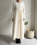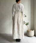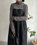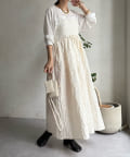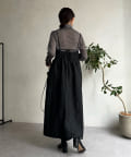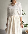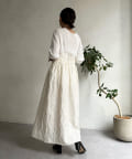 胸下のラインからギャザーを寄せ、裾に向かって広がるシルエットを作ります。高い位置に目線がいくことで、脚長効果があるのも嬉しいポイント。