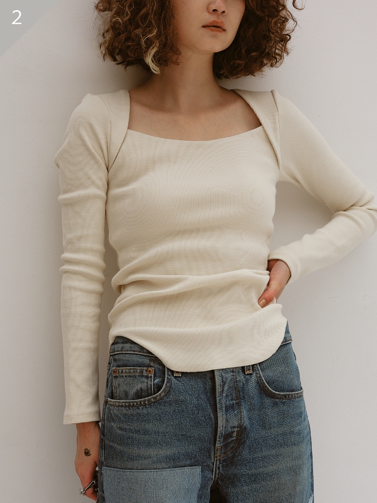 2位はデコルテラインを綺麗に見せてくれるスクエアネックが特徴的なカットソー。トップスでは珍しくサイズ展開があり、体型に合わせてお召しいただけます。カップ付きでインナーを気にする心配がなくスッキリと着られるため、ジャケットや軽羽織の中に忍ばせるのにもぴったり。シンプルで着回し力が高く、ワードローブに加えておきたいアイテムです。