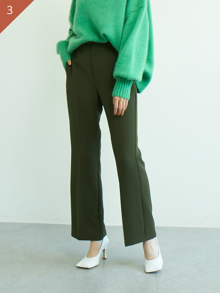 ガリャルダガランテ名品のジャージーシリーズからフレアパンツが3位にランクイン。少し肉厚なポリエステル素材は身体のラインを拾いにくく、ストレッチが効いた美脚見えパンツです。セミフレアシルエットなのでワイドパンツが苦手な方や小柄な方から特に高い支持を得ています。新色で予約販売中のブラックとキャメルも要チェック✔