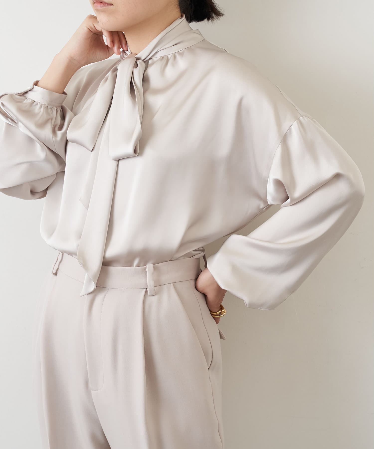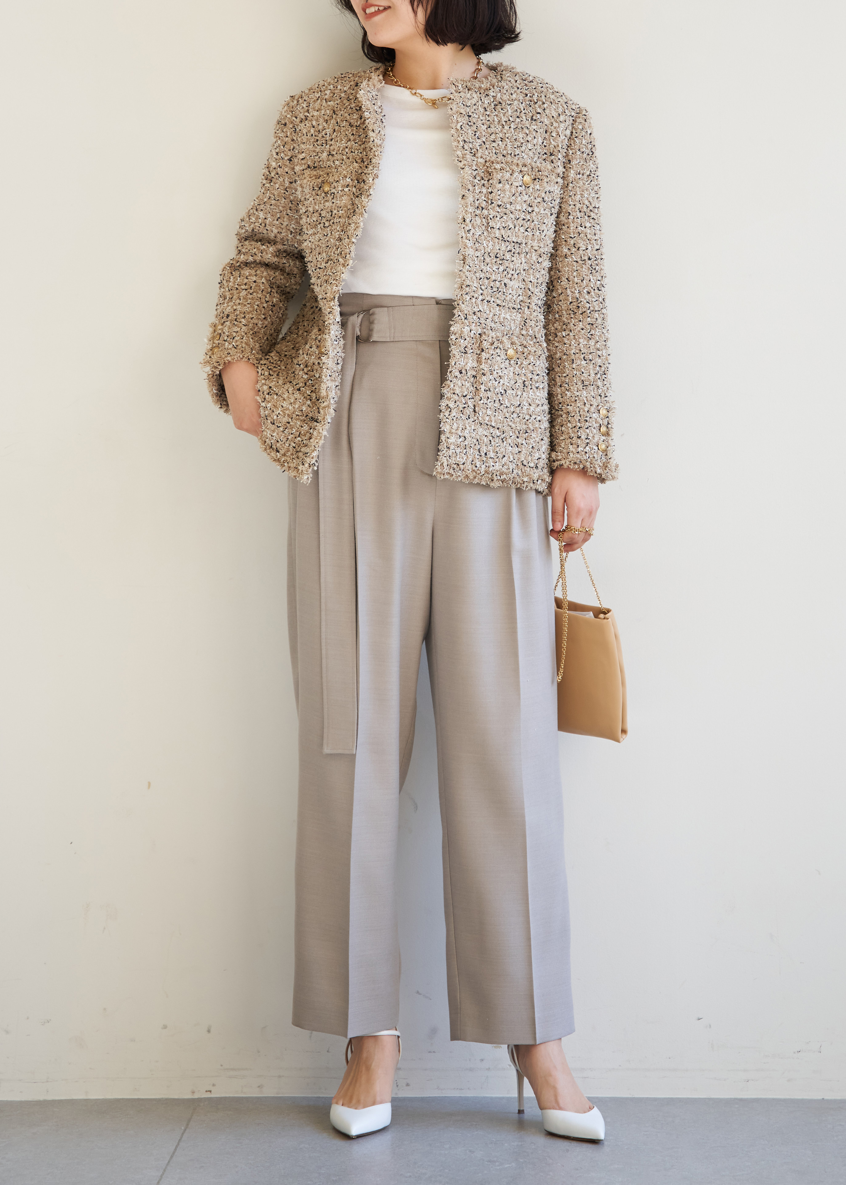 品のよさが漂うベージュトーンでオフィススタイルをブラッシュアップ。