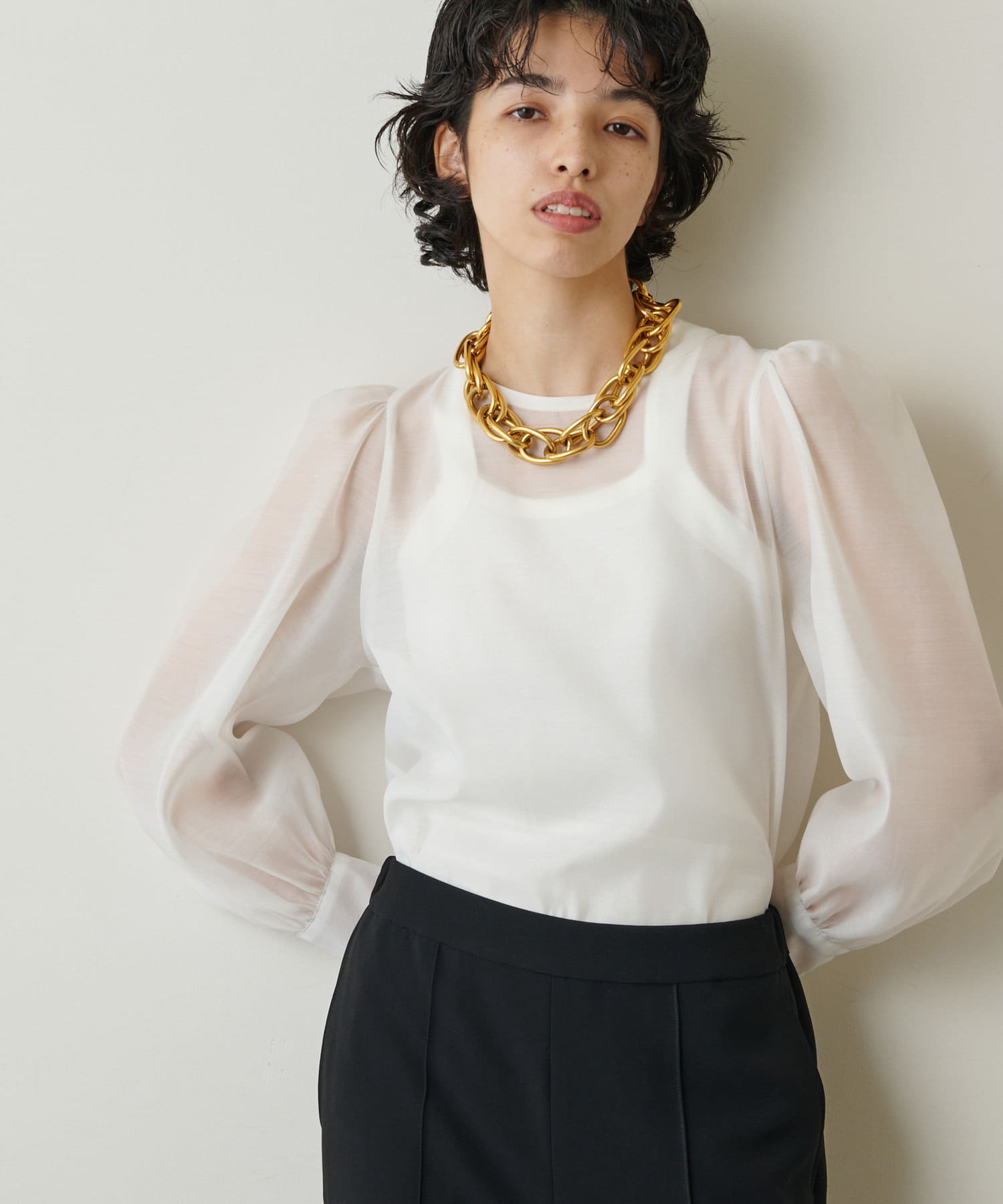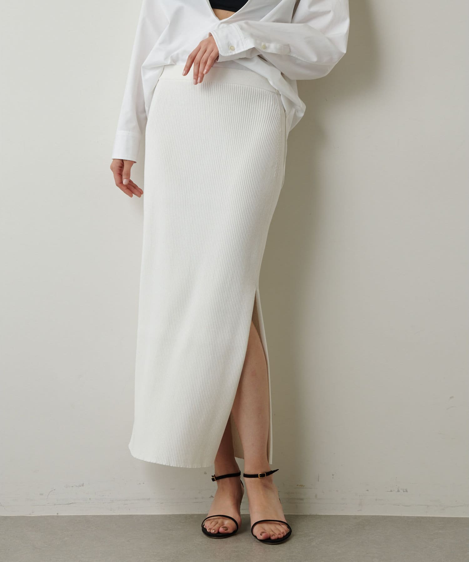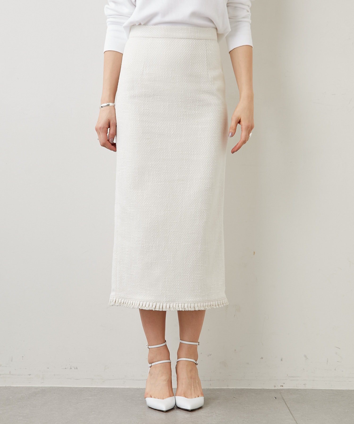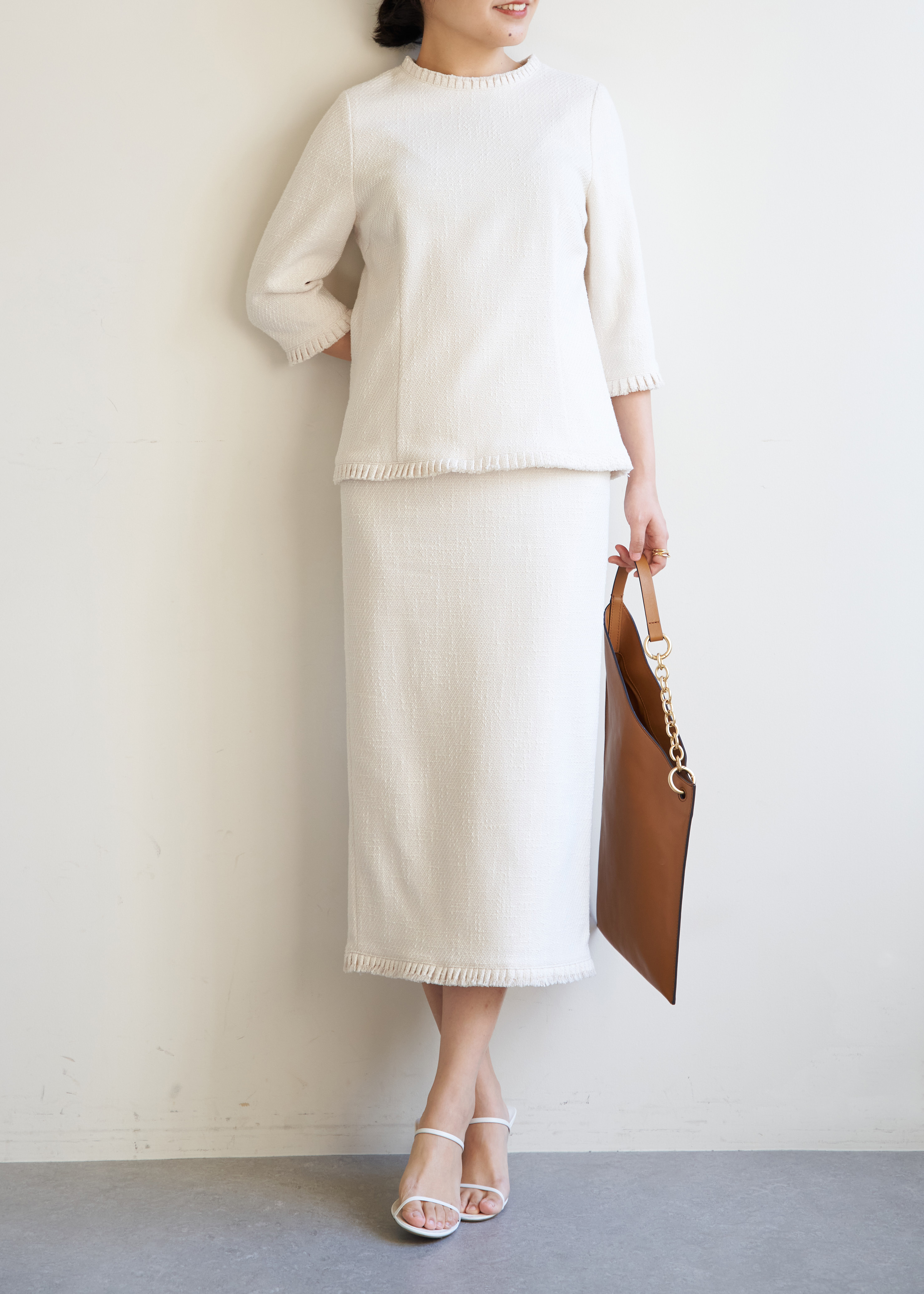 ホワイトのセットアップなら、一気に華やかな印象に。