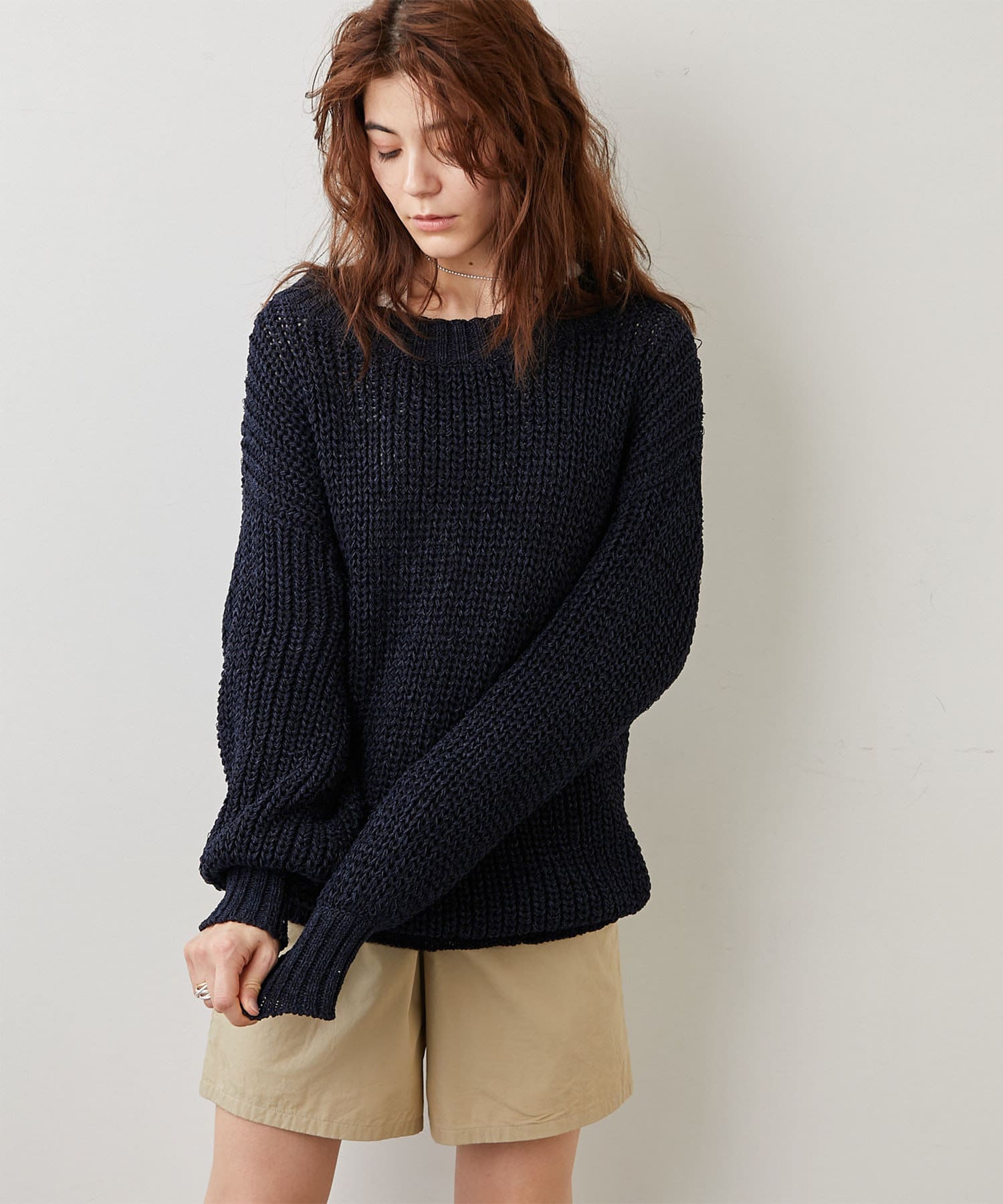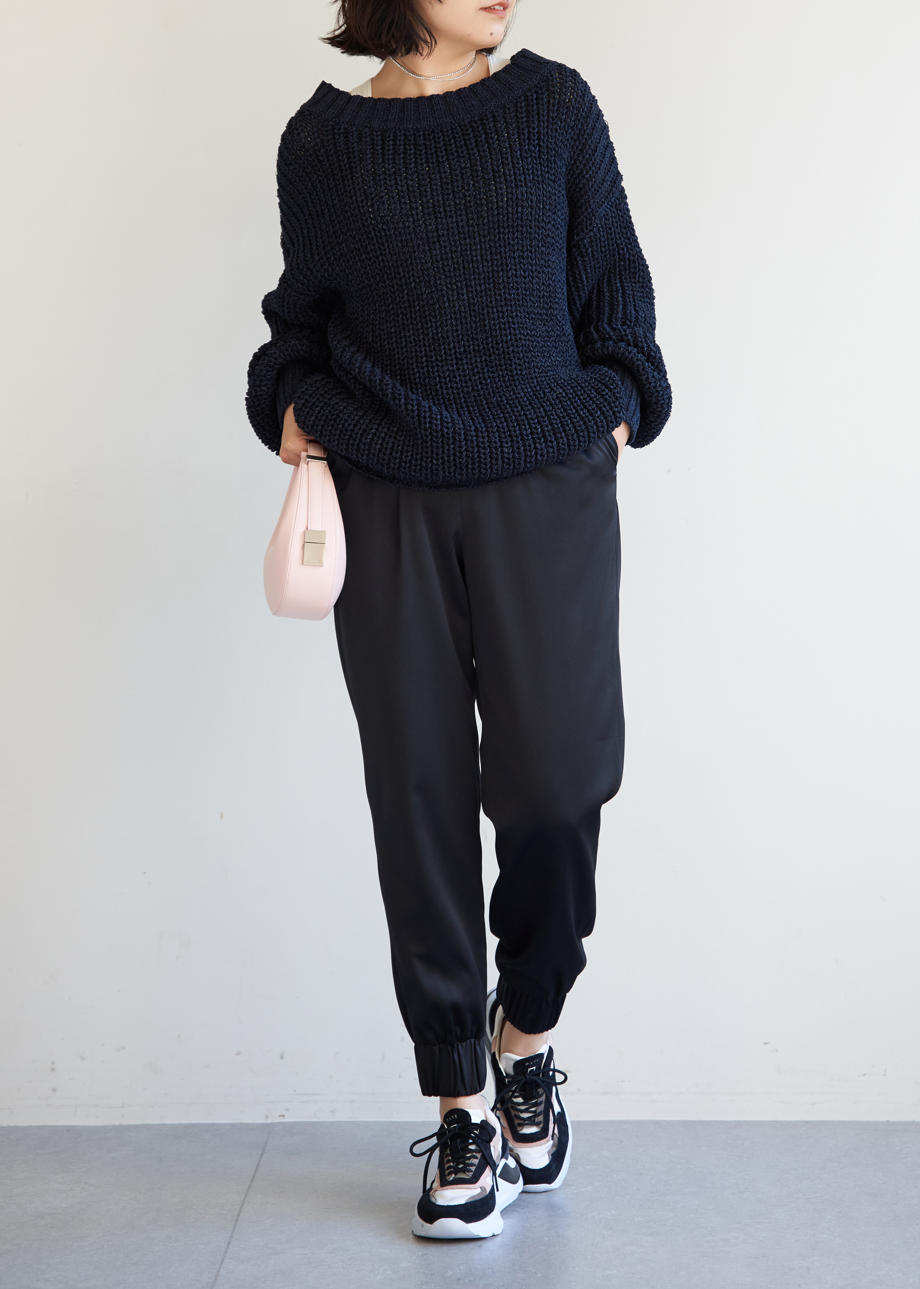 体が泳ぐローゲージニットには、旬なジョガーパンツを合わせて