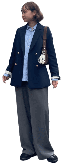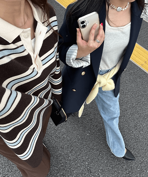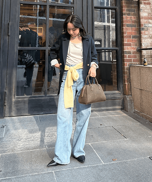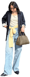 フレディ定番のダブルブレストジャケットを使ったコーディネート!タンクトップとデニムでカジュアルダウンして着てみました!トレンドのバターイエローは腰巻きでポイントに🧈🤍
