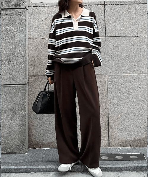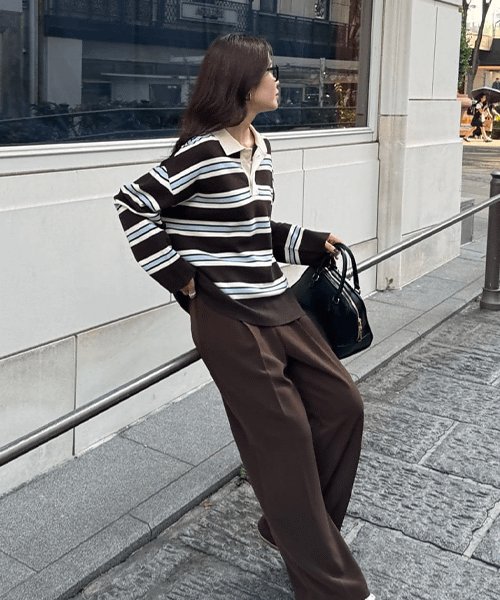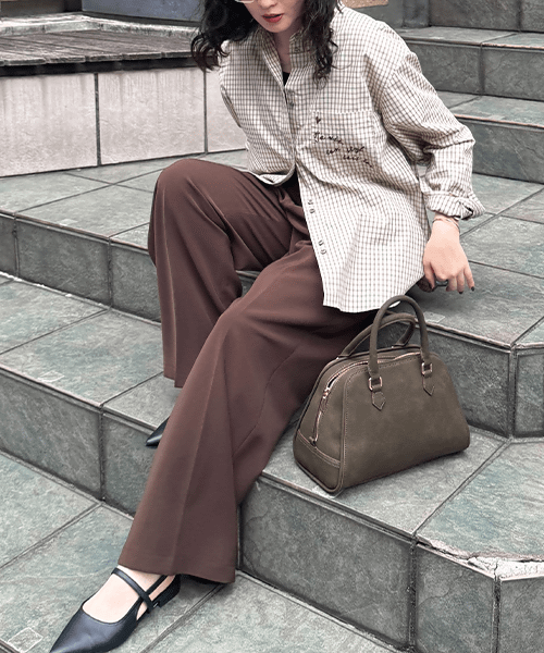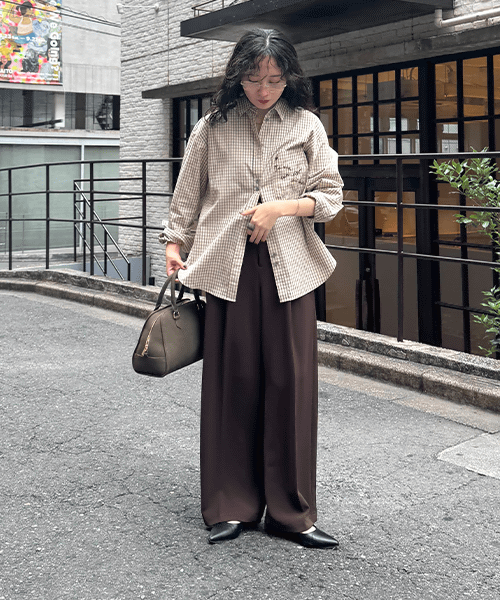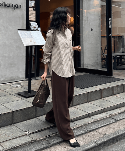 新色ブラウンのとろみパンツと合わせて季節感たっぷりに仕上げました🍂