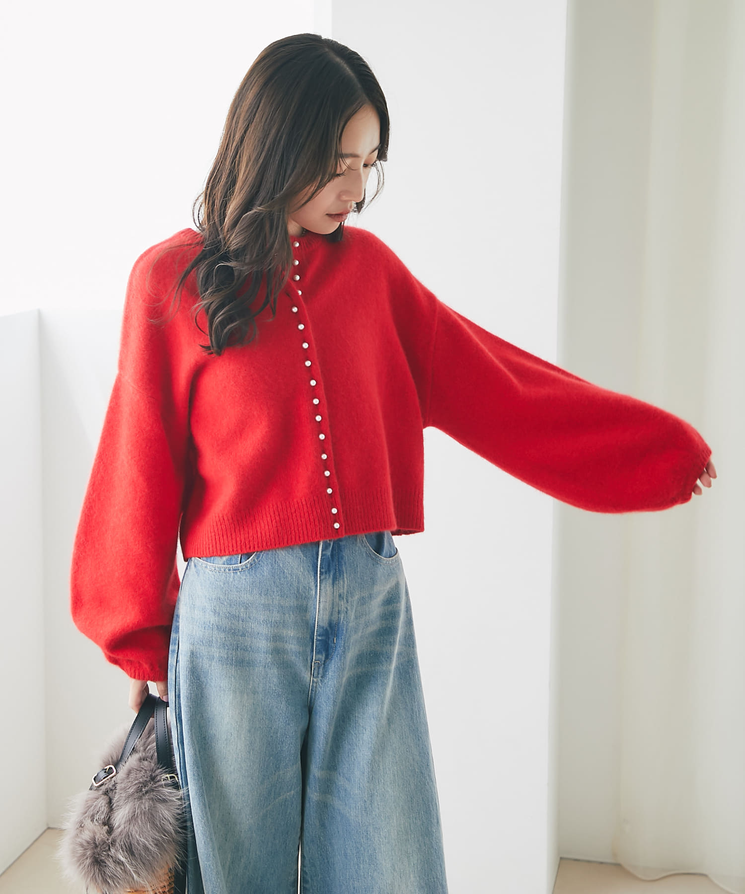 注目は新着のパール釦を連ねたヘアリーウールのカーディガン♪