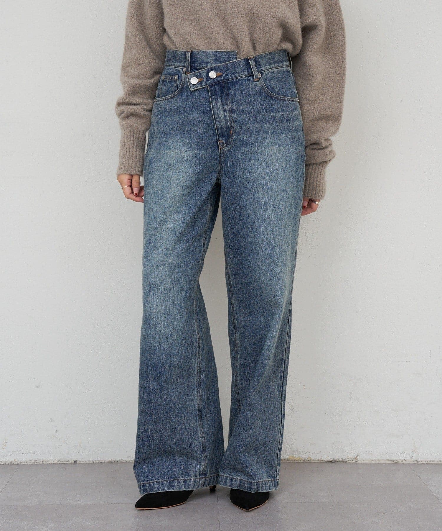 ウエストのアシンメトリーデザインが特徴のデニムパンツ。
