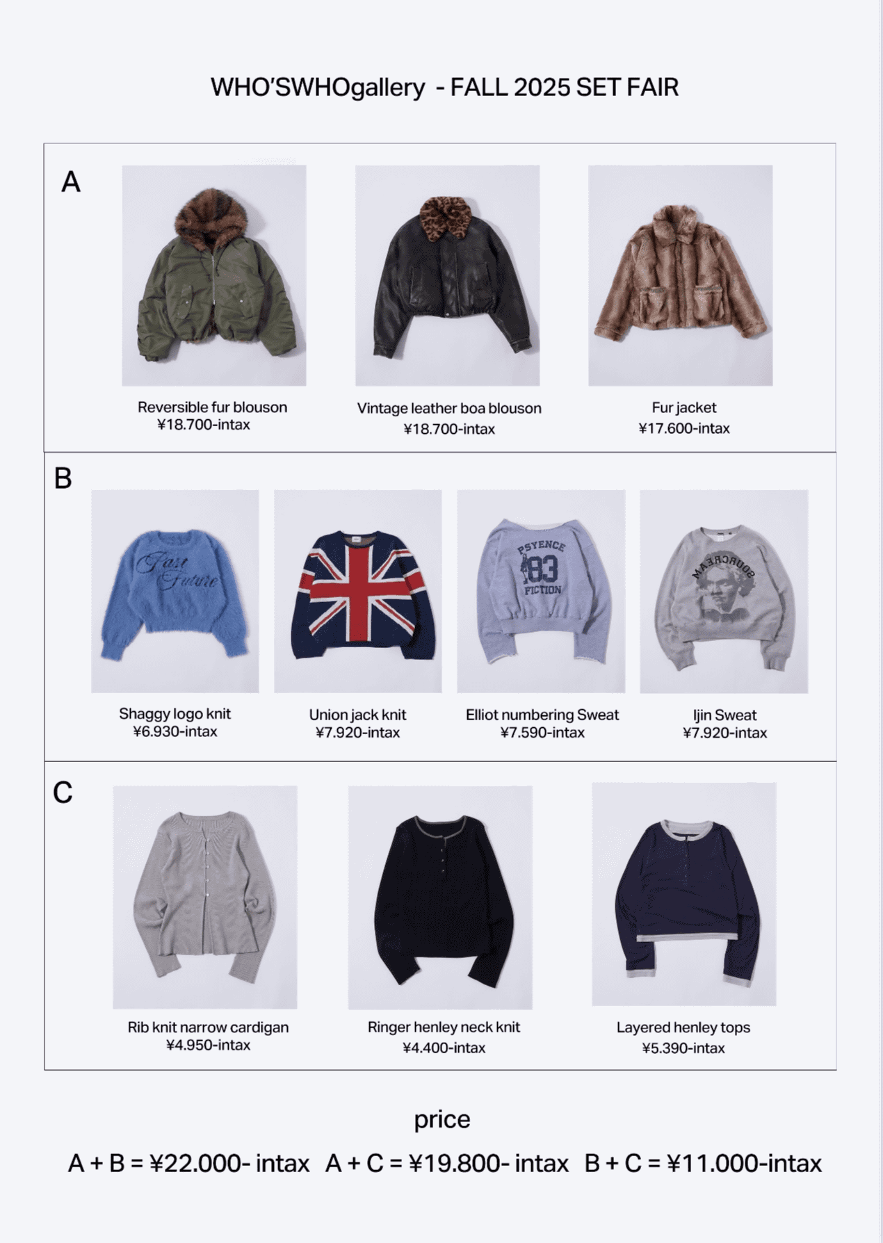 A(アウター)+B(スウェット/ニット)=¥20.000+税