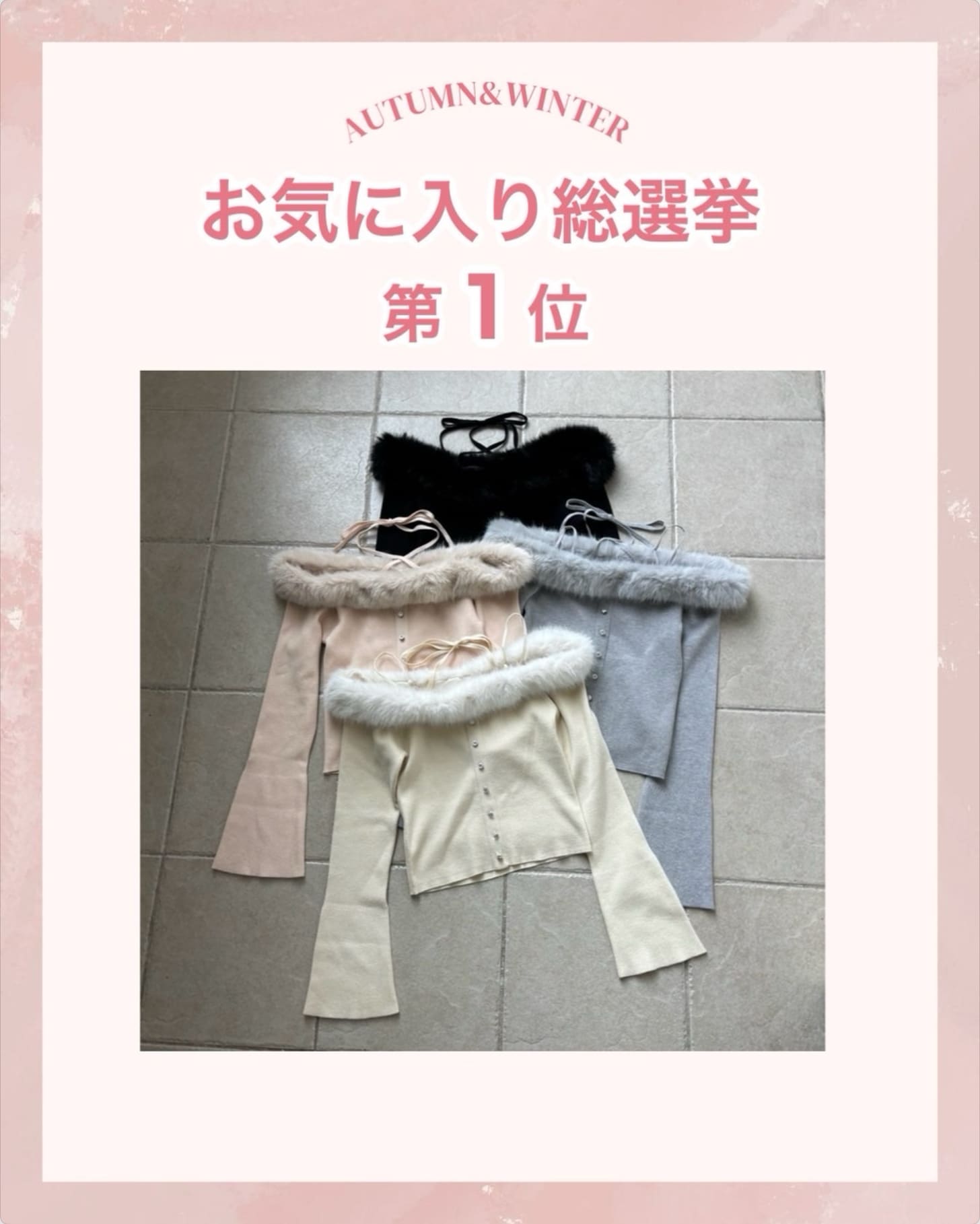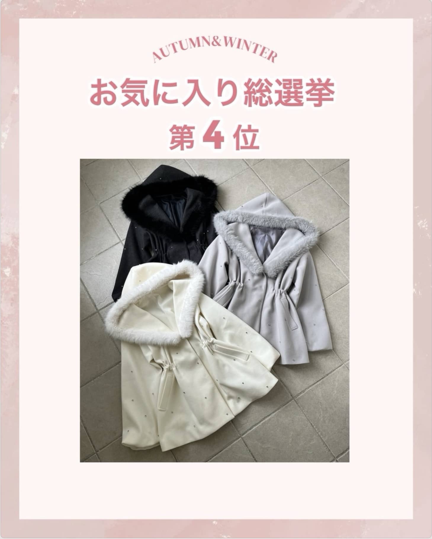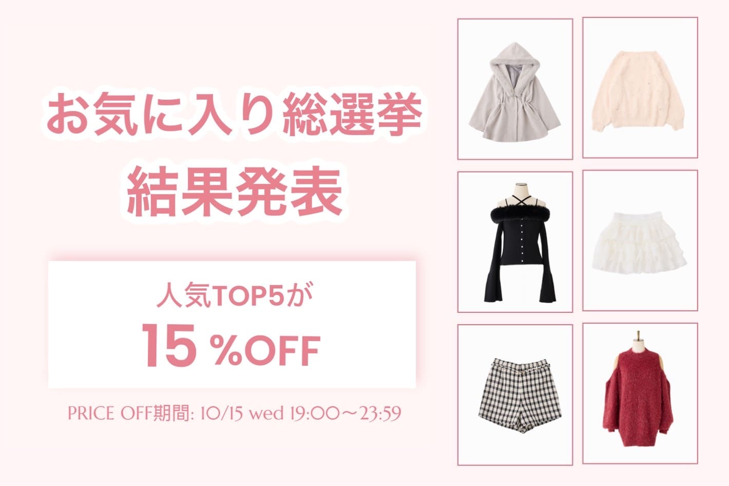 2025.10.14 NEW one after another NICE CLAUP(ワンアフターアナザー ナイスクラップ)【結果発表】お気に入り総選挙TOP5 お得に買える期間:10/15(水)19:00~23:59まで ぜひ、お得な期間中にGETしてくださいね♪ その他の新作アイテム一覧はこちら 販売前 予約 手洗い可 one after another NICE CLAUP 【お気に入り総選挙1位】キラキラボタンファーオフショルニット ¥7,920 販売前 予約 one after another NICE CLAUP 【お気に入り総選挙5位】肩あきビジューニットミニワンピ ¥9,350 販売前 予約 one after another NICE CLAUP 【お気に入り総選挙2位】 ビジューシャギーニット ¥6,930 販売前 予約 one after another NICE CLAUP 【お気に入り総選挙4位】フードフェイクファービジューミドルコート ¥16,500 販売前 予約 手洗い可 one after another NICE CLAUP 【お気に入り総選挙3位】フリルミニスカート ¥6,930 2025.10.14 NEW one after another NICE CLAUP 【買うほどお得♥】スタッフ考案アイテム!セットフェア開催 2025.10.11 NEW one after another NICE CLAUP 予告【PALCLOSET限定復活】ノベルティフェア開催決定! 2025.10.10 one after another NICE CLAUP 【後日15%OFF】お気に入り総選挙開催! 2025.10.10 one after another NICE CLAUP YouTube更新/スタッフ3人が冬服をプロデュースしてみた!❄️ 2025.10.09 one after another NICE CLAUP 【徹底解説】スタッフ考案アイテム♥ 2025.10.09 one after another NICE CLAUP 2025パルクロウィークスケジュール 2025.10.08 one after another NICE CLAUP 【新作情報!】9月の販売開始アイテム 2025.10.07 one after another NICE CLAUP PEANUTS×one after another NICE CLAUPコラボアイテム登場♪ ニュース一覧へ > < ニュース一覧へ >