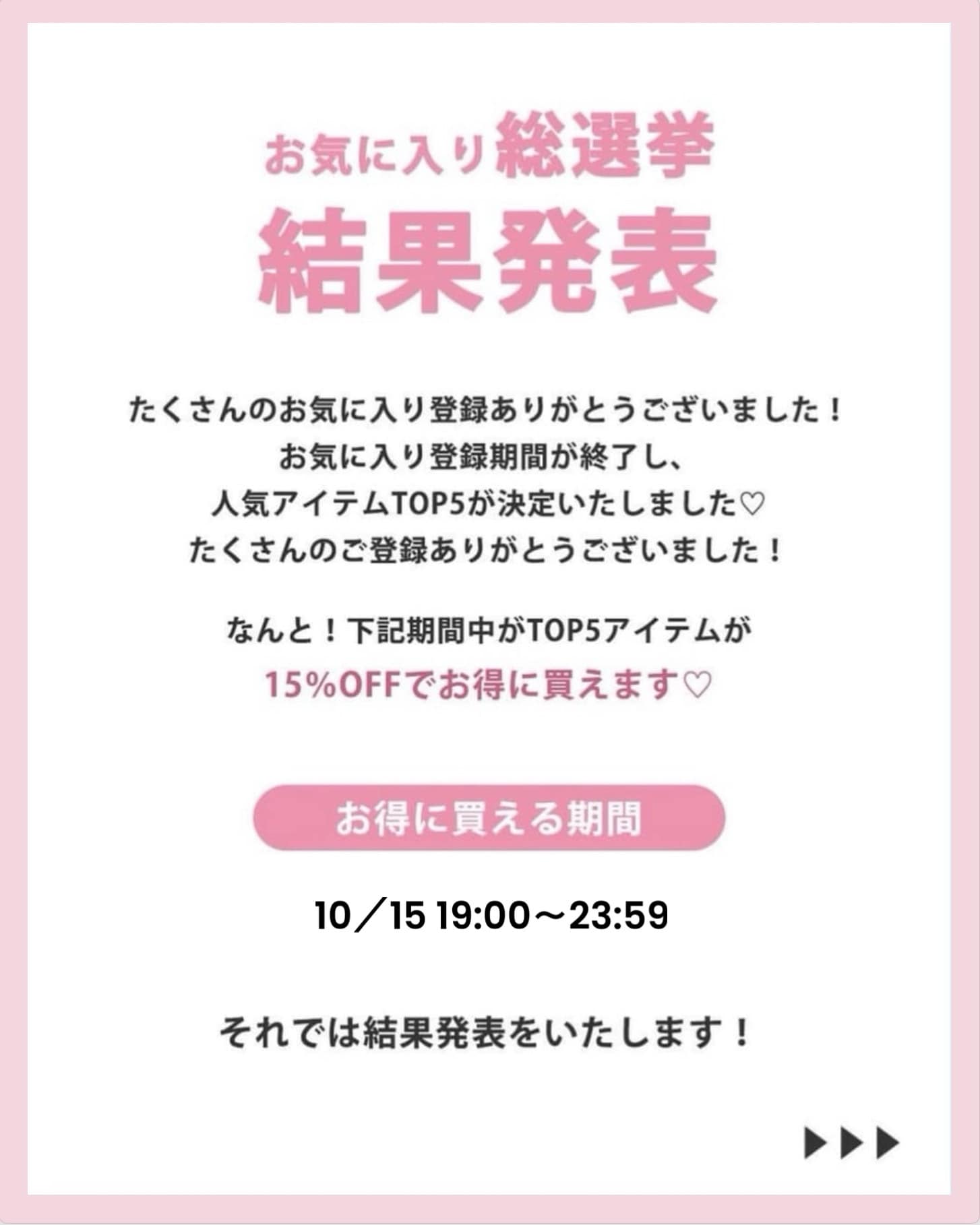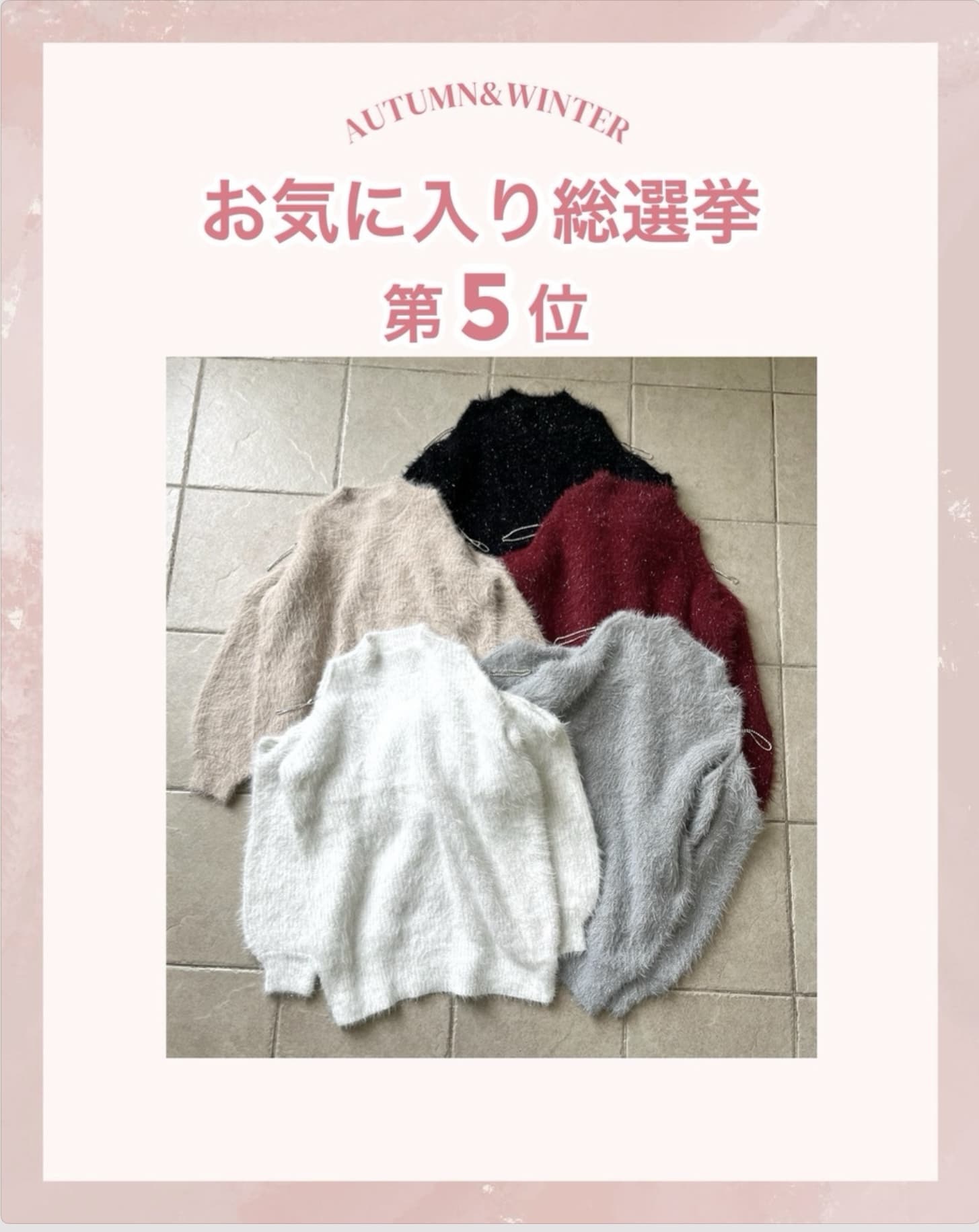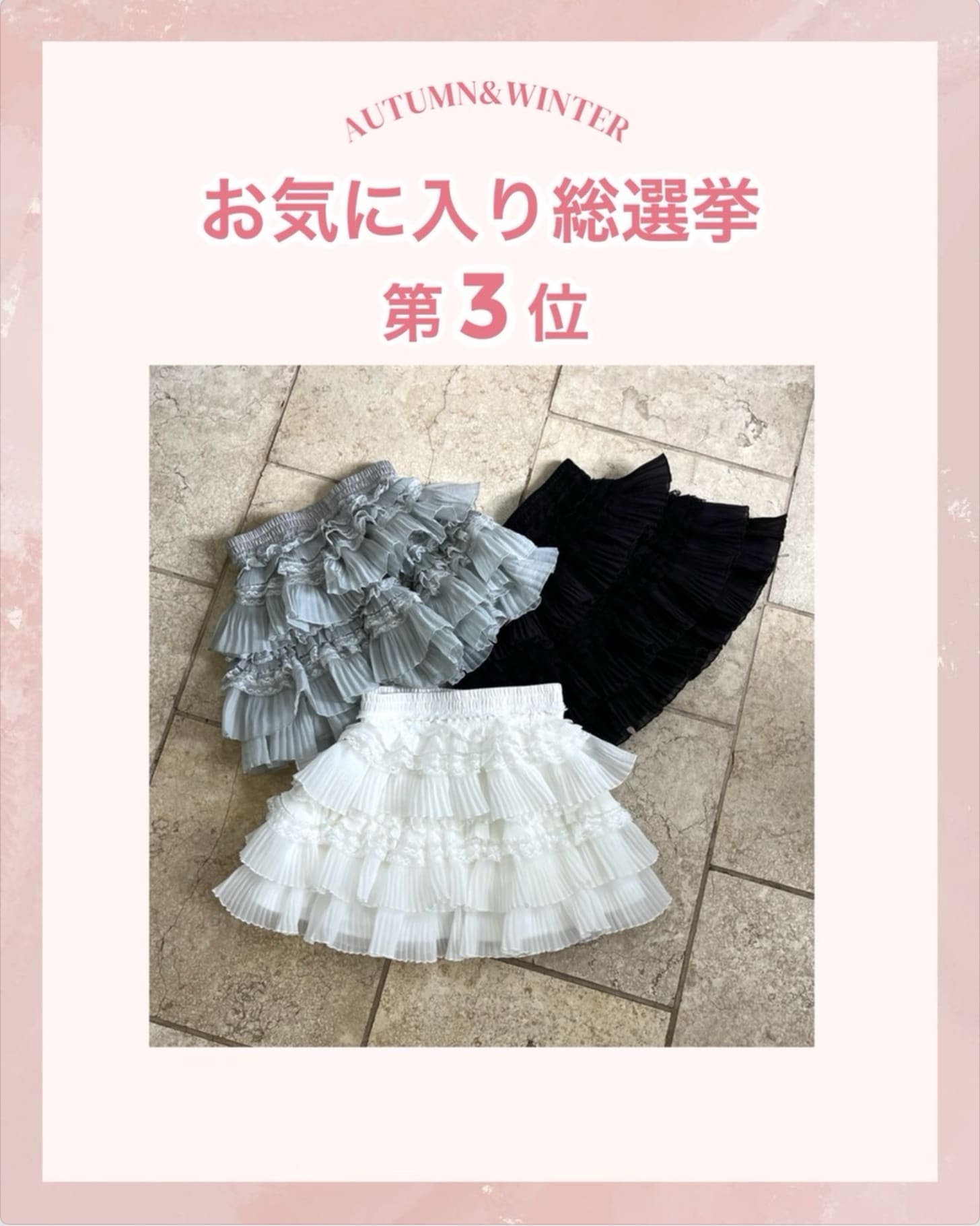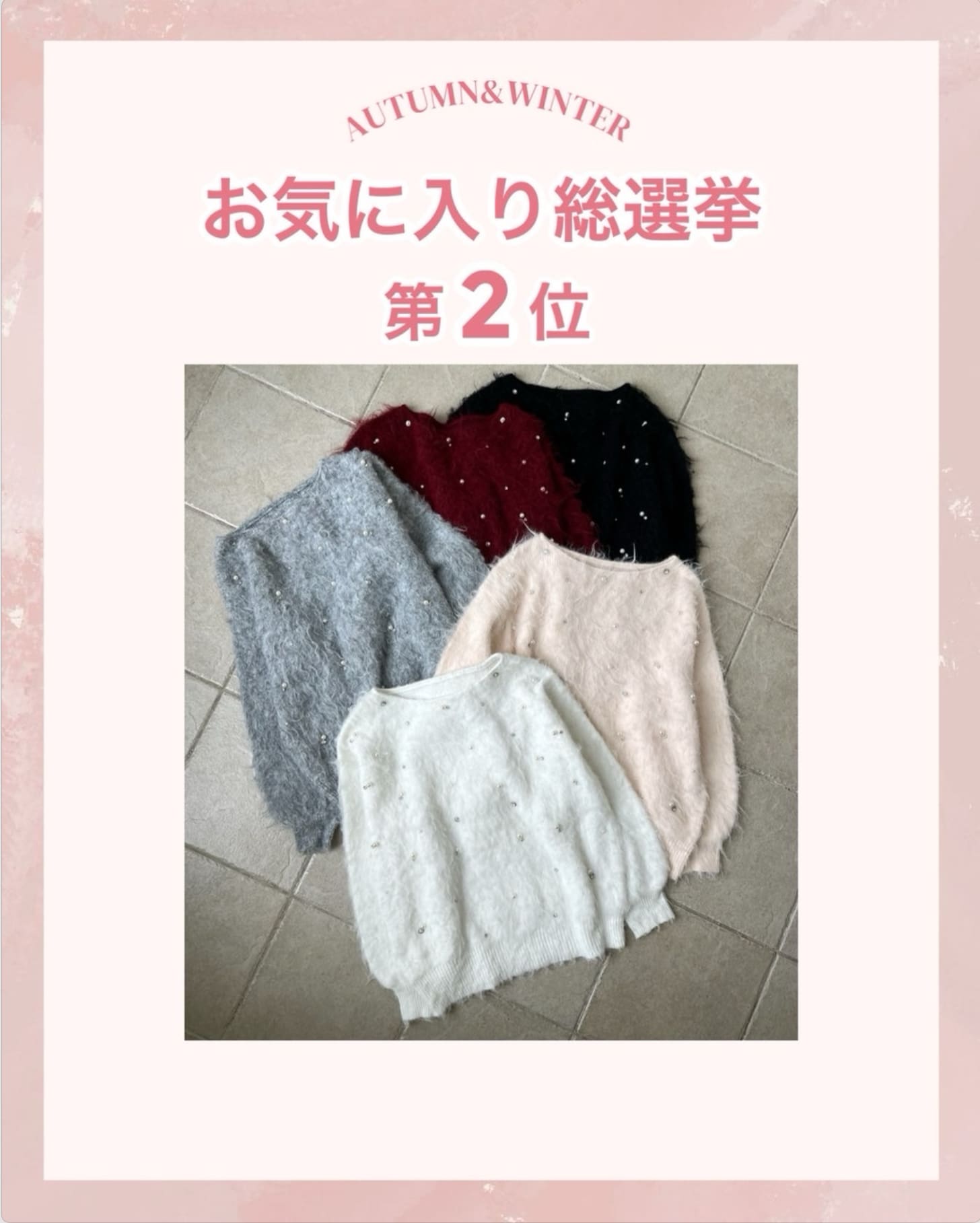 2025.10.14 NEW one after another NICE CLAUP(ワンアフターアナザー ナイスクラップ)【結果発表】お気に入り総選挙TOP5 お得に買える期間:10/15(水)19:00~23:59まで ぜひ、お得な期間中にGETしてくださいね♪ その他の新作アイテム一覧はこちら 販売前 予約 手洗い可 one after another NICE CLAUP 【お気に入り総選挙1位】キラキラボタンファーオフショルニット ¥7,920 販売前 予約 one after another NICE CLAUP 【お気に入り総選挙5位】肩あきビジューニットミニワンピ ¥9,350 販売前 予約 one after another NICE CLAUP 【お気に入り総選挙2位】 ビジューシャギーニット ¥6,930 販売前 予約 one after another NICE CLAUP 【お気に入り総選挙4位】フードフェイクファービジューミドルコート ¥16,500 販売前 予約 手洗い可 one after another NICE CLAUP 【お気に入り総選挙3位】フリルミニスカート ¥6,930 2025.10.14 NEW one after another NICE CLAUP 【買うほどお得♥】スタッフ考案アイテム!セットフェア開催 2025.10.11 NEW one after another NICE CLAUP 予告【PALCLOSET限定復活】ノベルティフェア開催決定! 2025.10.10 one after another NICE CLAUP 【後日15%OFF】お気に入り総選挙開催! 2025.10.10 one after another NICE CLAUP YouTube更新/スタッフ3人が冬服をプロデュースしてみた!❄️ 2025.10.09 one after another NICE CLAUP 【徹底解説】スタッフ考案アイテム♥ 2025.10.09 one after another NICE CLAUP 2025パルクロウィークスケジュール 2025.10.08 one after another NICE CLAUP 【新作情報!】9月の販売開始アイテム 2025.10.07 one after another NICE CLAUP PEANUTS×one after another NICE CLAUPコラボアイテム登場♪ ニュース一覧へ > < ニュース一覧へ >