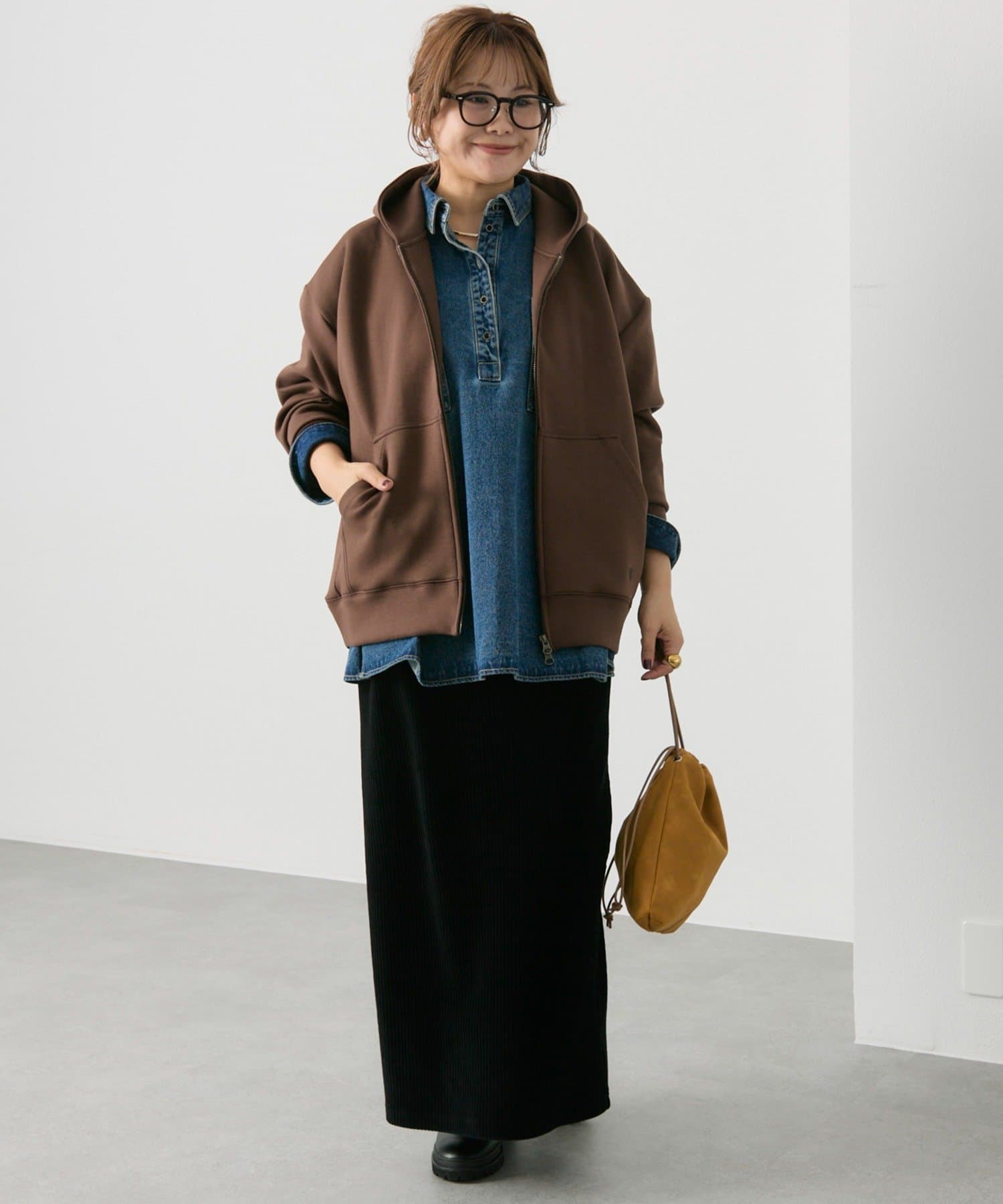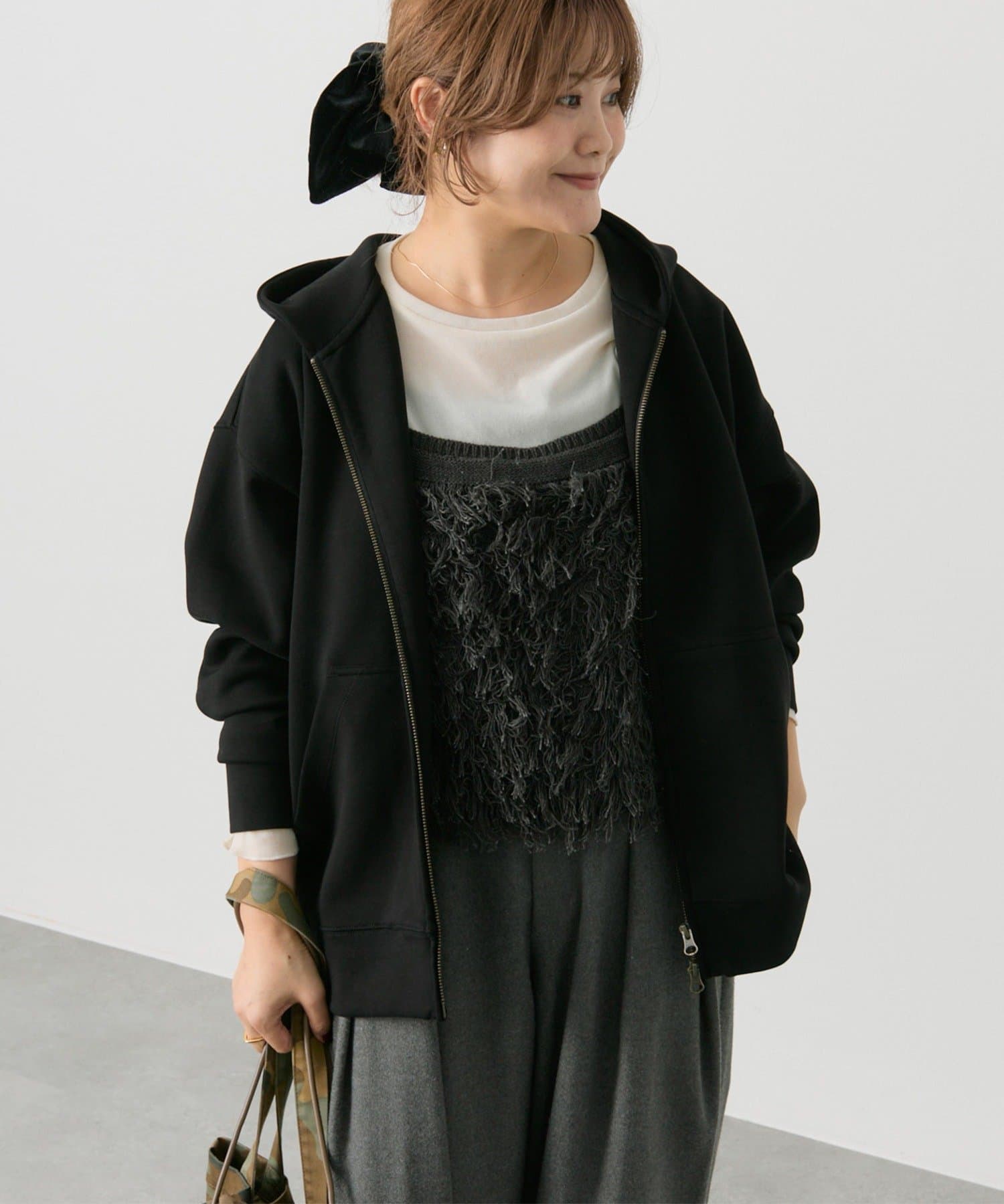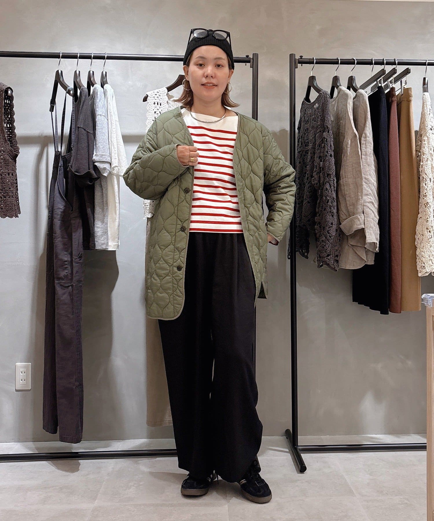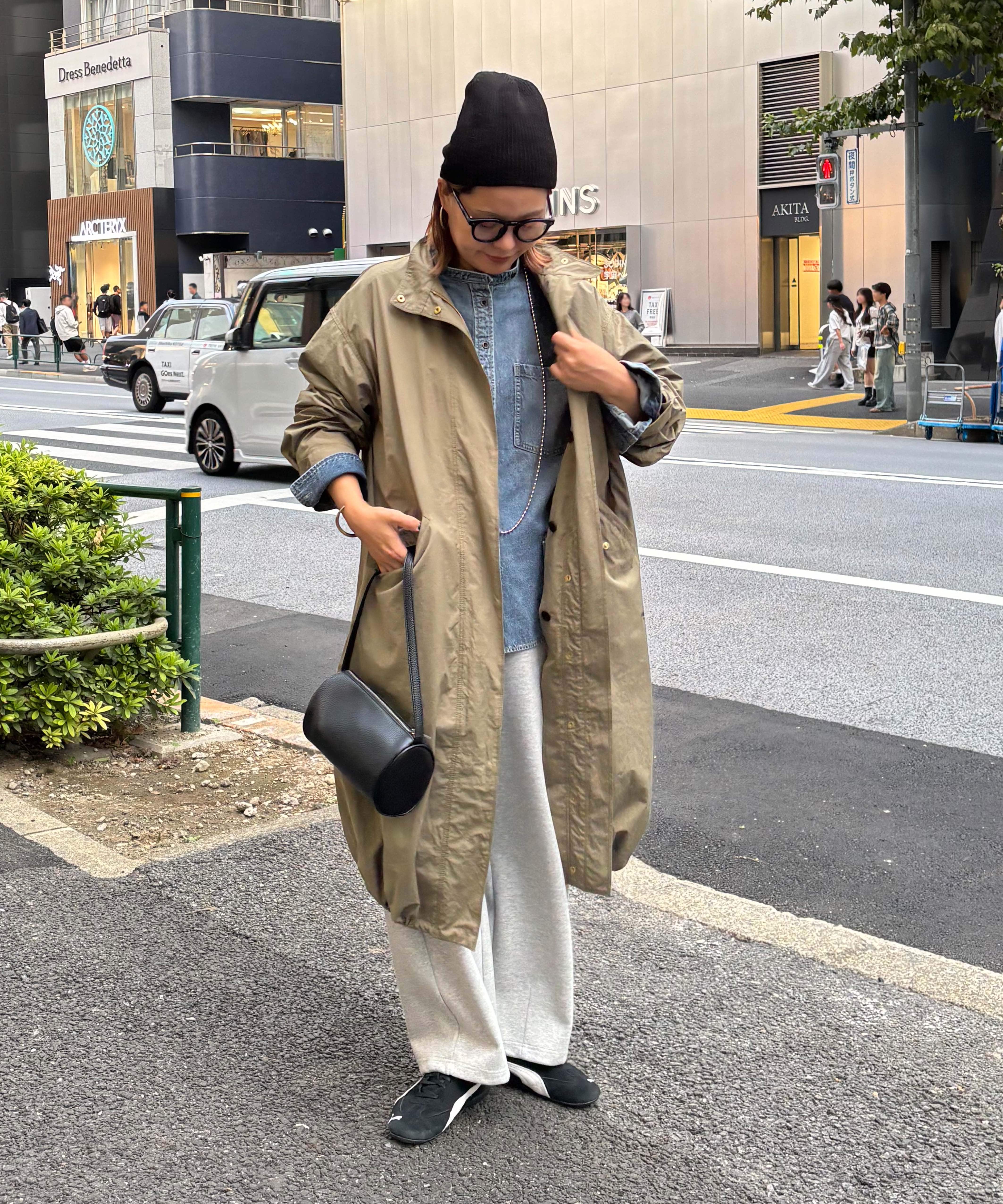 体型カバー抜群の着丈ですが抜け感が出るように、