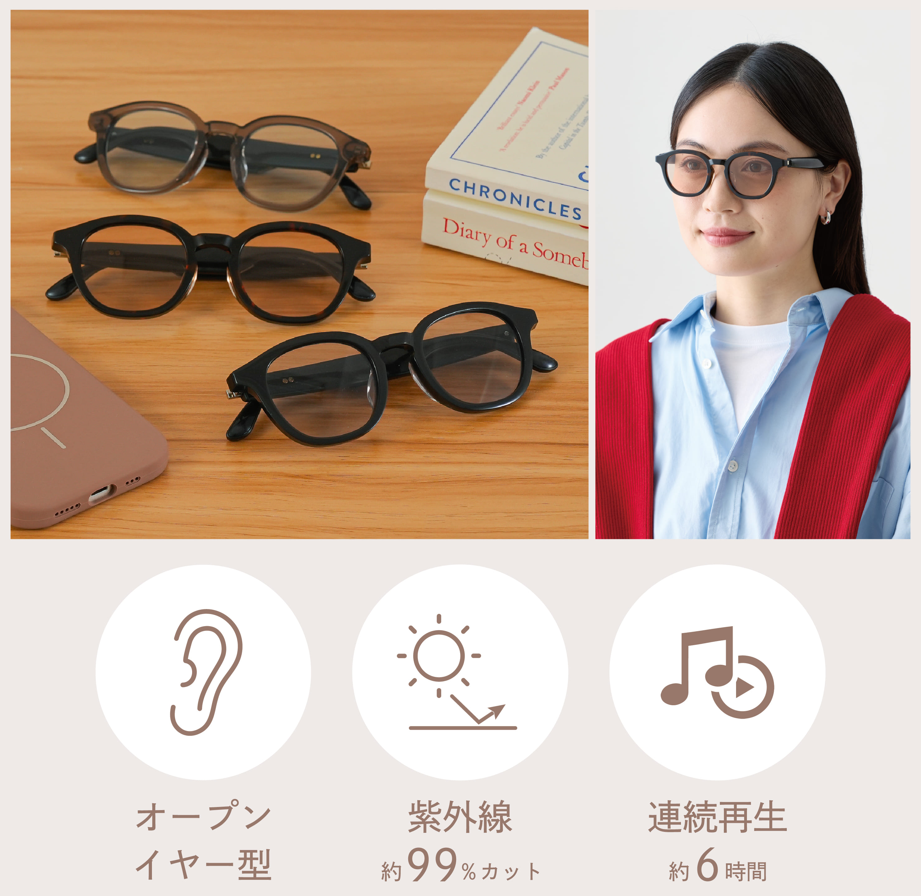 耳をふさがないため、周囲の音を聞きながら音楽や通話が楽しめます。 紫外線カット率は約99%で、屋外でのウォーキングや運動、お出かけの際におすすめです。