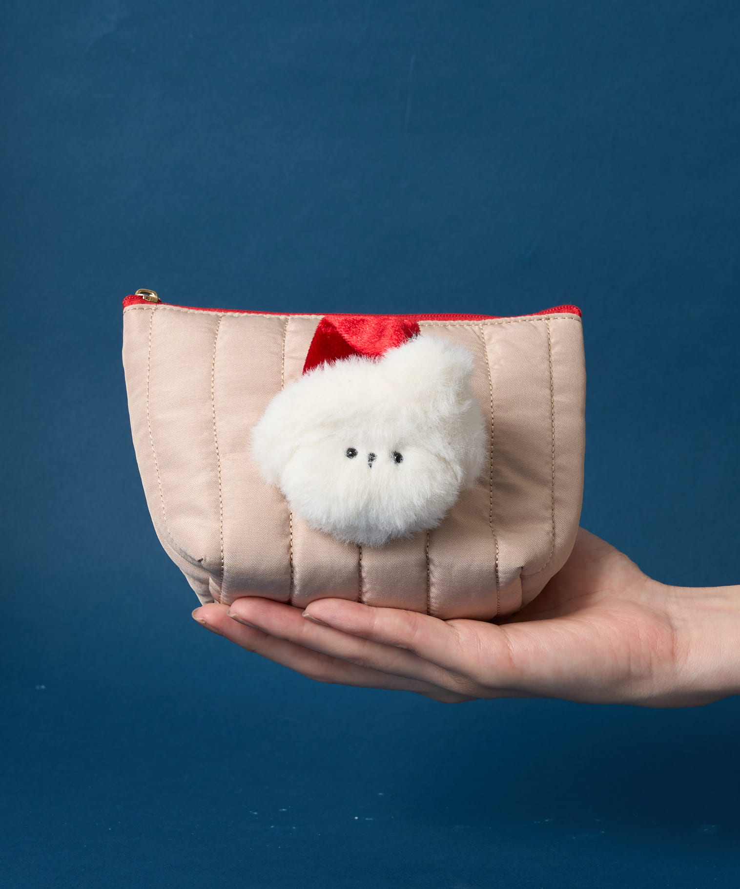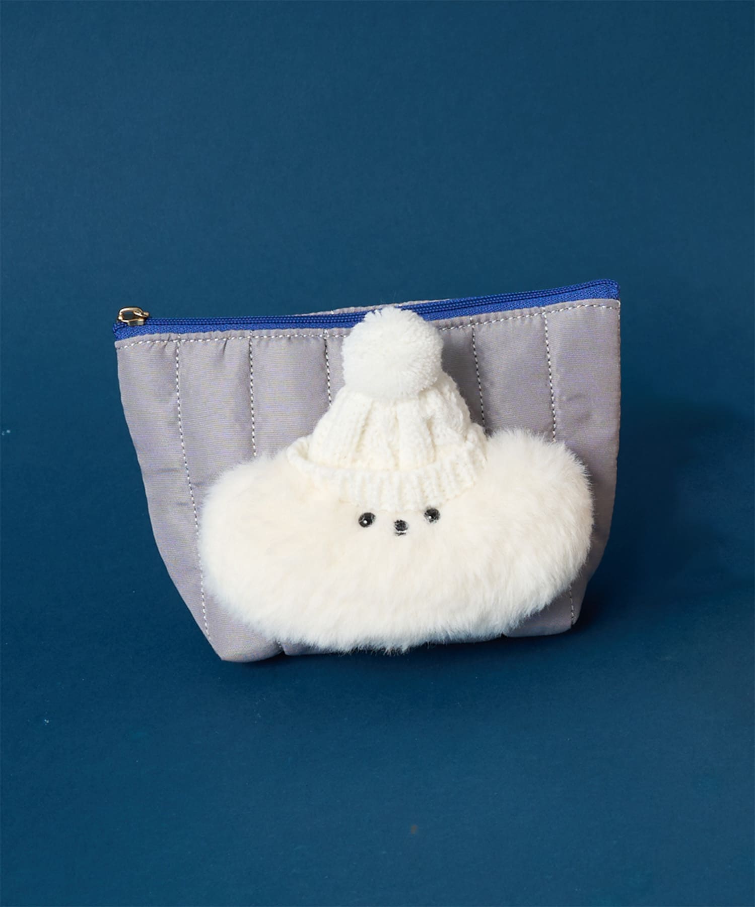 キルト風の生地を使用した冬らしい温かみを感じるアイテム。特徴はポーチから飛び出したフェイスマスコット! ふわふわしたさわり心地で、みんなの話題になること間違いなしの存在感です♪