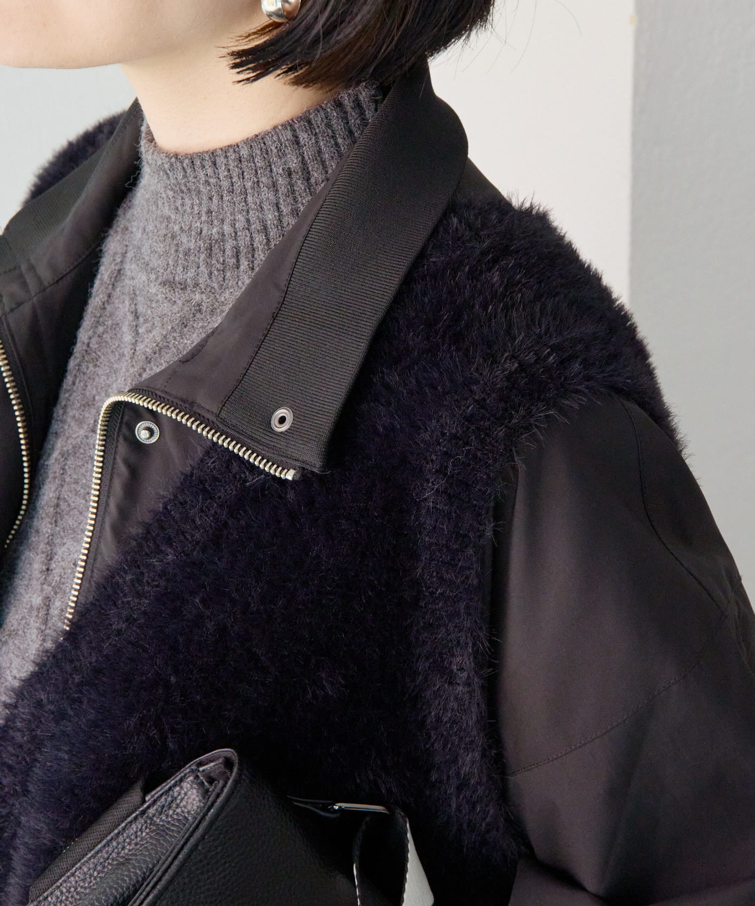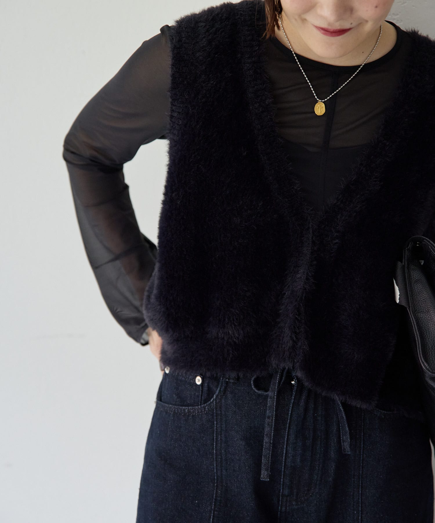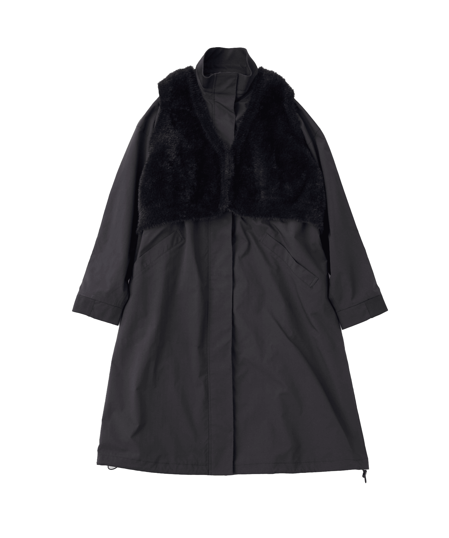 - ベストを上に重ねたレイヤードスタイル。コートだけで着るよりもデザイン性がプラスされて、見た目も暖かに。