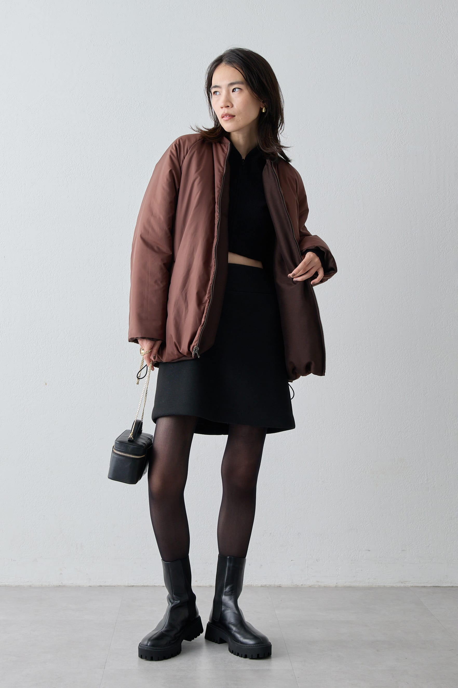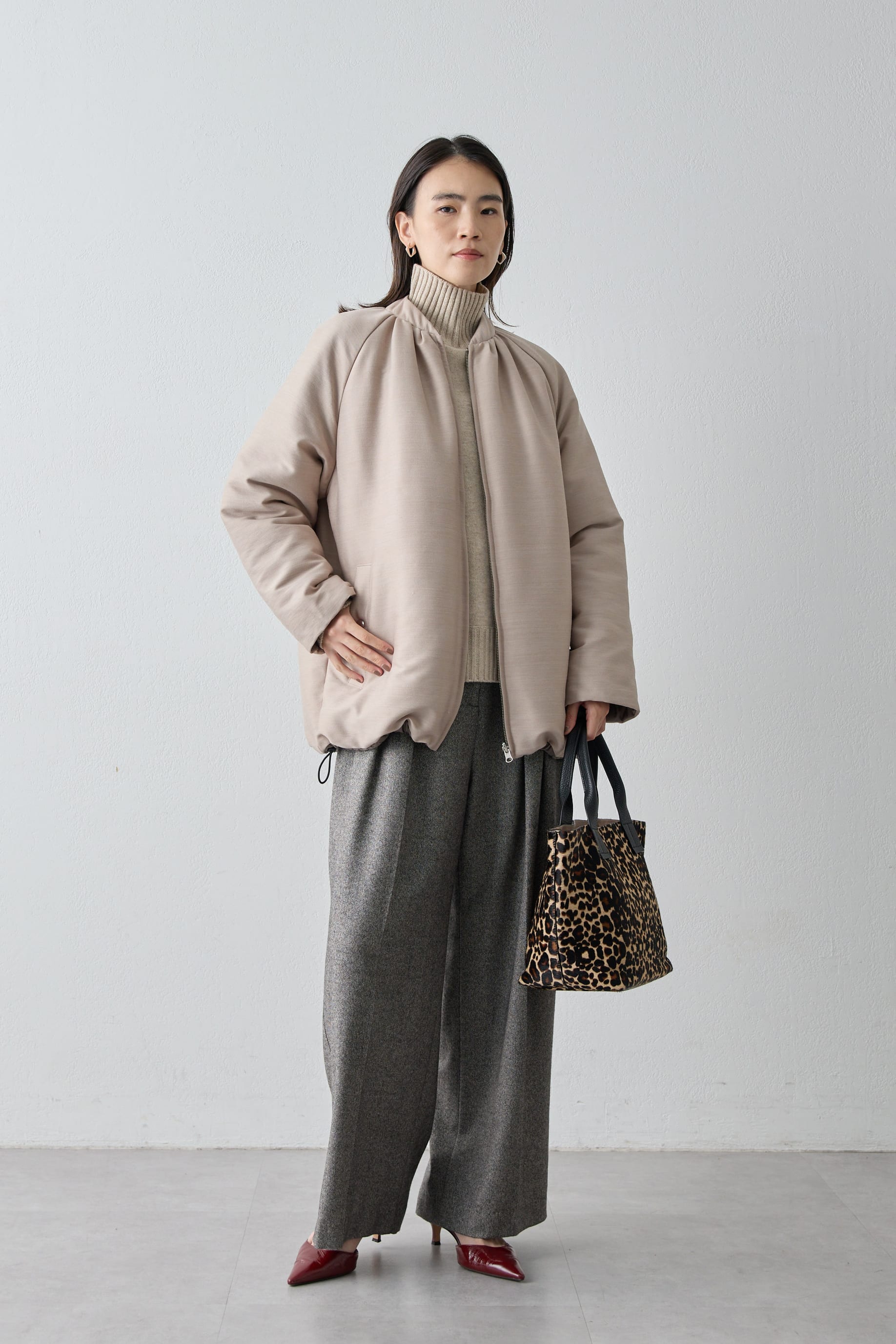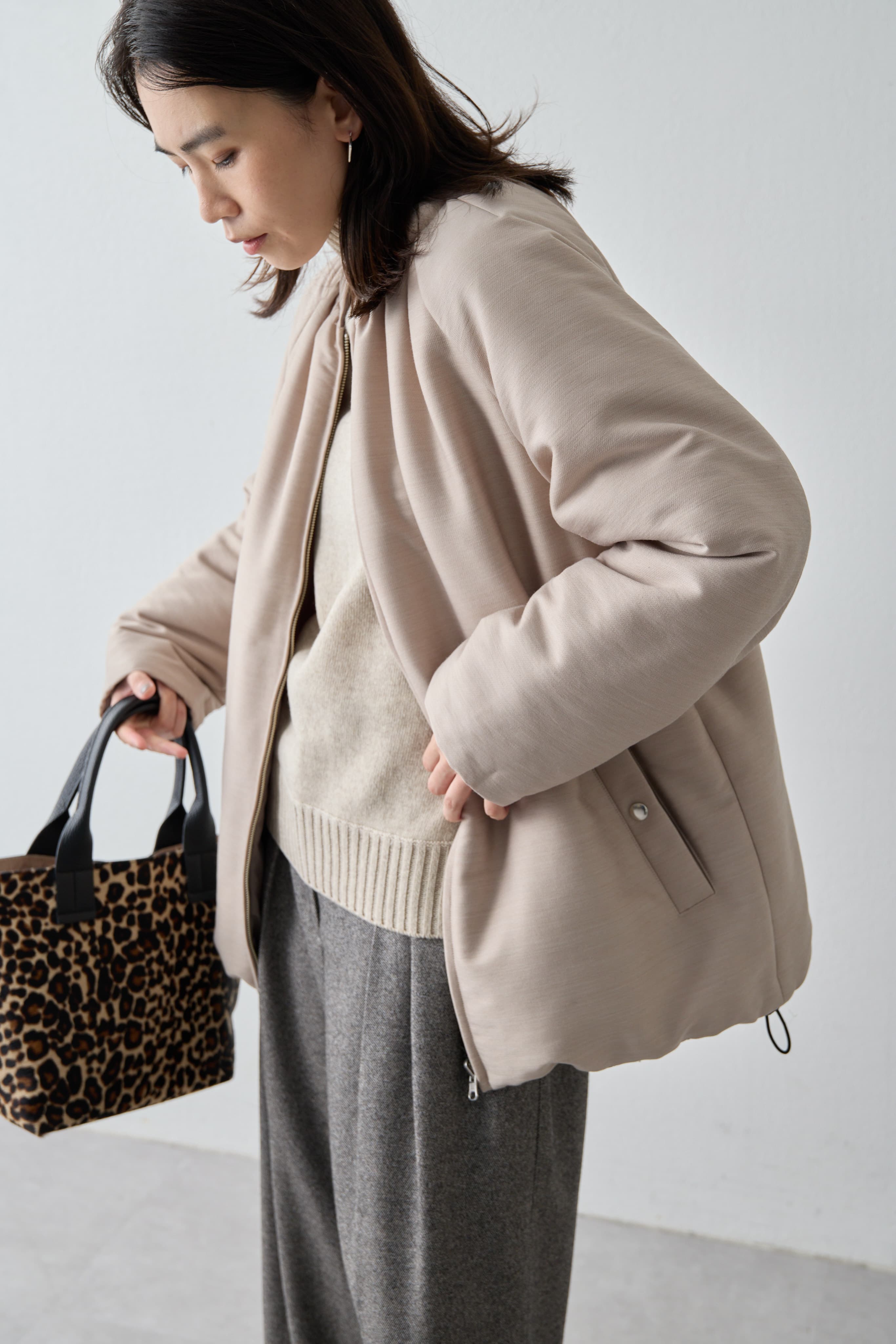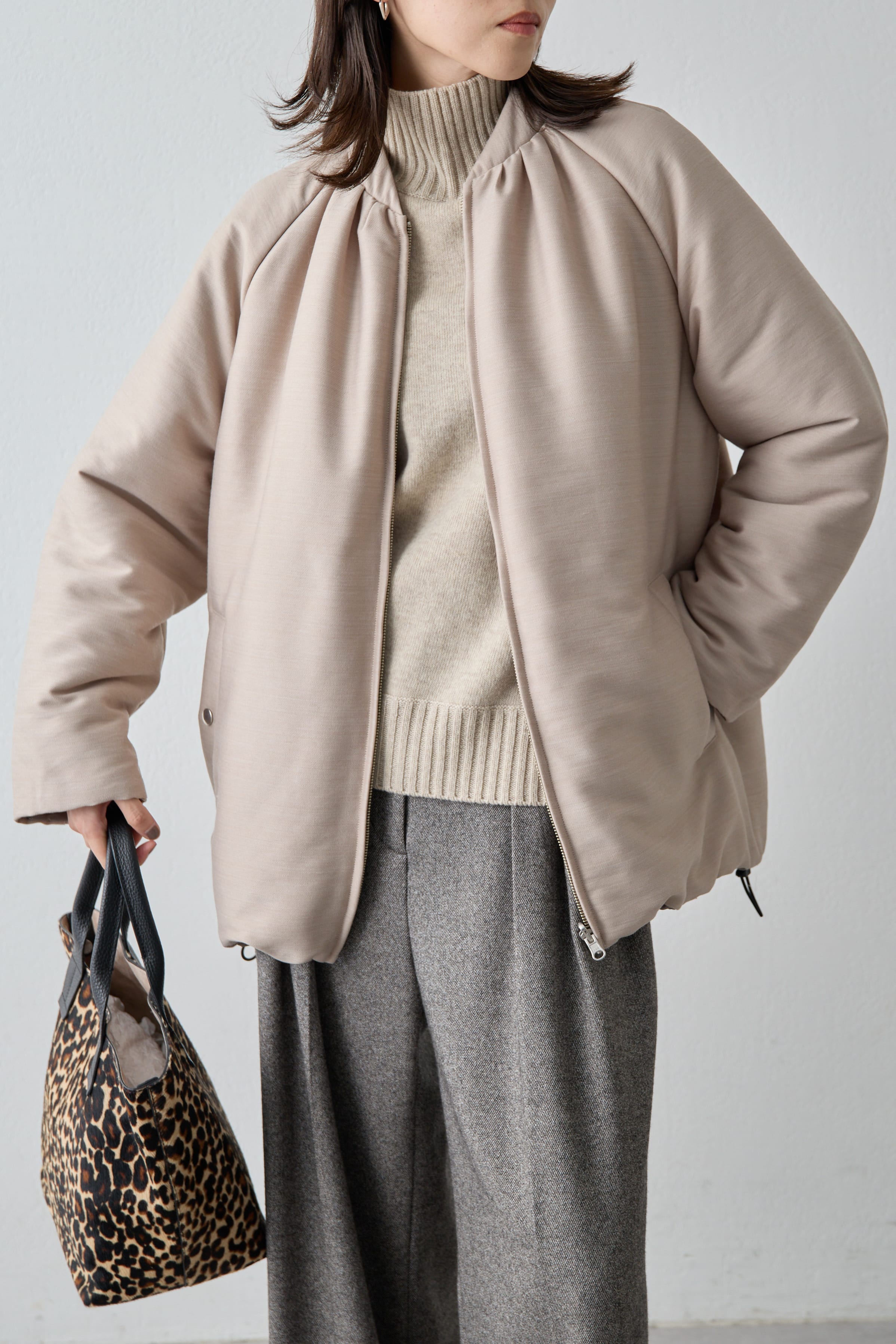 MA-1を思わせるモードなルックスと、襟元にギャザーを寄せたフェミニンな表情。