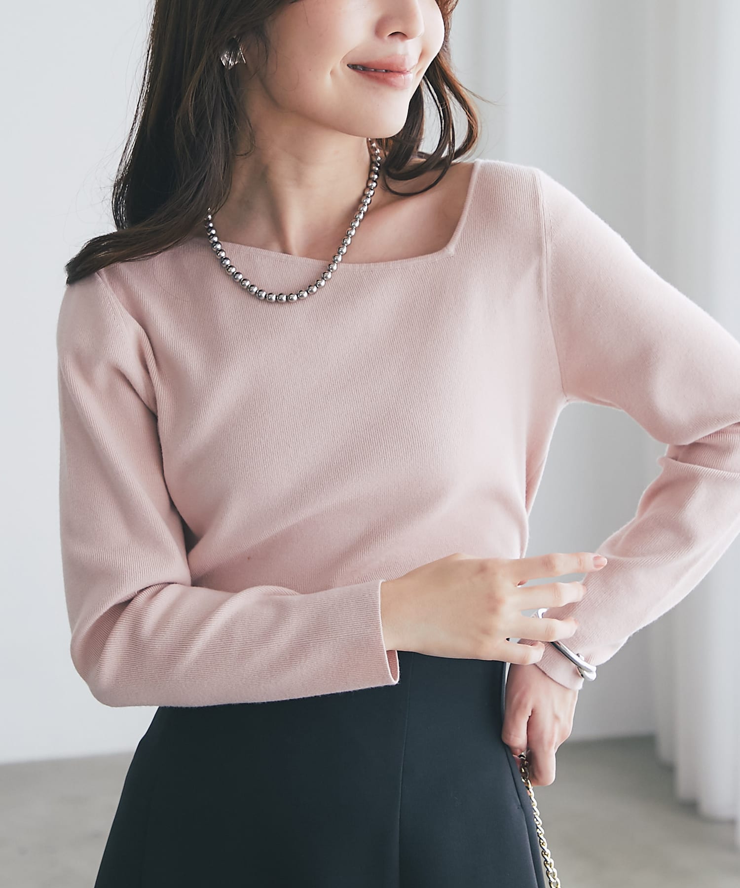 ・首元はノーカラーですっきりと女性らしく。