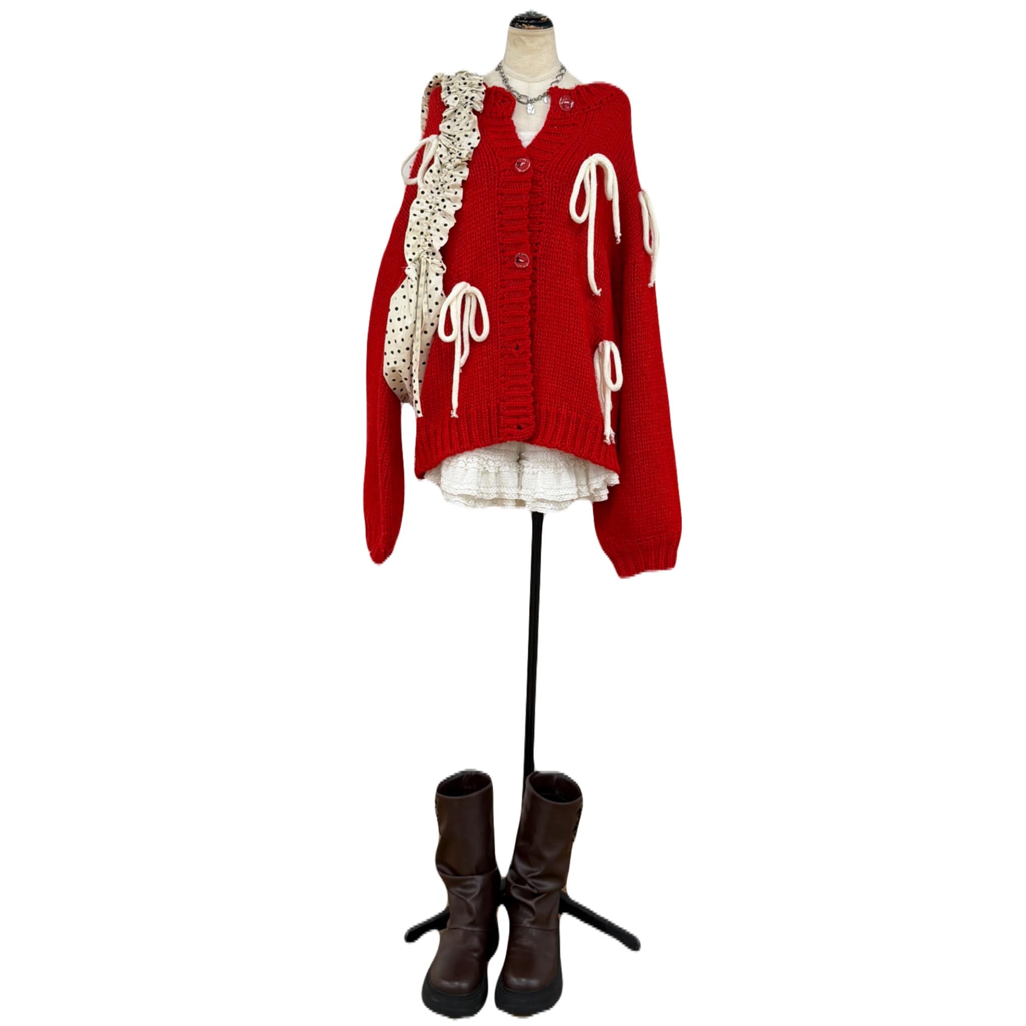 赤のニットは元気も出るしリボンがでテンションもUP!