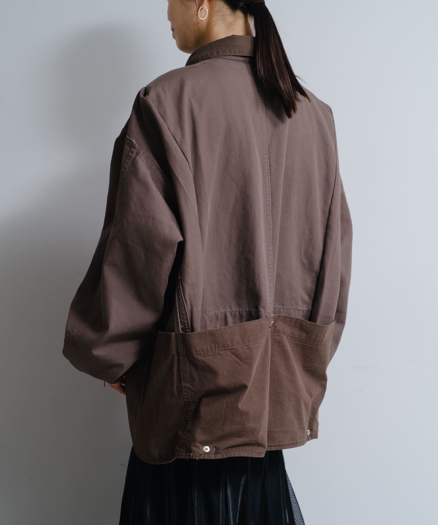 縫い留め位置をアレンジして、持つと間口が垂れてドレープがでて動きのあるデザインに設定しています。エプロンの名残を残し、紐を腰に巻いてウエストバッグのようにも使っていただける仕様。