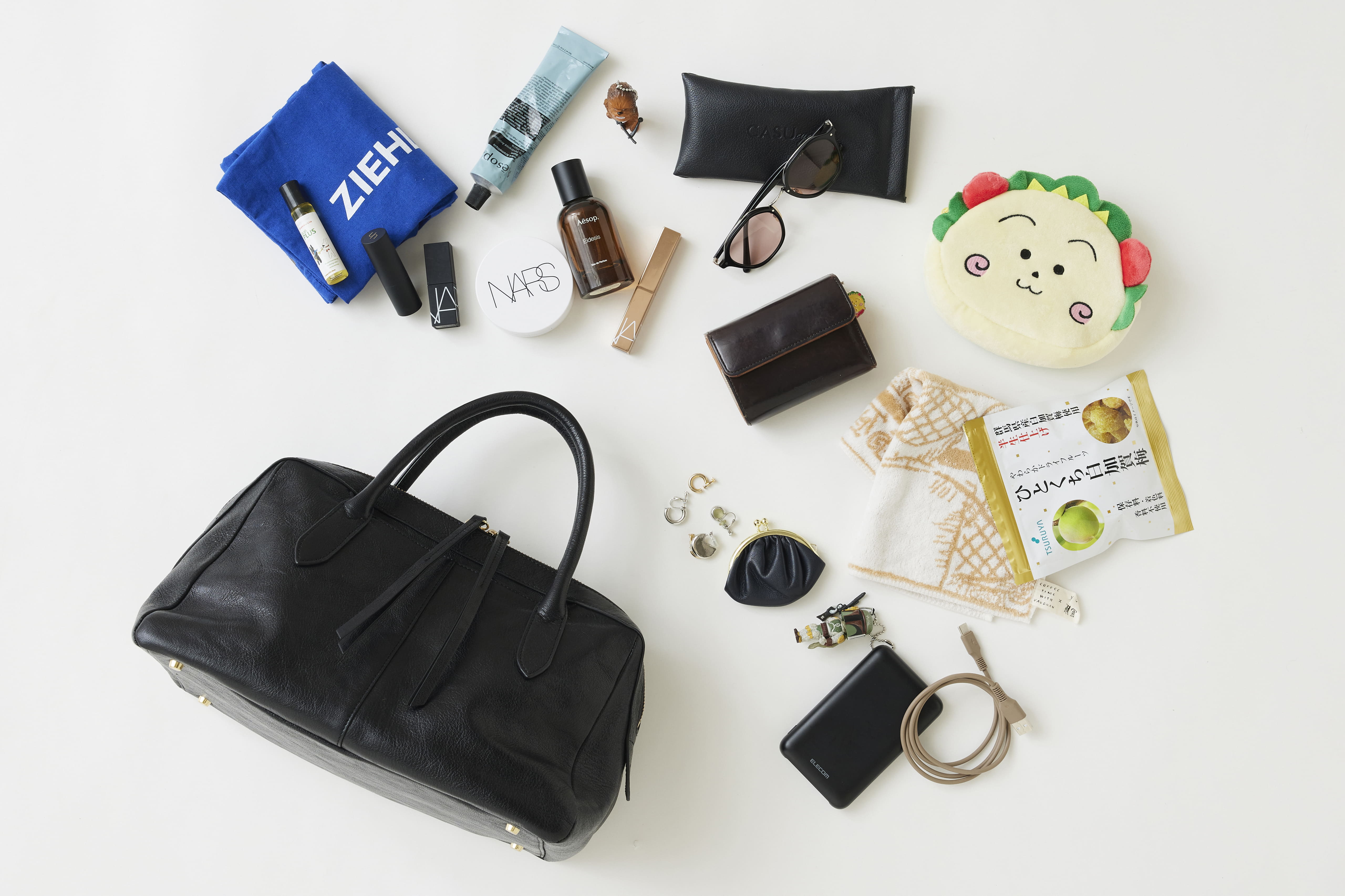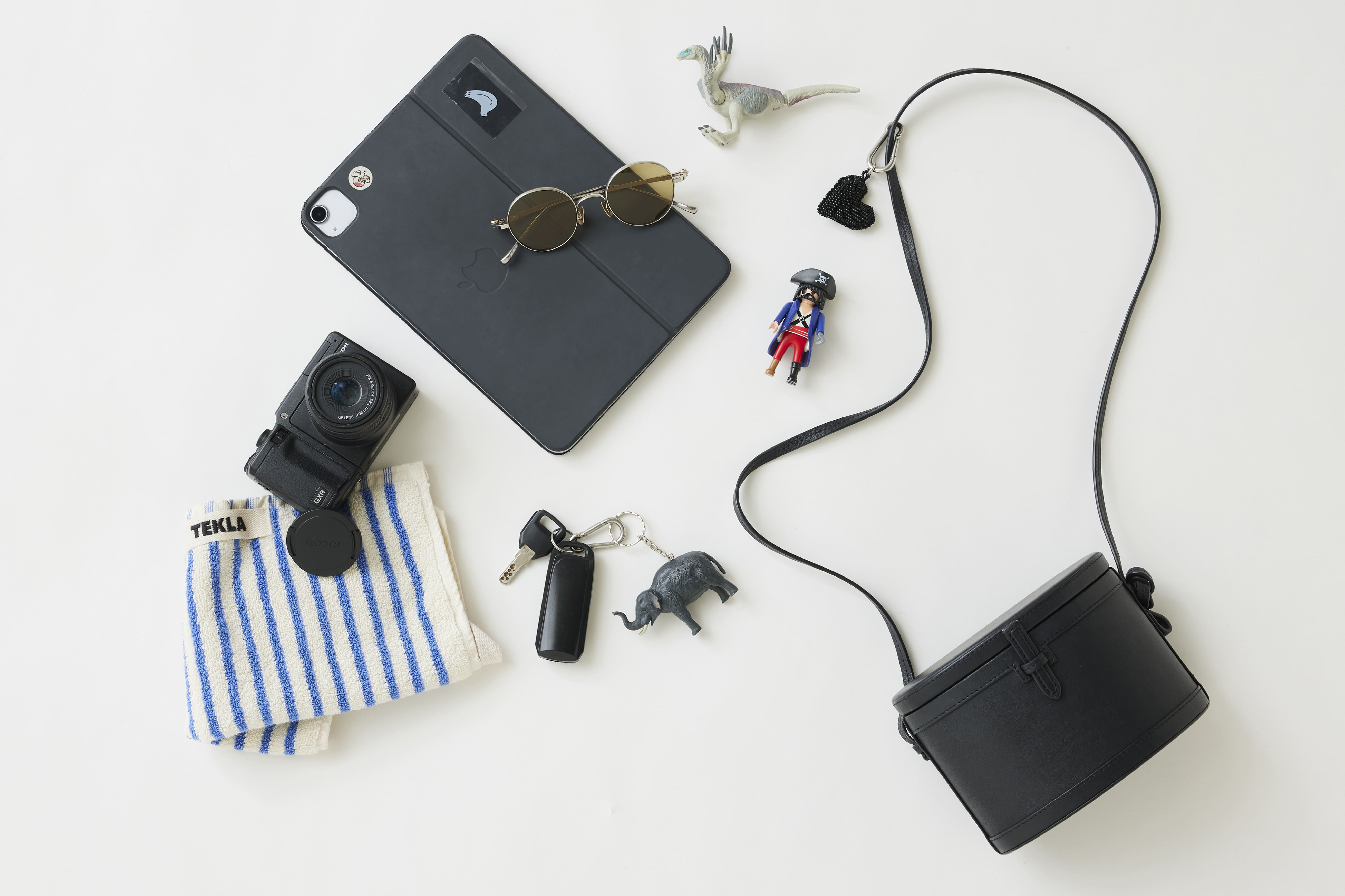 黒を基調に、日常を軽やかに整えるアイテムをセレクト。アイウェアは日差しを避けるだけでなく、“気分を切り替える”スイッチとしても活躍。iPadとカメラは、仕事でもオフでも頼れる相棒です。そして、息子のフィギュアはいつの間にか紛れ込んでいた、思わず笑みがこぼれる存在。笑