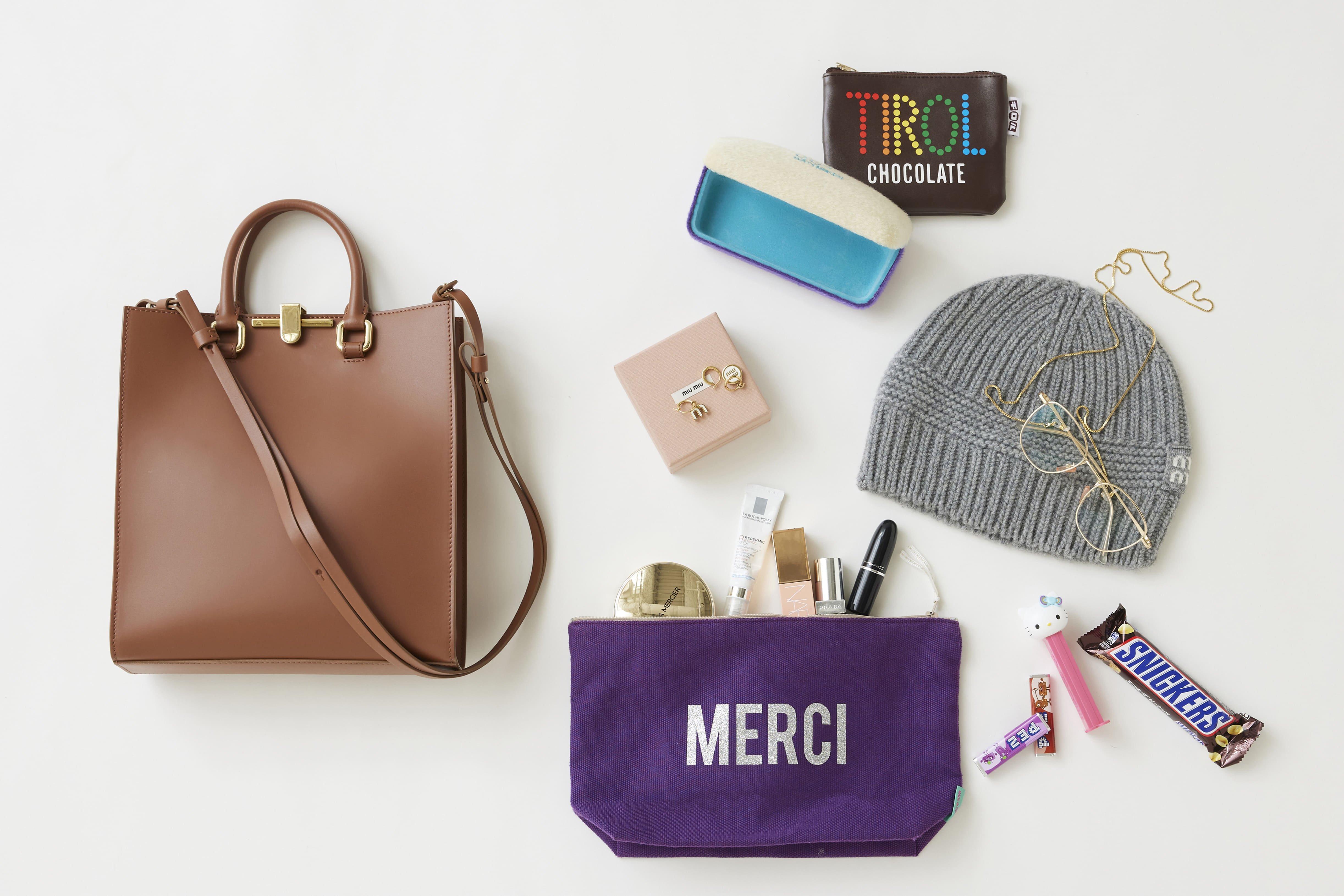 数年前に購入した【ZANCHETTI】のバッグ。スクエア型で、カジュアルスタイルをスマートに見せたいときによく持ちます。出張時にはメガネのセットも必須。コーデに合わせてメガネを変えるので、1本は必ず持ち歩きます。普段から大好きなスニッカーズは、パッケージの雰囲気も可愛くつい買ってしまうお菓子です♡