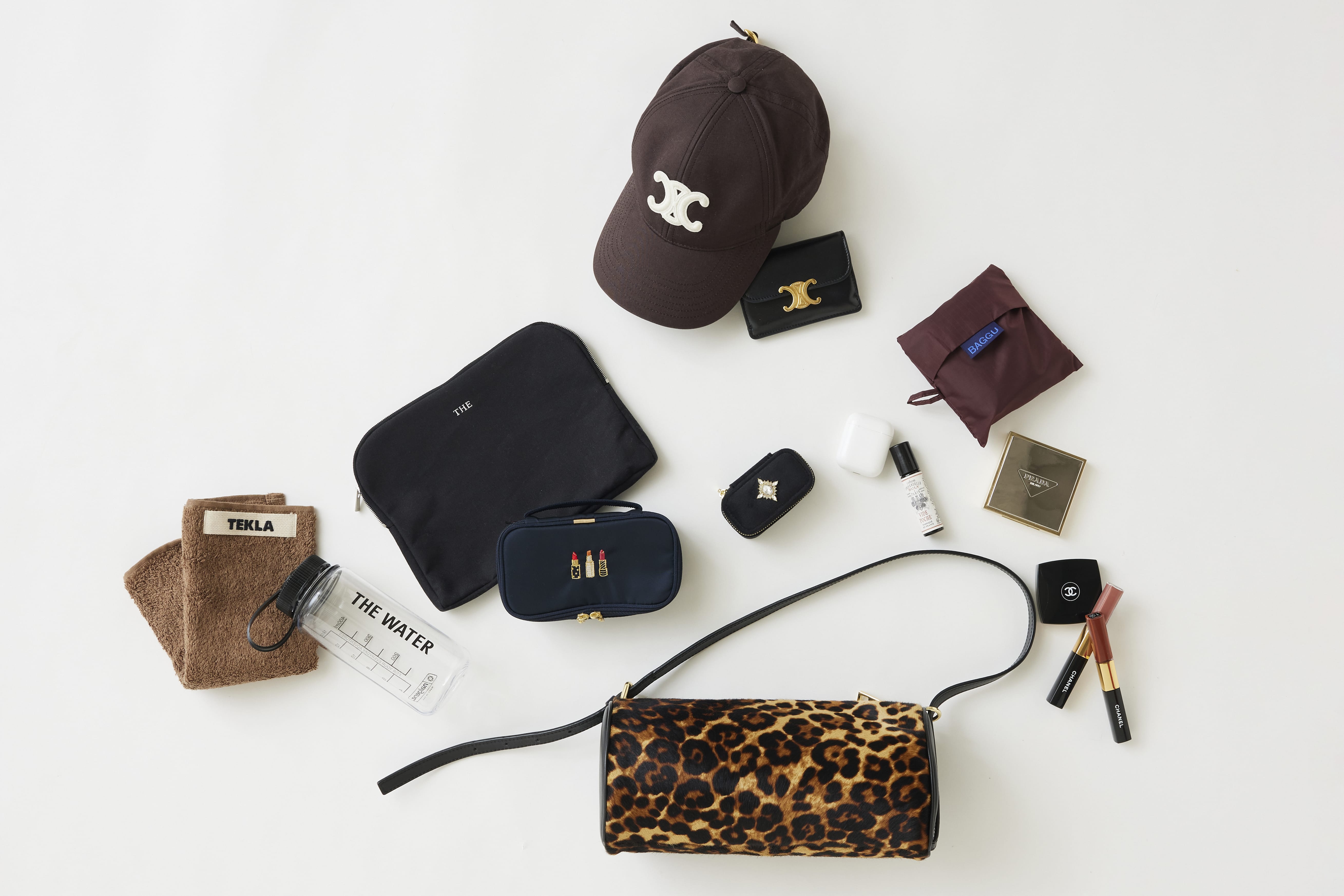 遊び心溢れるバッグが大好きなので、【Hoaw.】のヘアレザー2wayショルダーバッグをセレクト。きれいめにもカジュアルにもハマり、コーデの雰囲気に合わせて横長・縦長と形を変えられるのが魅力です。撮影が多いため、メイク道具はいつも多めに持ち歩いています。流行のコスメはスタッフや娘たちと情報を共有することも。バッグが小さい日は、財布もコンパクトに。美容のため、こまめに水分を摂るよう心がけています。