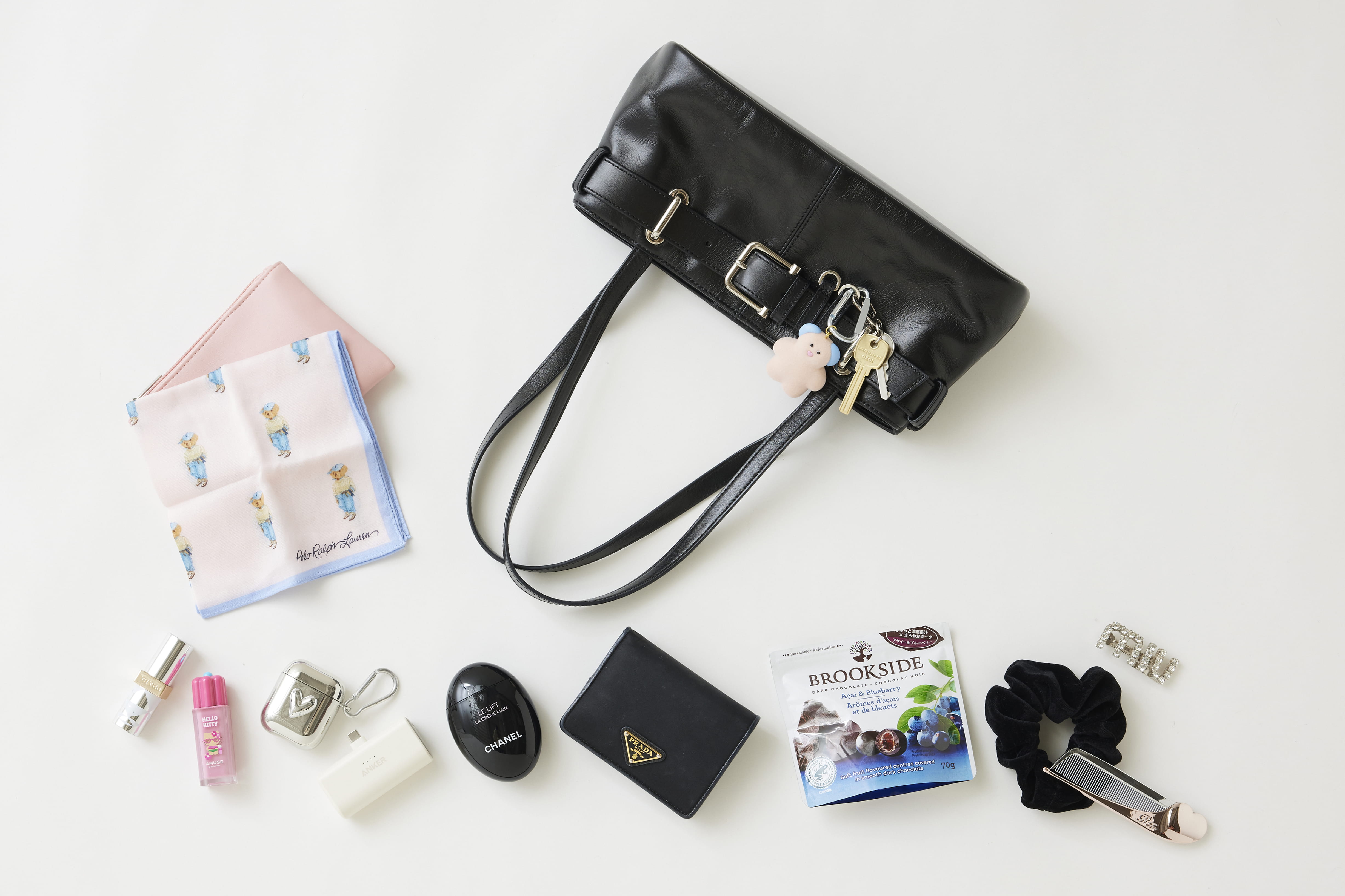 バッグは【Hoaw.】のボウリングバッグ。広めのマチで収納力があり、程よいボリューム感が出るのがお気に入りです。コーデや気分に合わせてリップの色を変えられるよう、普段から3〜4本を持ち歩いています。気分を上げてくれるキャラクターポーチや、好きな喫茶店「茶亭 羽當」とのコラボハンカチは特にお気に入り。最近ガチャガチャで手に入れたキーホルダーをバッグに付けて楽しんでいます。