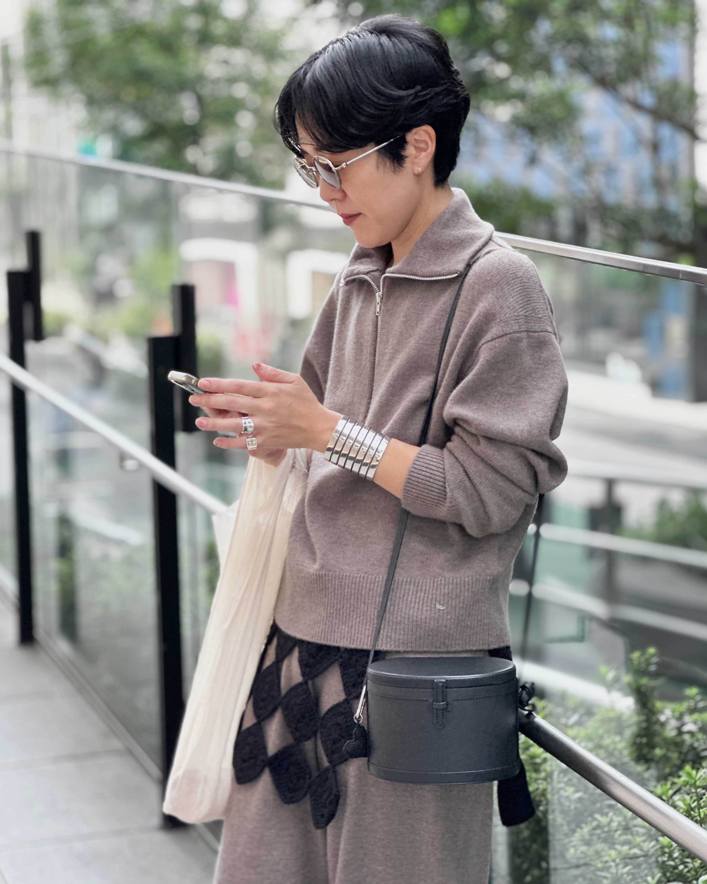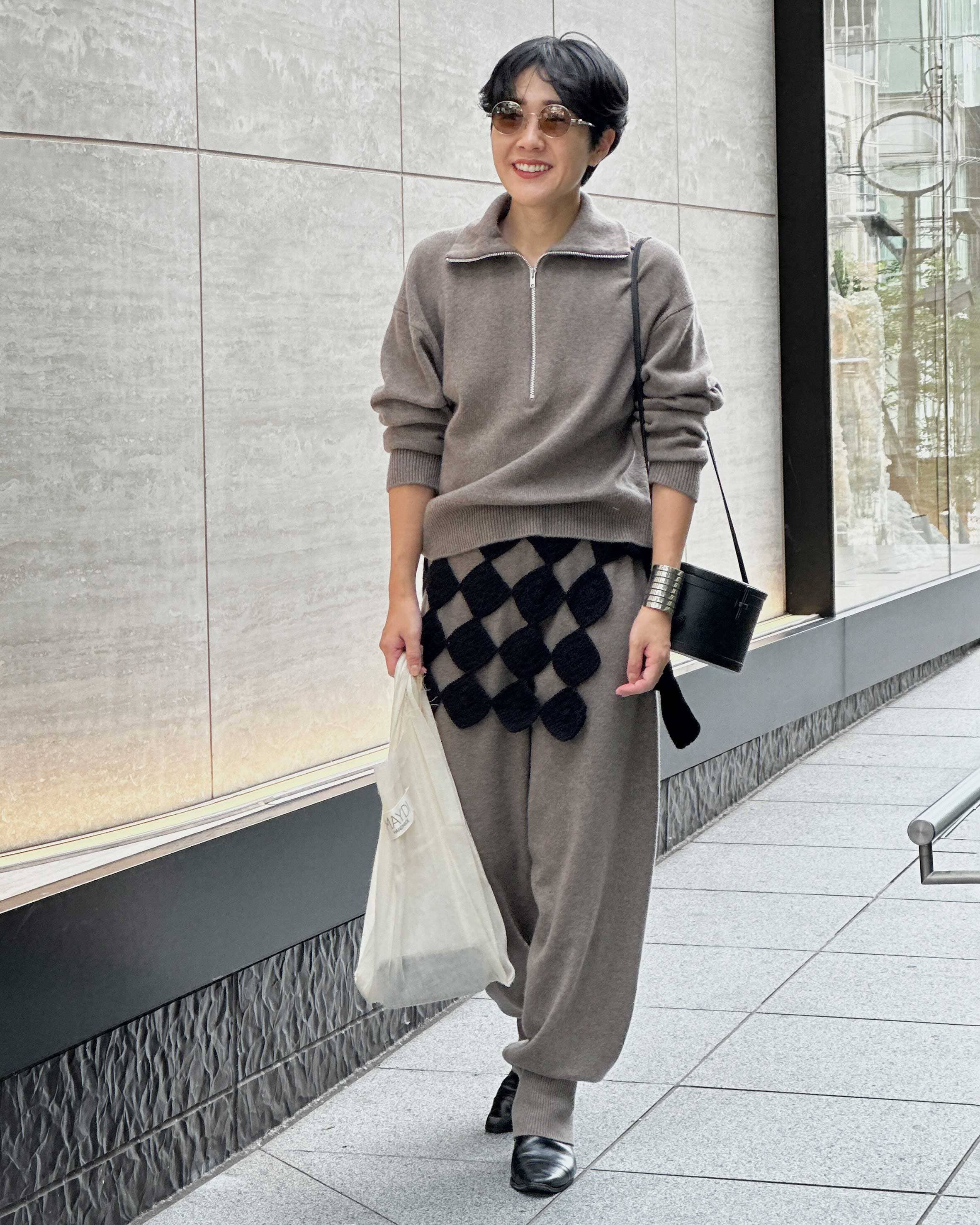 ハーフジップニットで抜け感を出しつつ、腰元の立体モチーフをアクセントに。ブラックの小物で全体を引き締め、都会的な印象に仕上げました。