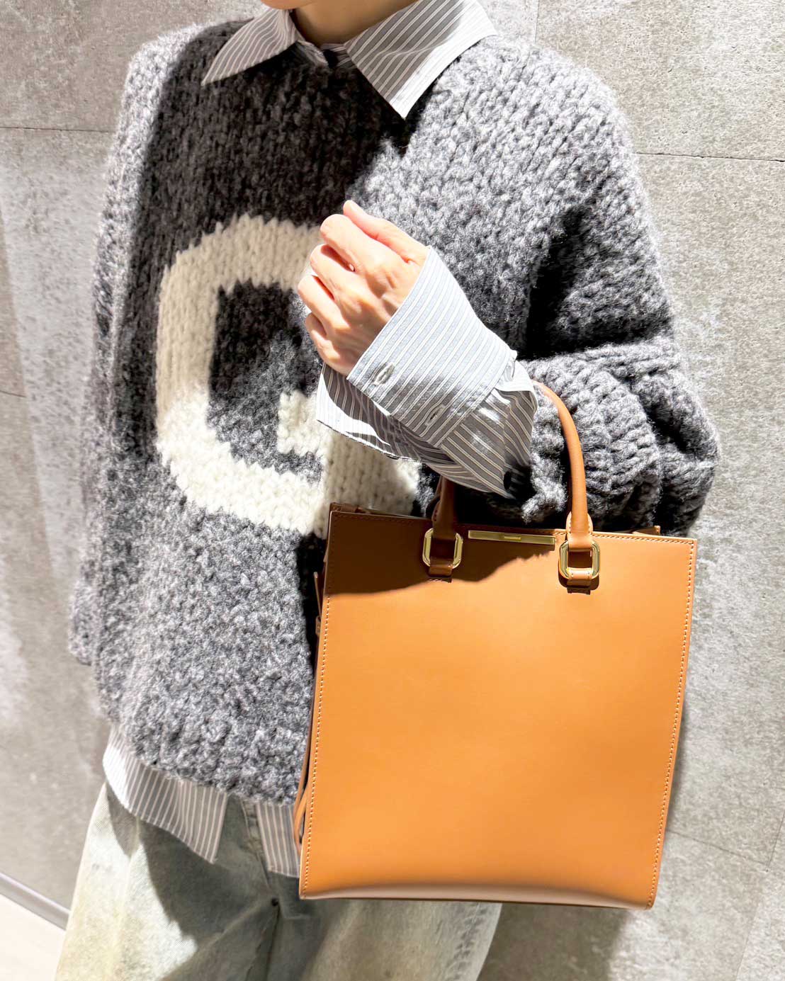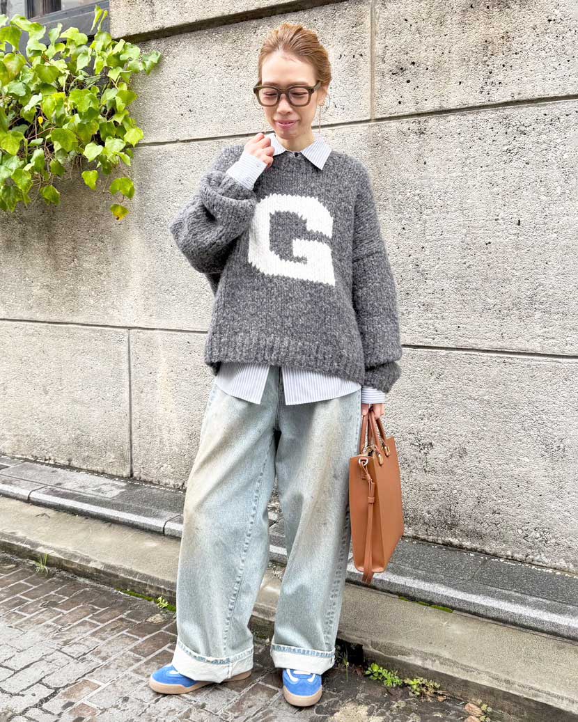 シャープなスクエアバッグに合わせ、メンズライクなデニムコーデ。『G』のロゴを中和するためシャツをインし、同色のブルースニーカーで全体をまとめました。