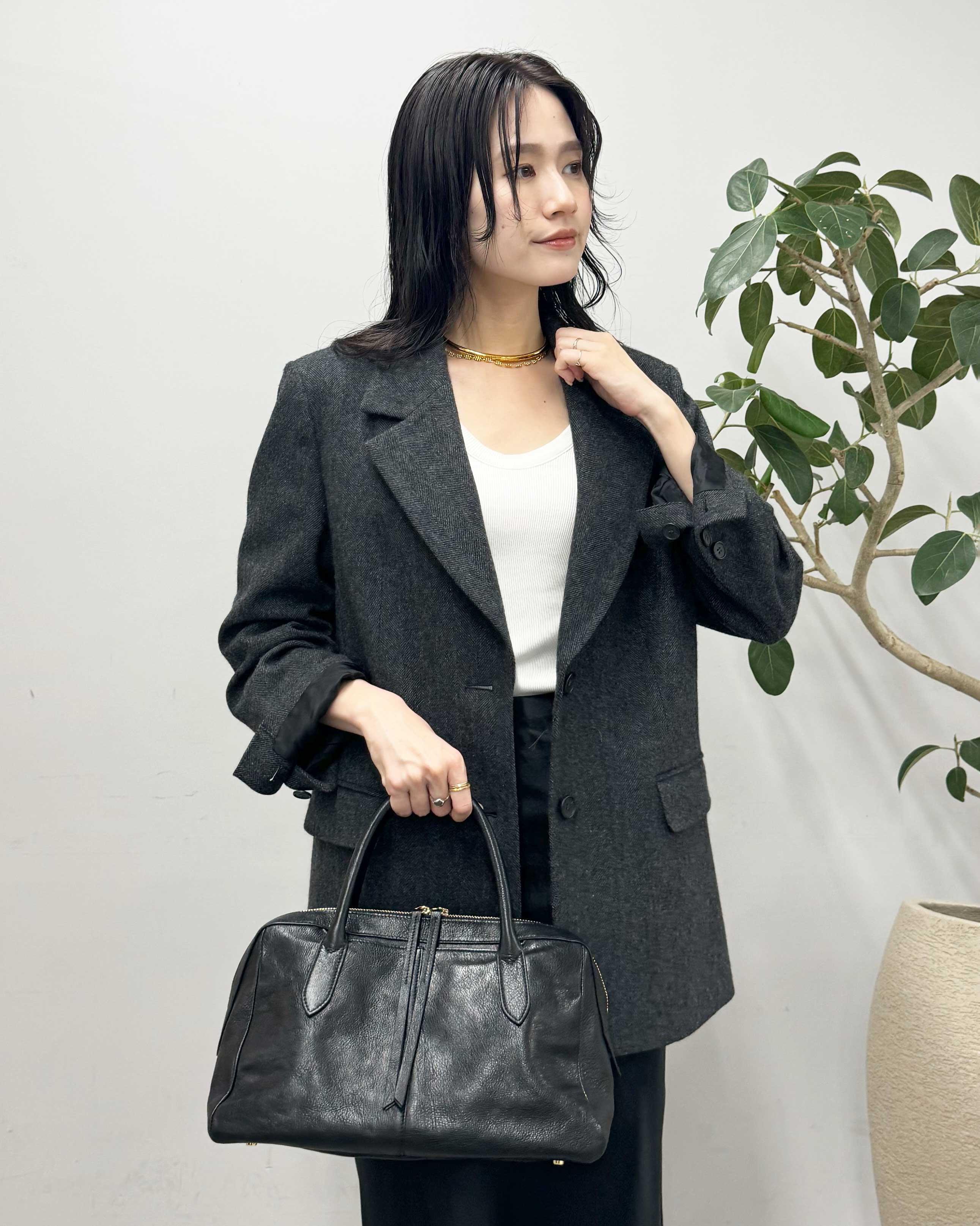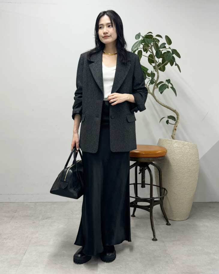 秋冬らしい温かみのあるジャケットを主役にしたモノトーンコーデ。マニッシュな印象のシングルジャケットに、あえてサテンスカートを合わせて女性らしさをプラスしました。