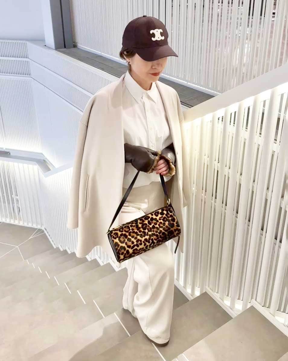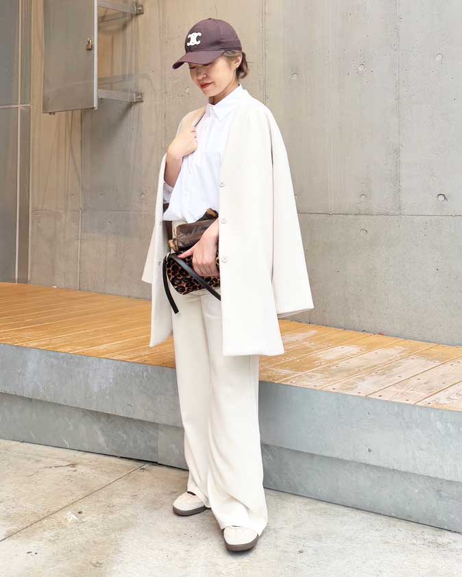 異素材のホワイトコーデに、レオパードバッグでアクセント。キャップとスニーカーでカジュアルさを加え、洗練された中に大人の遊び心を取り入れたカジュアルコーデです。