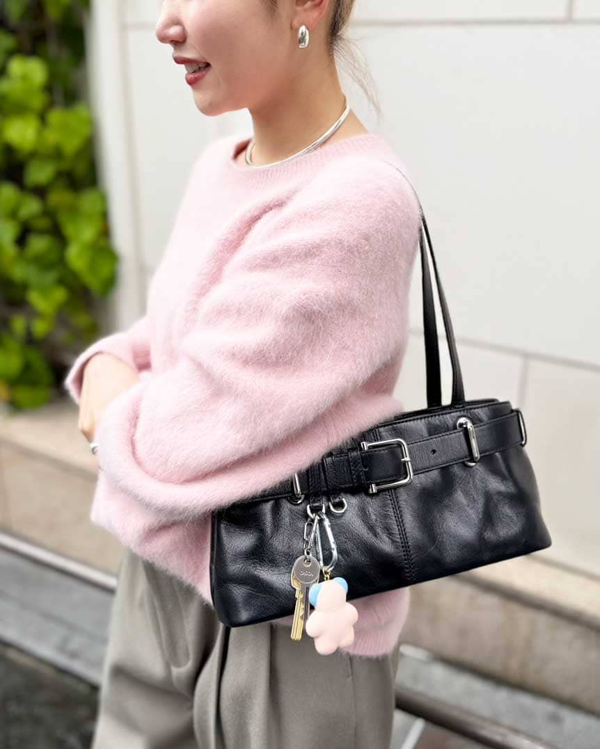 【OSOI】のショルダーバッグは、太めのベルトとキーチャームがポイント。程よい光沢のレザーがコーデにツヤを添えます。ヘアアレンジ用のシュシュやヘアピン、気分で使い分けるリップを常にバッグにイン。【AMUSE】の日焼けキティちゃんリップは特にお気に入りです。昔からピンクが大好きで、持ち物はついピンクアイテムばかり集めてしまいます。