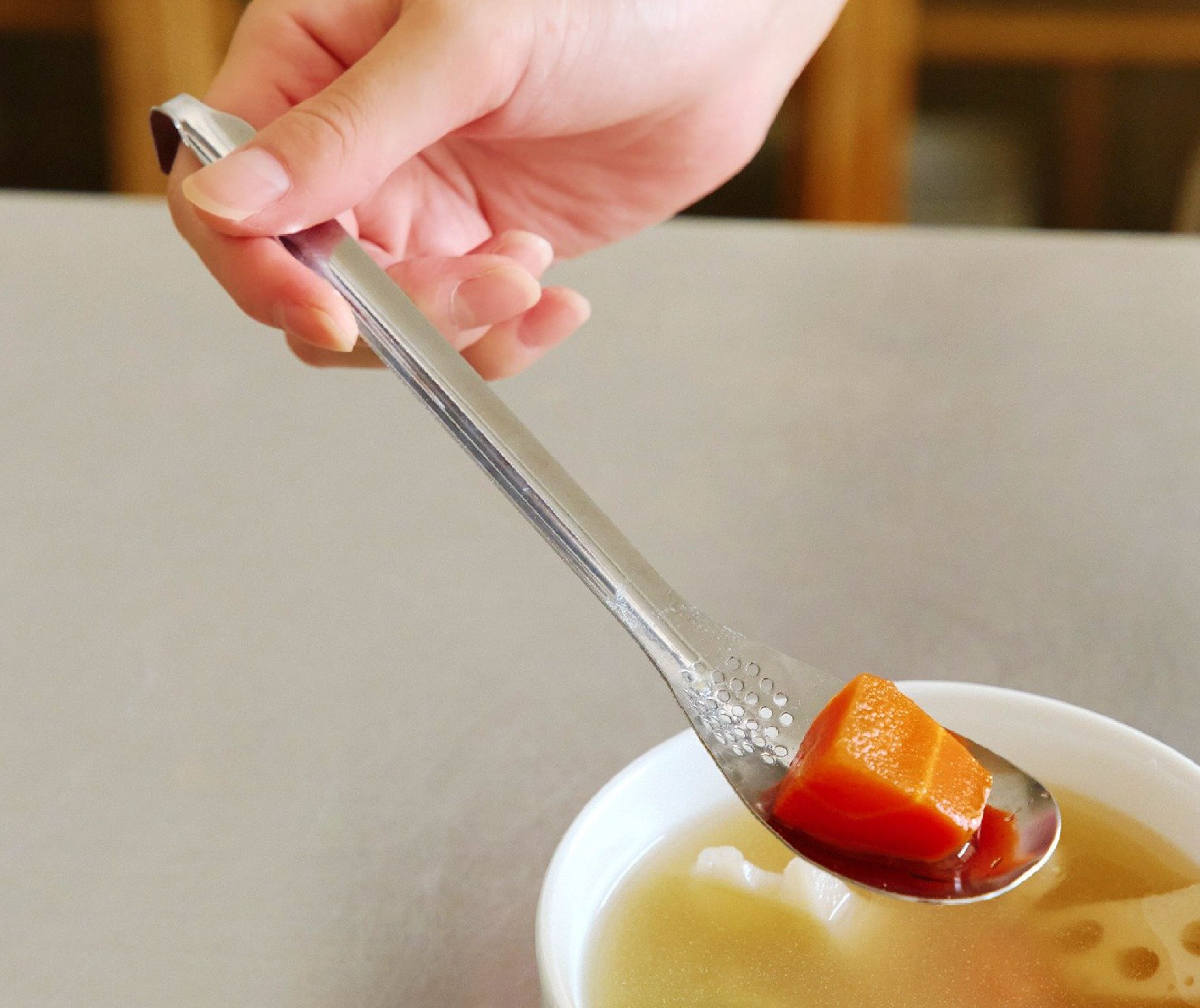 - 汁気がほど良く切れる穴付きのレンゲスプーン。麺類やスープ料理など様々な料理にお使いいただけます。
