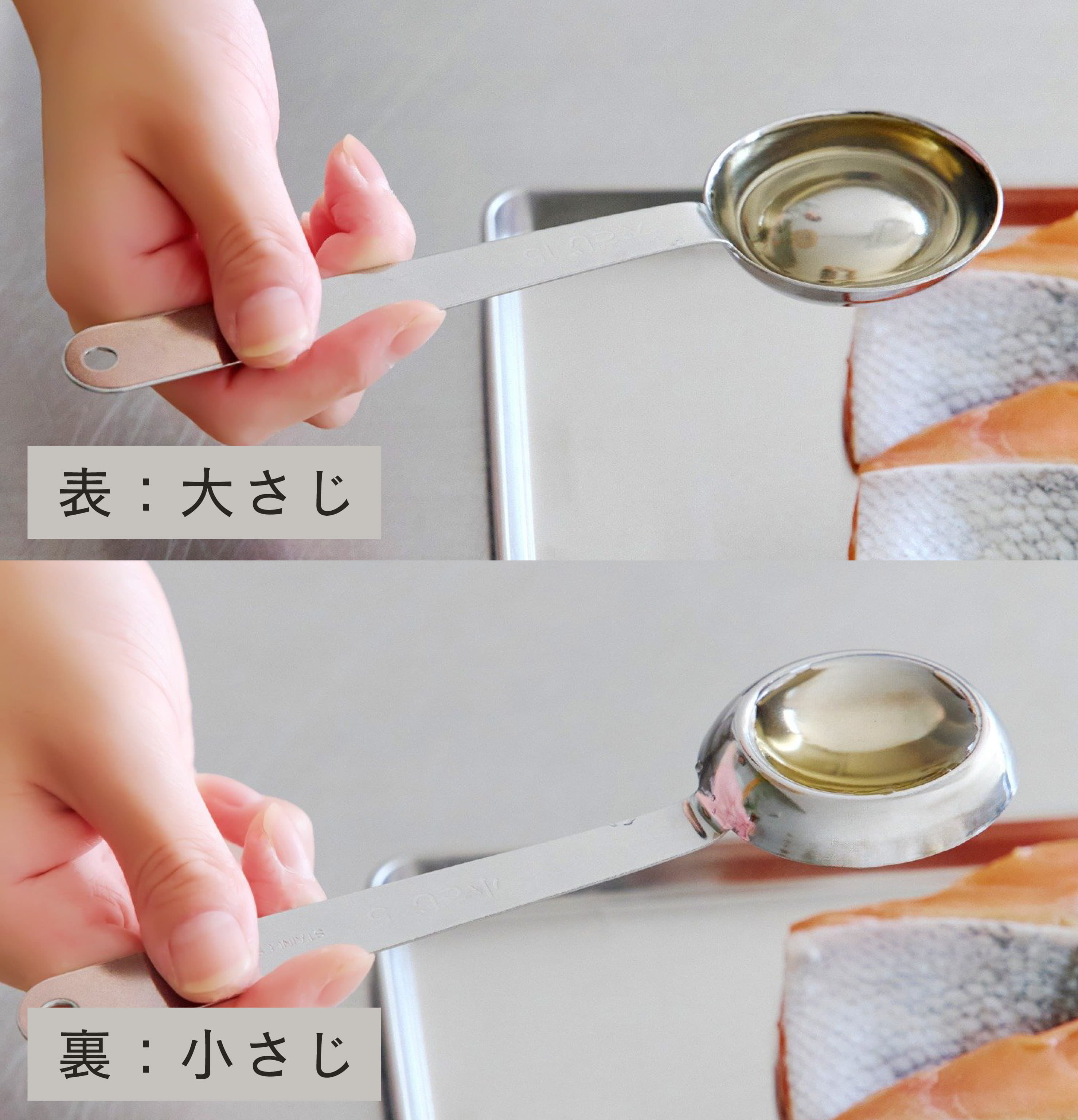 - 両面で大さじ・小さじが量れる計量スプーン。これ1本で2サイズ分使い分けれるので、洗い物を減らすことが出来ます。
