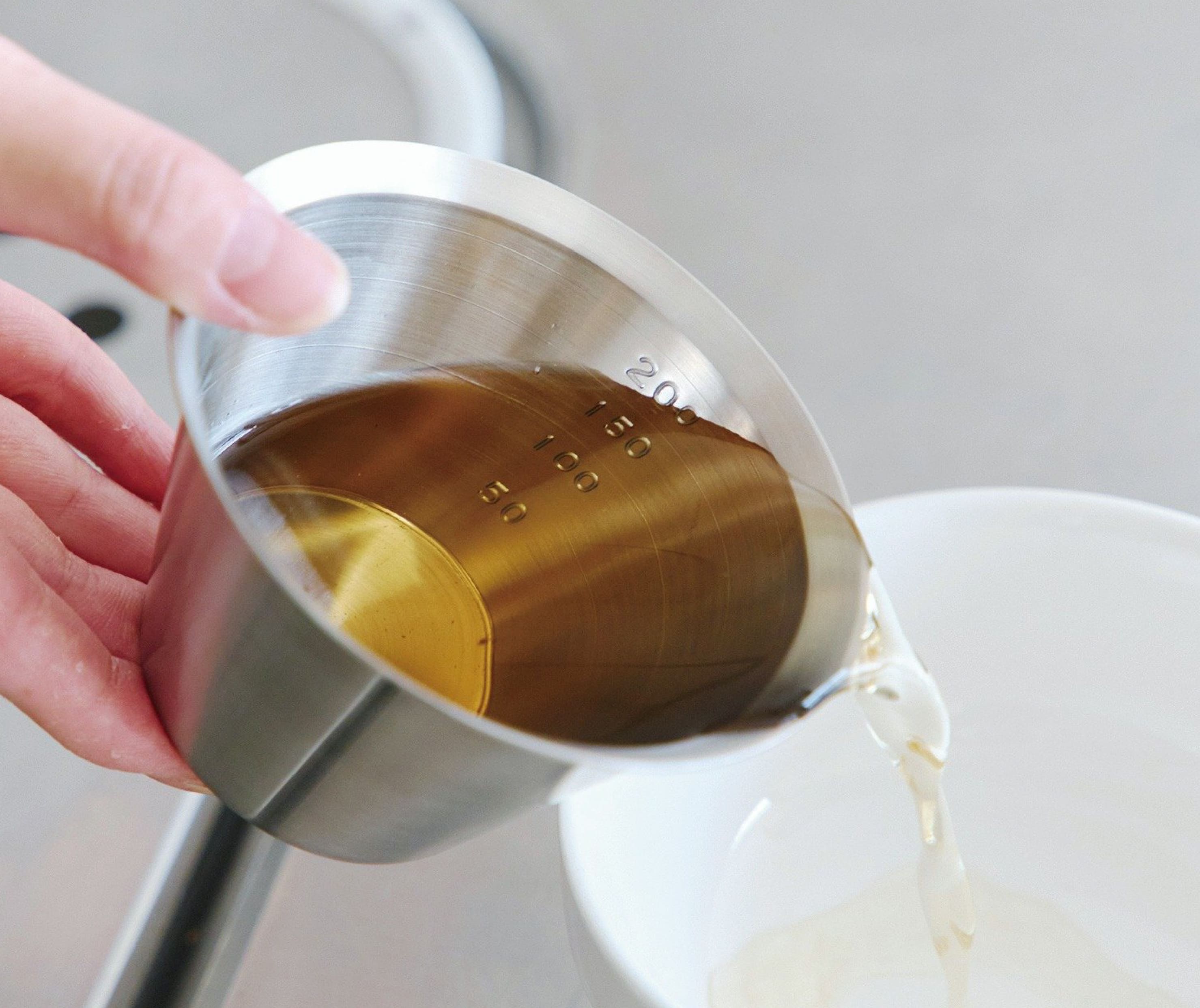 - 360度どこからでも綺麗に注げるように設計された計量カップ。メモリの線が1周入っているので計量しやすくて便利です。